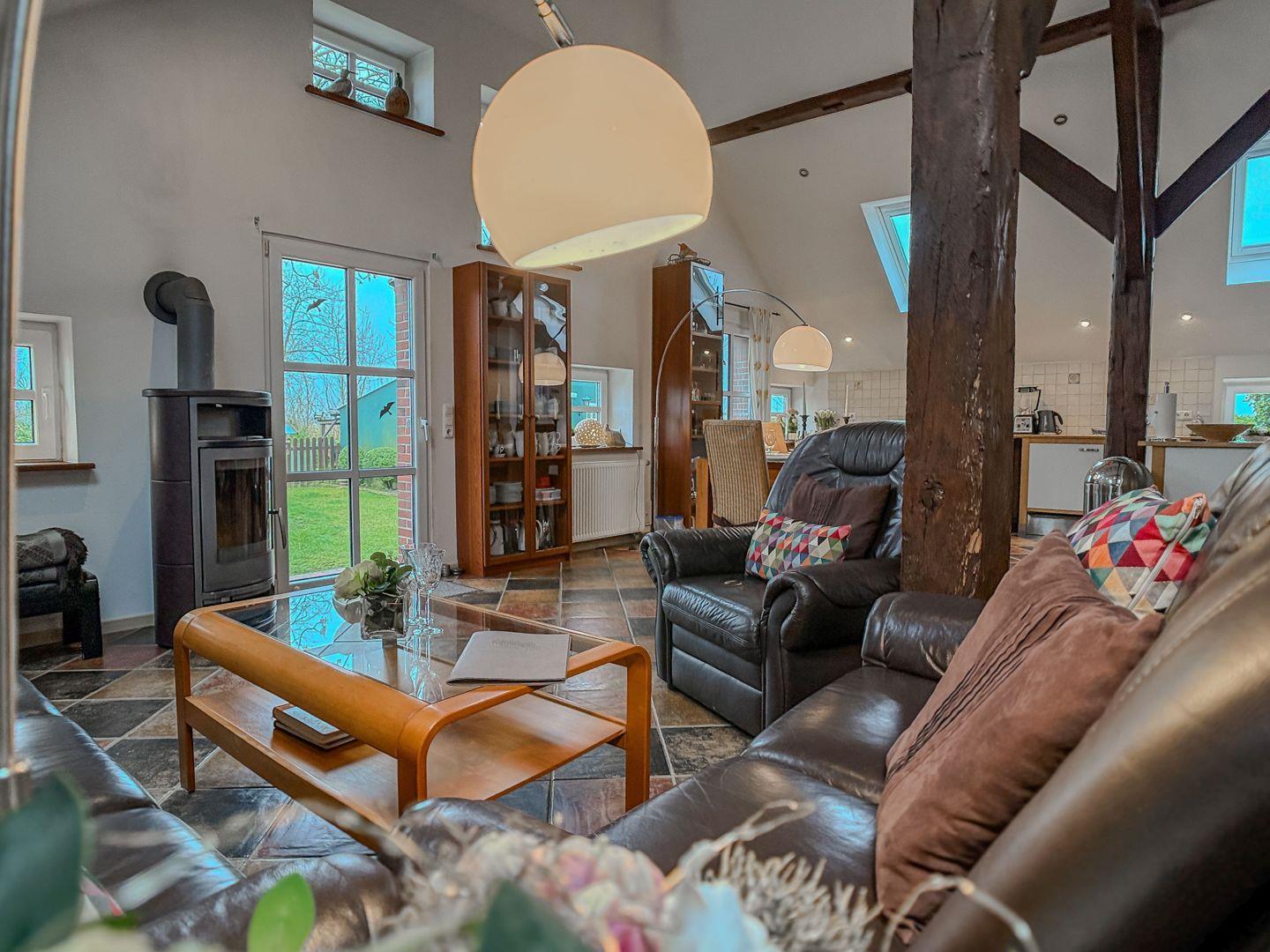 Der bis unters Dach offene, großzügige Wohnbereich mit wunderschön gearbeitetem altem Gebälk, verfügt über eine moderne Küchenzeile inkl. Ofen, Herd und Mikrowelle.