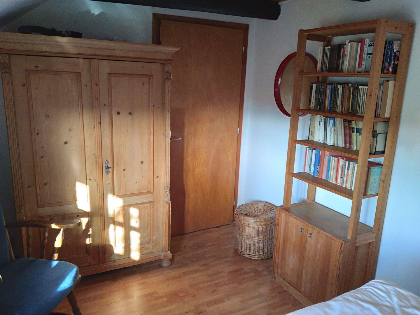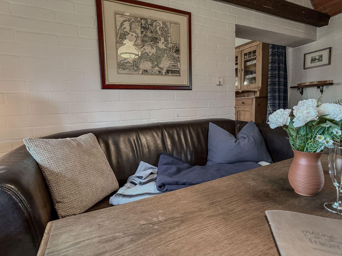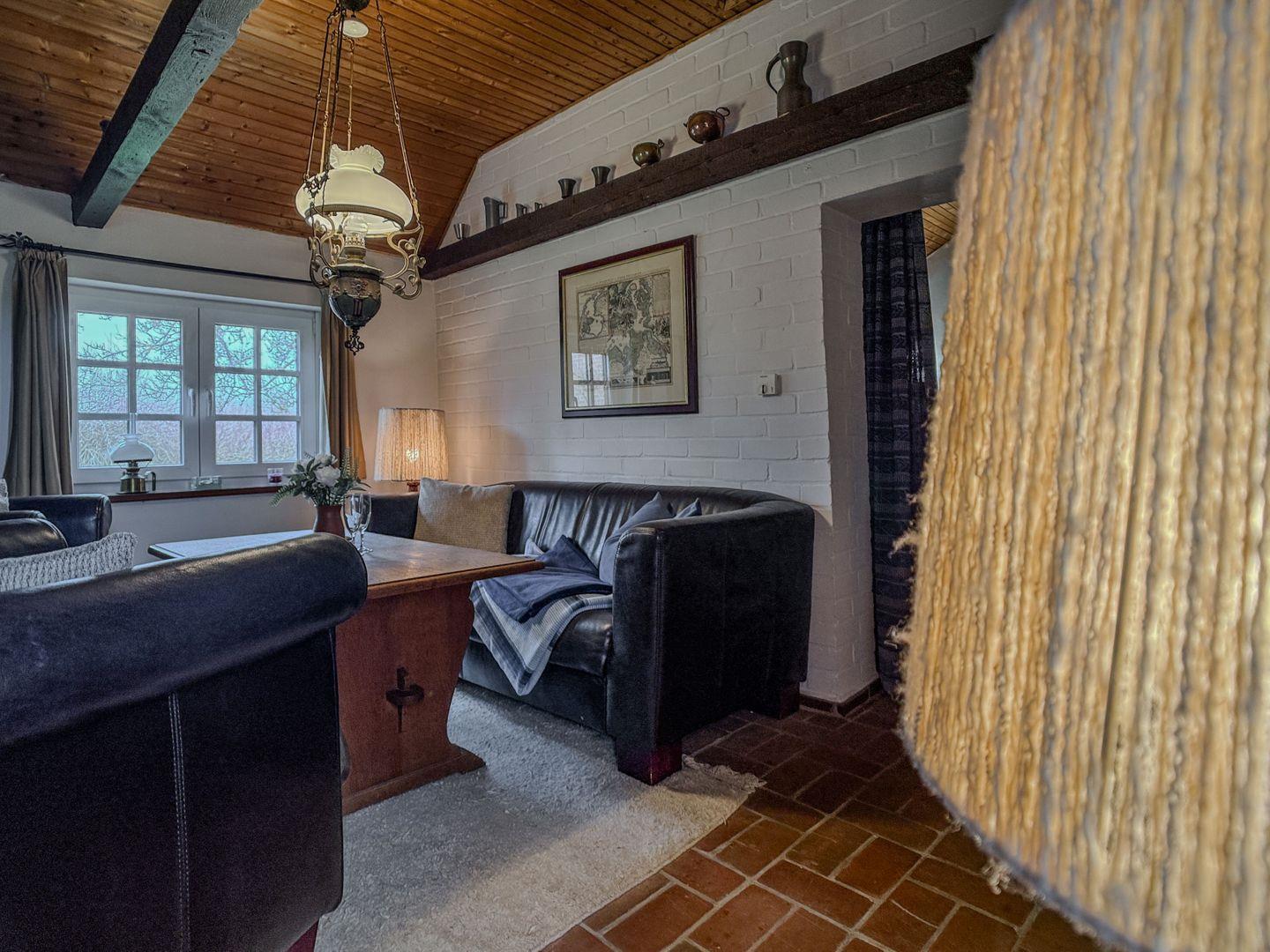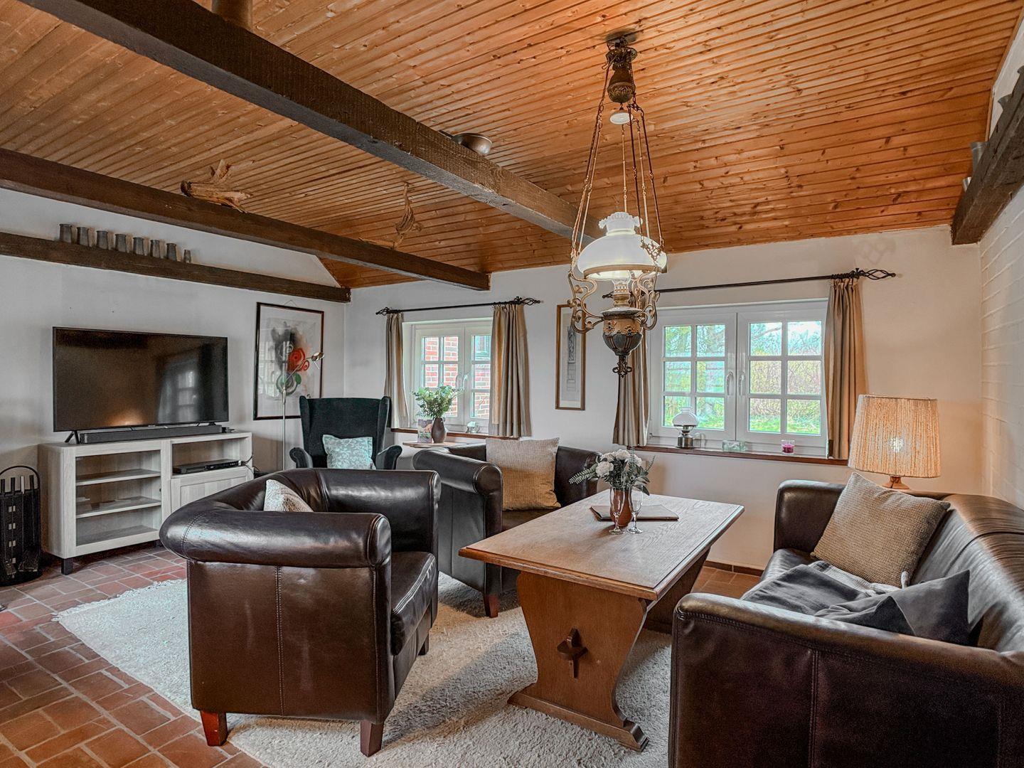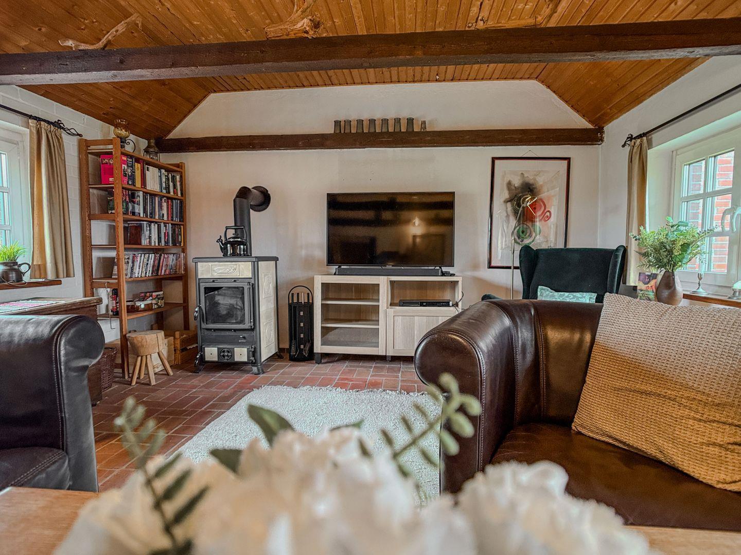 Zur charmanten Ausstattung des Wohnzimmers gehören neben gemütlichem Sessel und Sofa, ein kleiner Flachbildfernseher (DVB-S/Satellit), DVD-Player, Stereoanlage mit CD Spieler. Bücher zum Schmökern liegen ebenfalls bereit.
