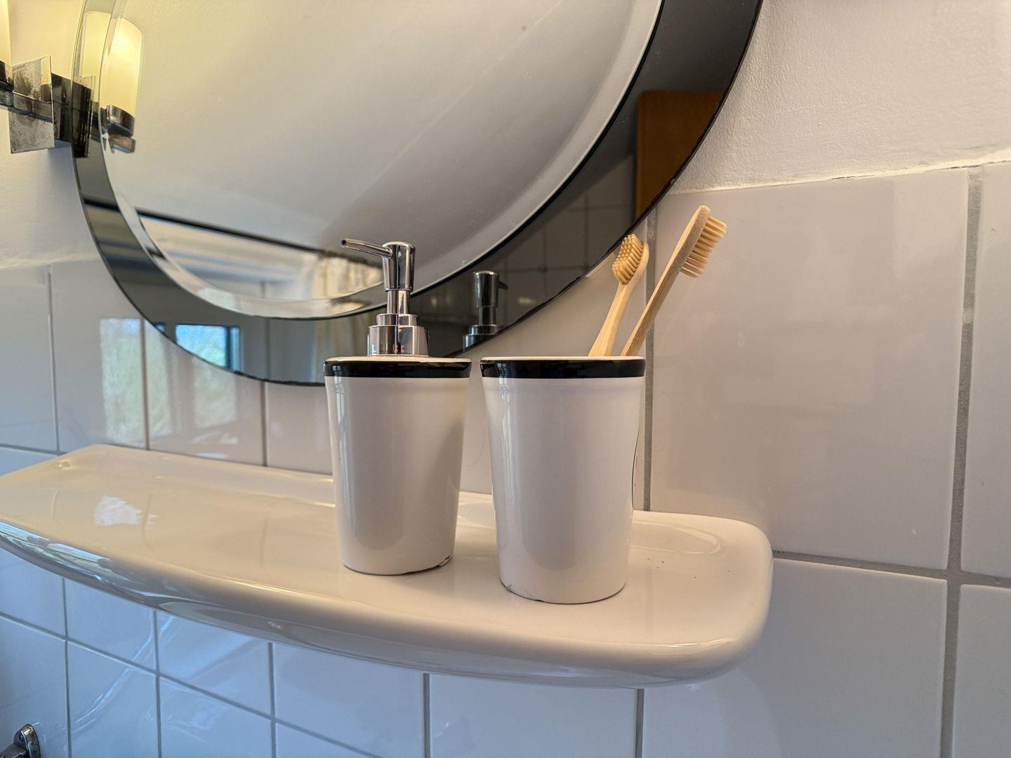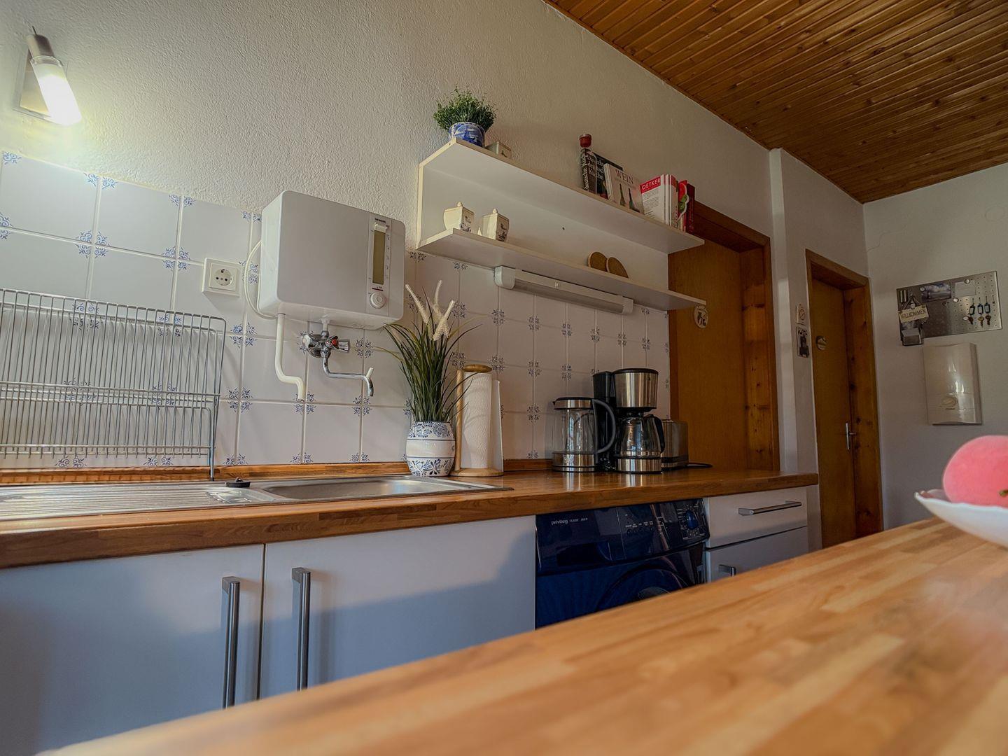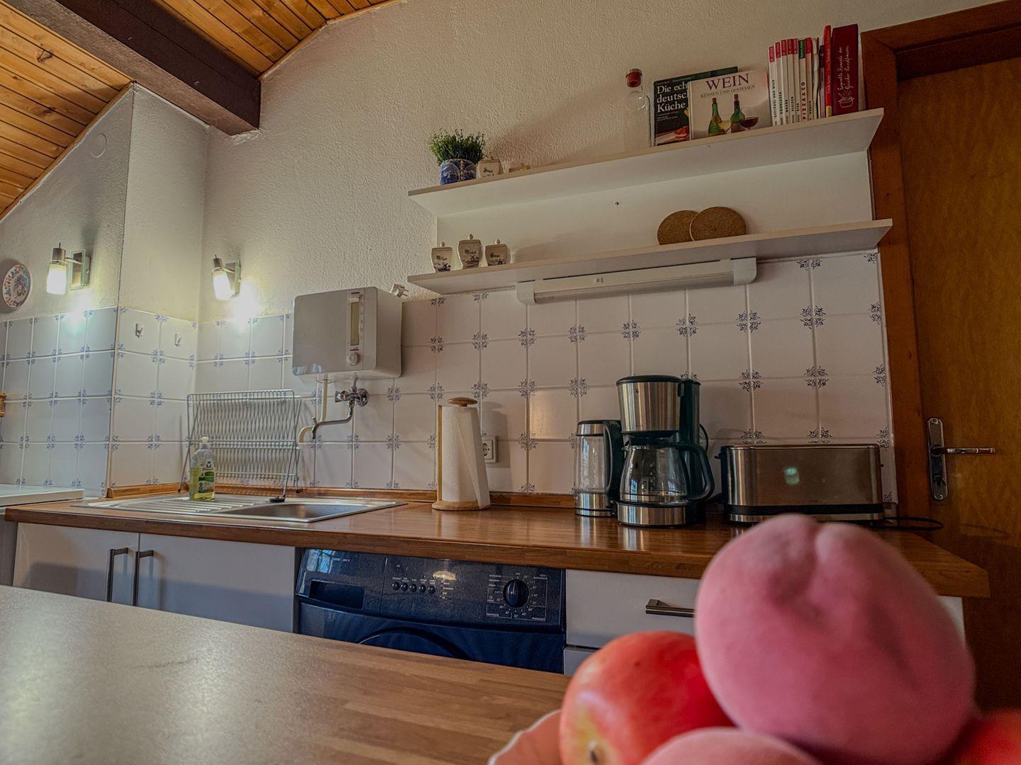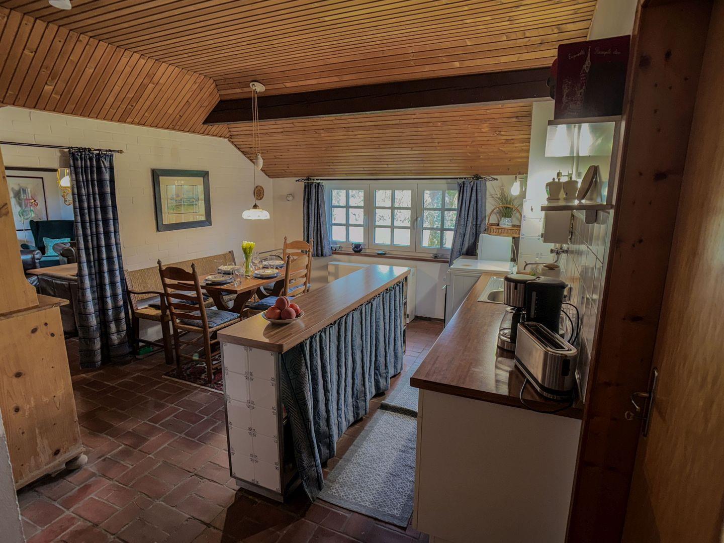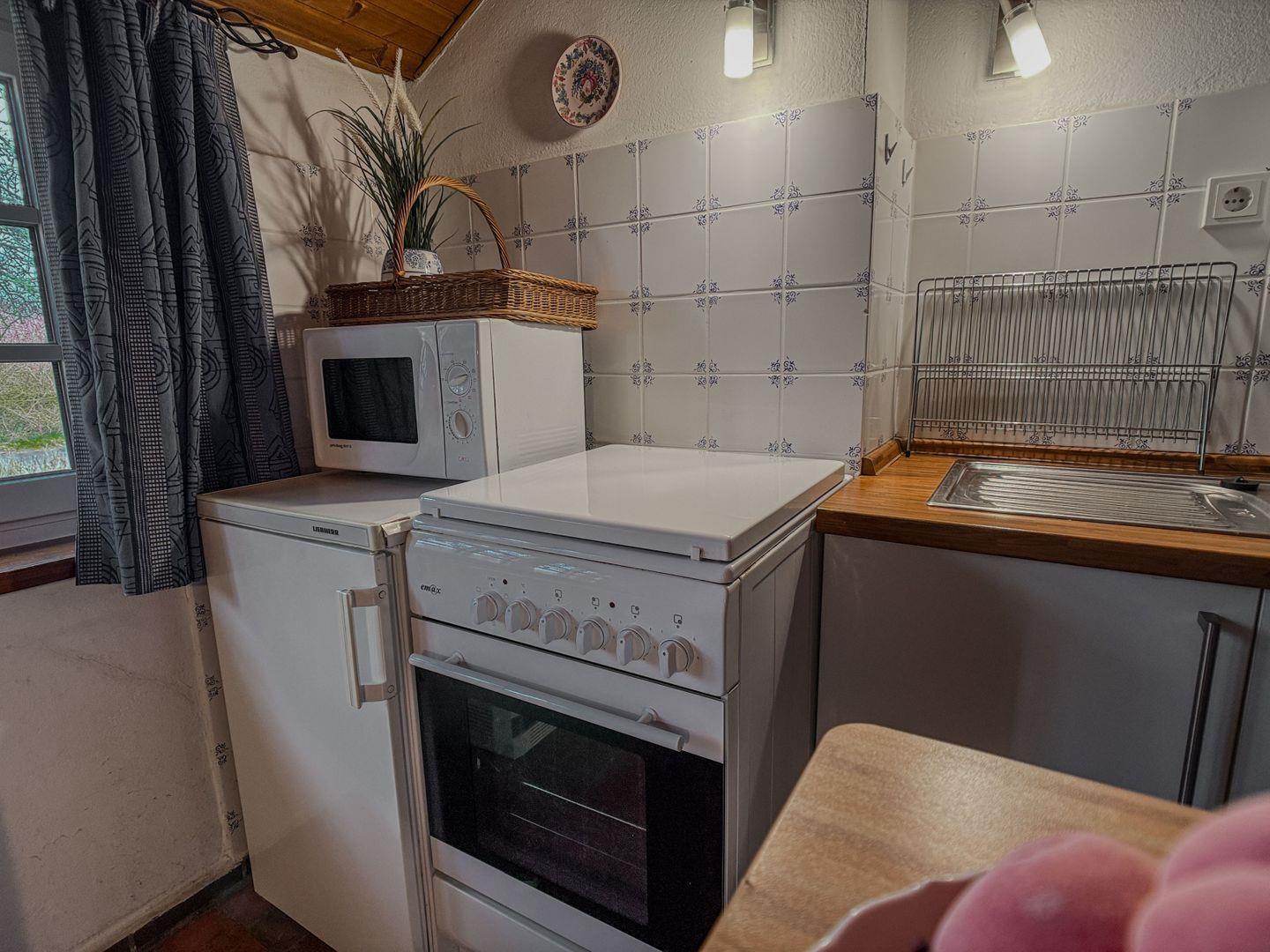 In der Küche stehen E-Herd, Kühlschrank, Mikrowelle, Toaster, Kaffeemaschine und Wasserkocher bereit. Für die Terrasse sind Gartenmöbel im Abstellraum vorhanden. Auf dem Grundstück kann geparkt werden.