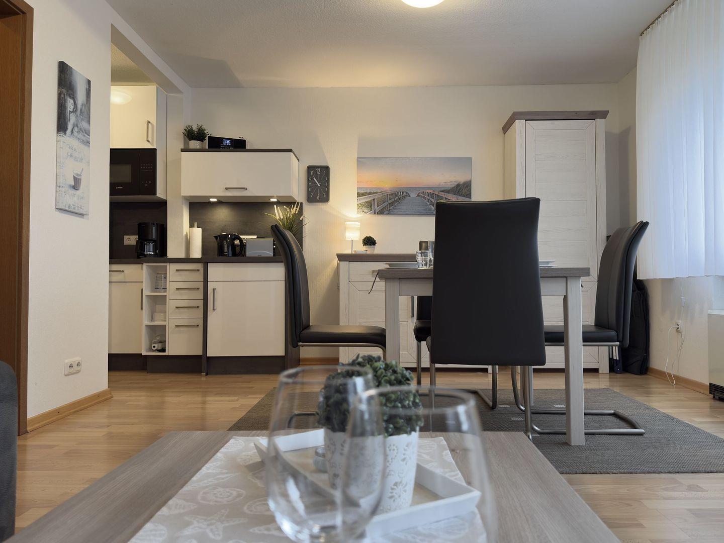 Diese kleine gemütliche Ferienwohnung in einer sehr ruhigen Sackgassenlage liegt im ersten Stock und ist frisch renoviert. Sie ist ausgestattet mit einer Wohn-Küche, einem Zwei-Bett-Zimmer, einem Flur, Dusche/WC und einem Balkon. Ein Flachbildschirm und kostenloses W-Lan sind selbstverständlich. Die neue schicke Küche ist sehr gut bestückt, unter anderem mit Mikrowelle und Kühlschrank mit einem Gefrierfach. Diese Ferienwohnung liegt in eine Sackgassenlage: Absolut ruhig und dennoch in sehr wenigen Gehminuten ist man im Zentrum vom Dorf Horumersiel.