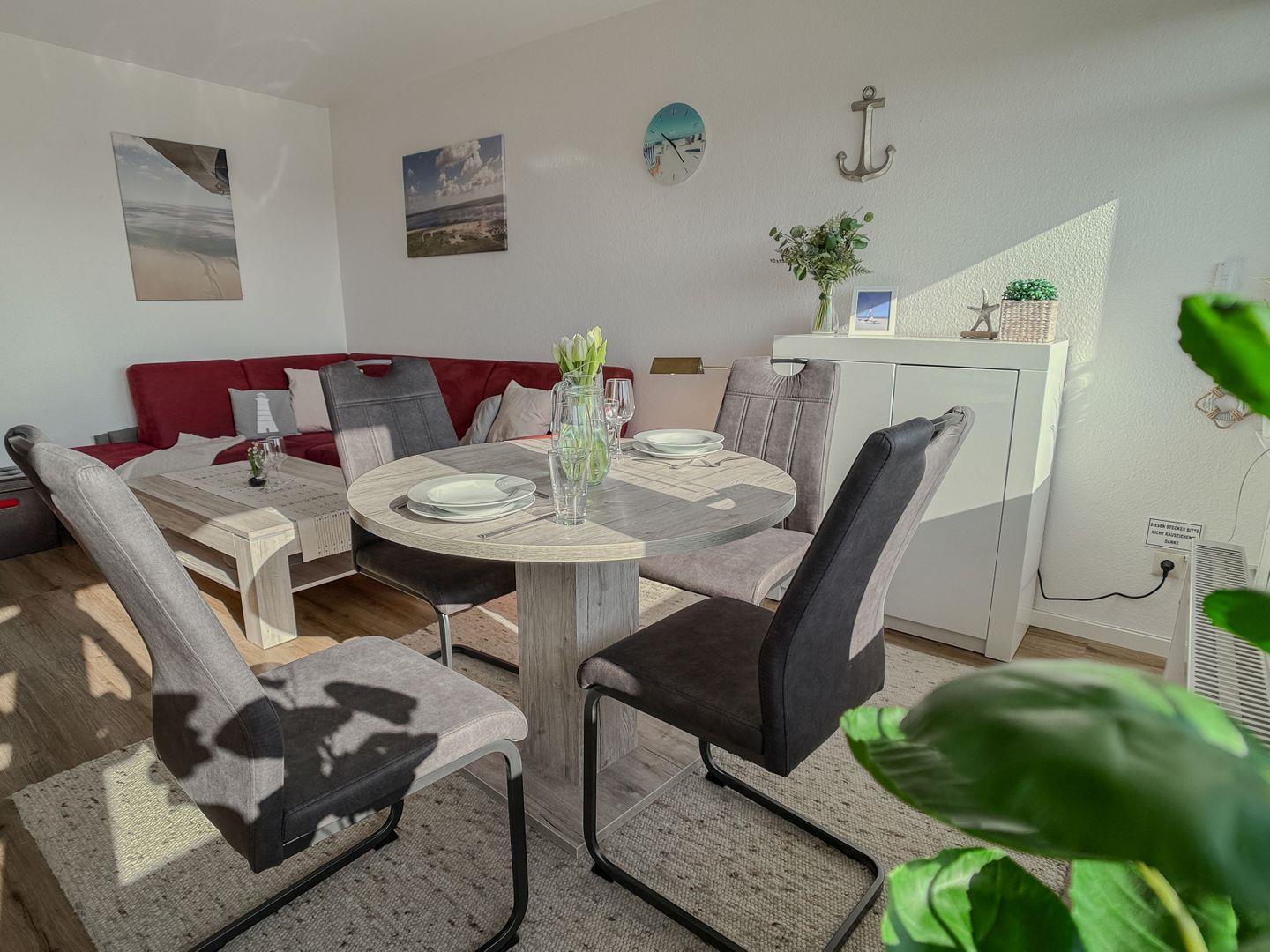 Das helle, lichtdurchflutete Wohn-Esszimmer empfängt Sie mit gemütlicher Sofaecke und stilvollem Essbereich – perfekt für entspannte Abende nach einem Tag am Meer.