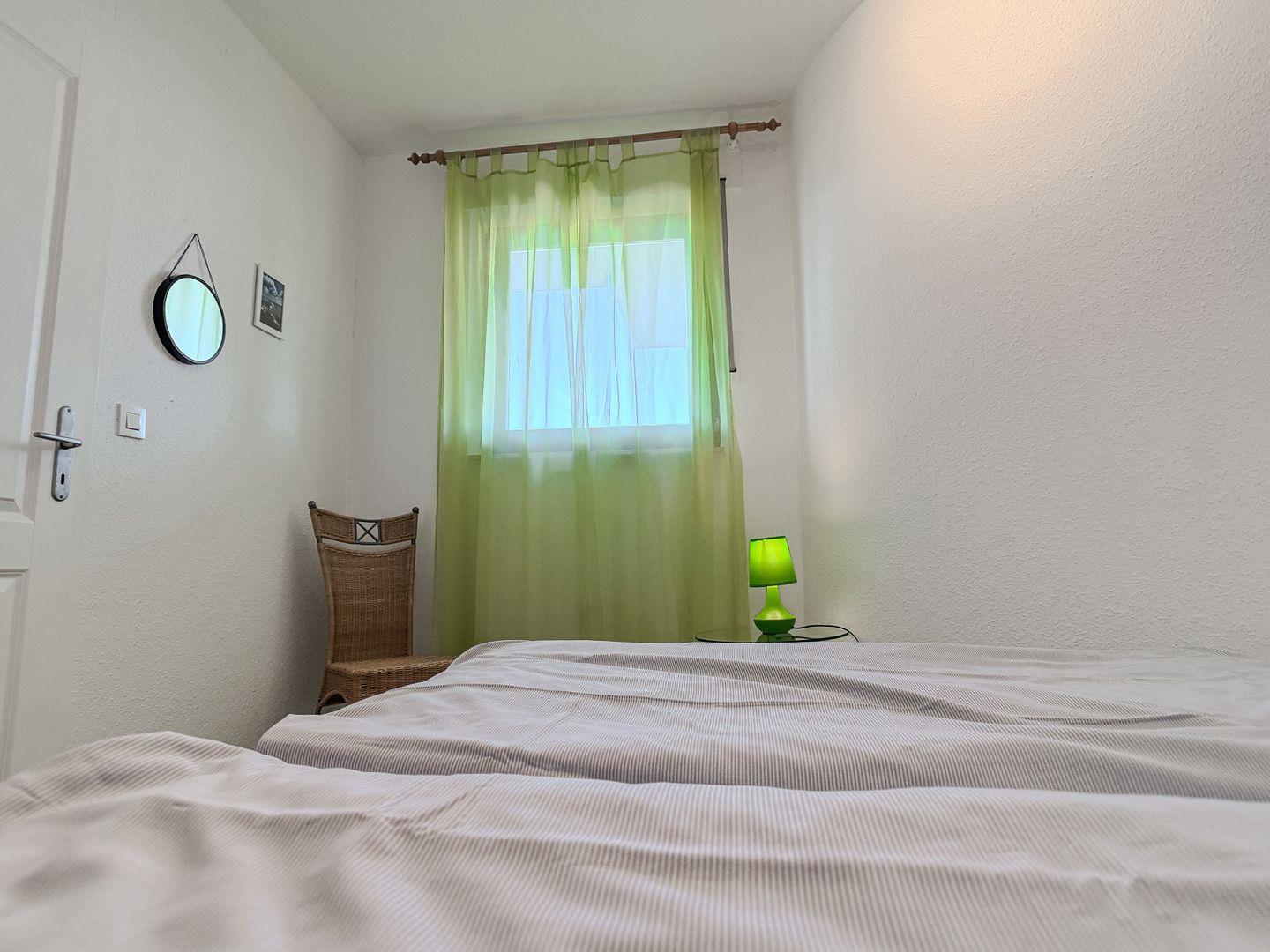 Das separate Schlafzimmer mit komfortablem Doppelbett verspricht erholsame Nächte, während ein modernes Schrankbett im Wohnzimmer eine zusätzliche Schlafgelegenheit bietet.
