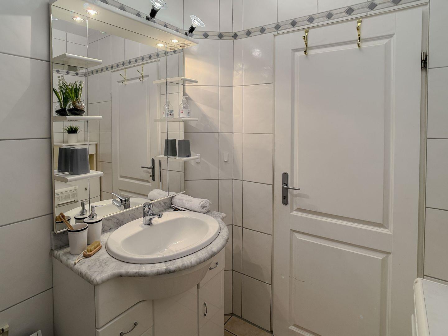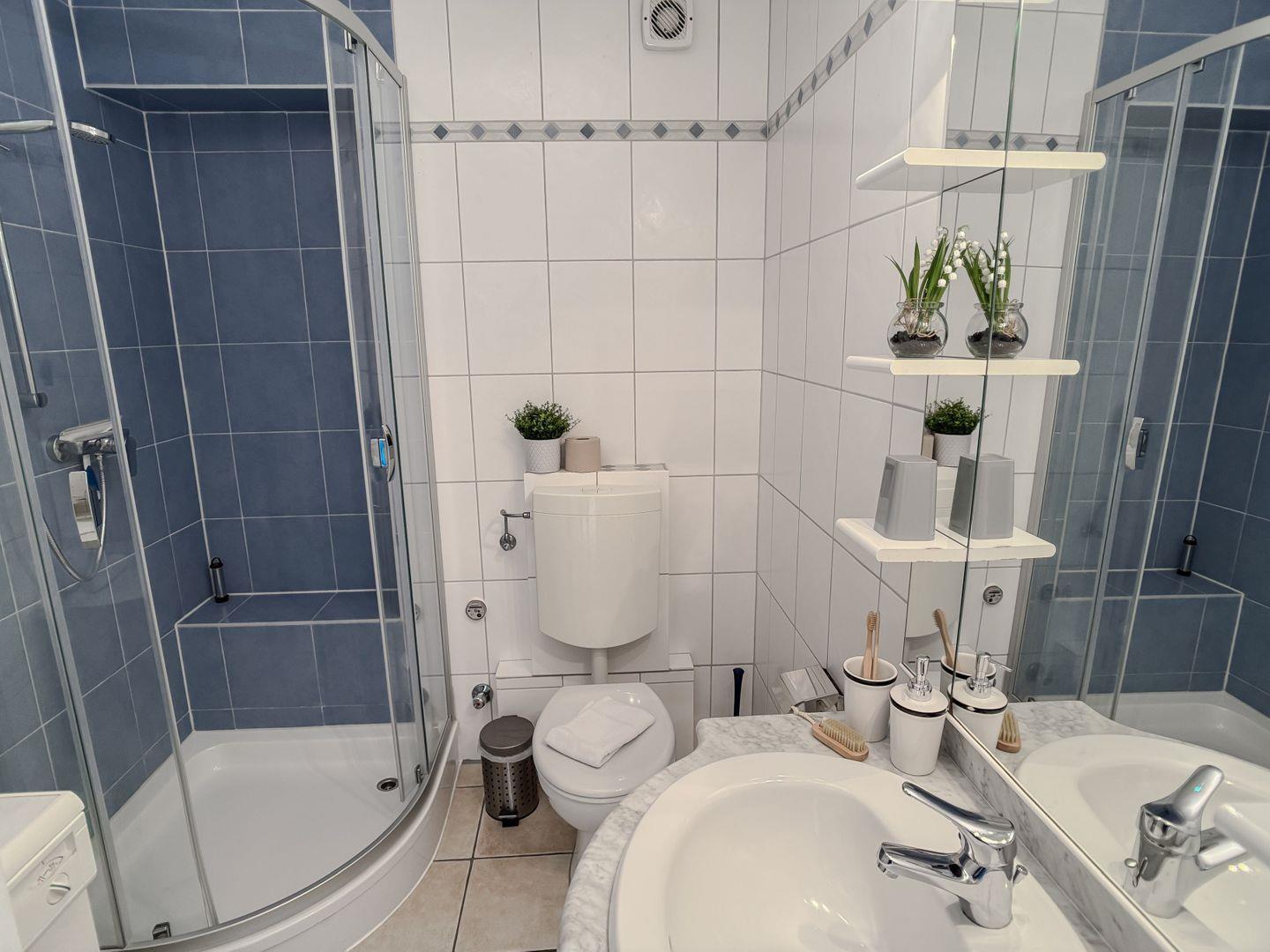 Das freundlich gestaltete Badezimmer ist hell gefliest und verfügt über eine praktische Dusche sowie einen großen Spiegel – auch eine Waschmaschine steht Ihnen für die Dauer Ihres Aufenthalts zur Verfügung.