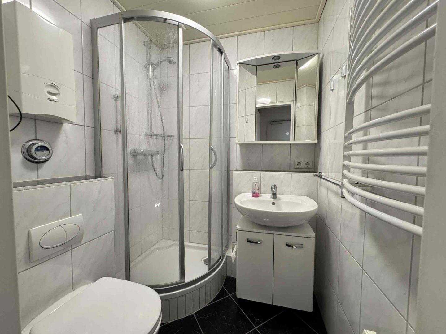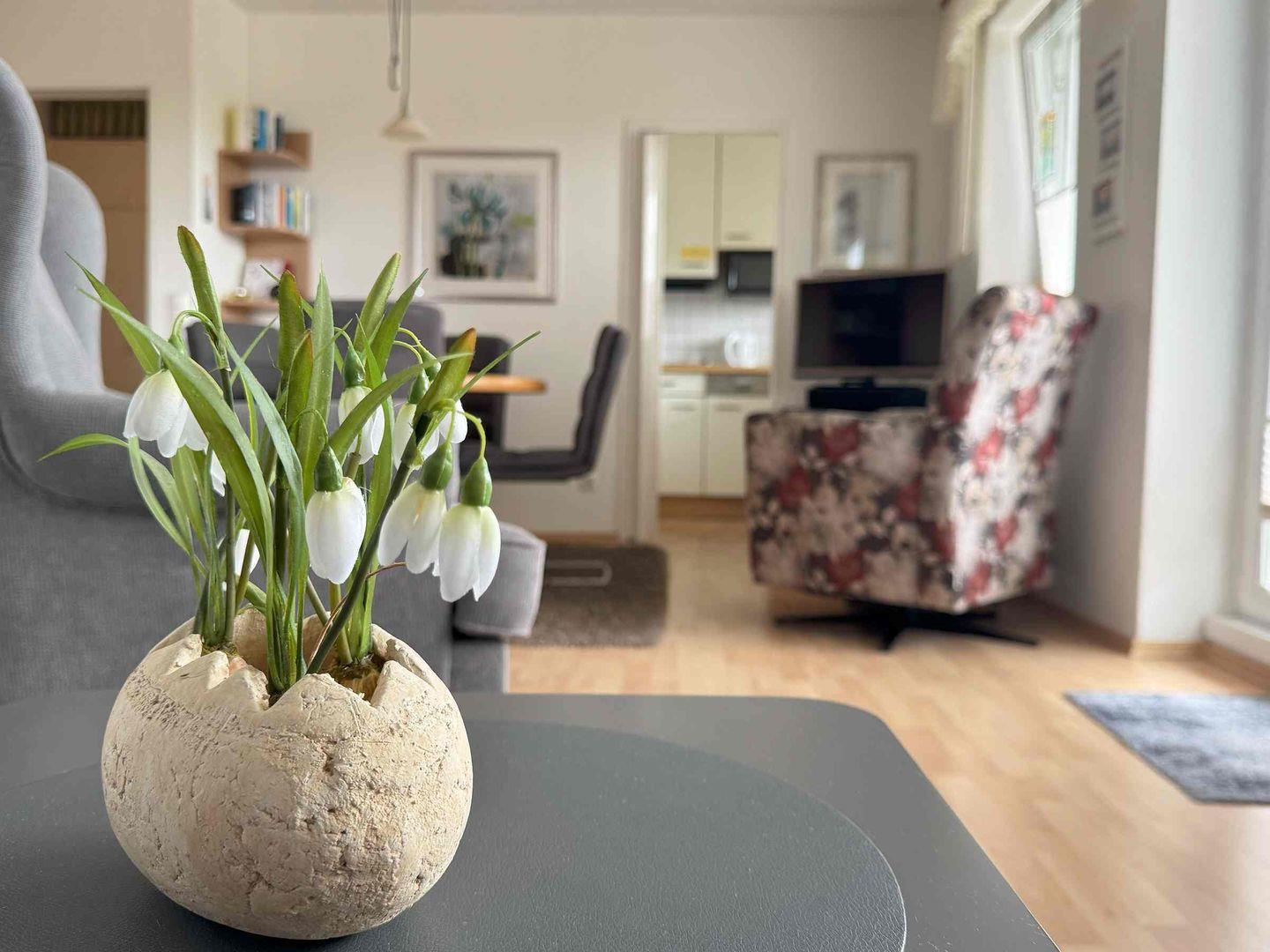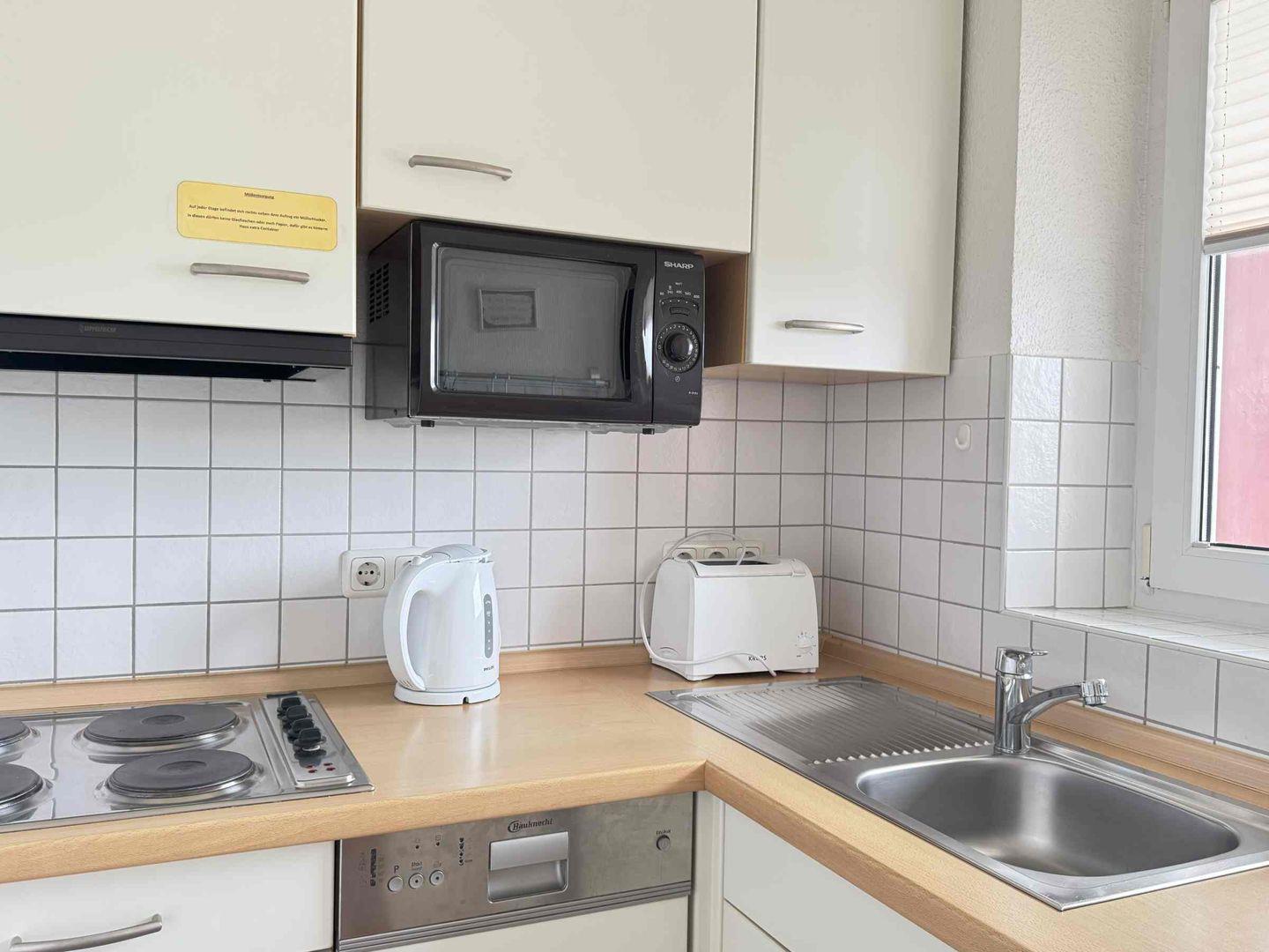 Diese helle und gemütlich eingerichtete Wohnung mit einem Schlafzimmer für 2-3Personen befindet sich in der zweiten Etage. Die Küche ist mit Spülmaschine, Plattenherd, Mikrowelle, Wasserkocher, Eierkocher und Toaster ausgestattet.