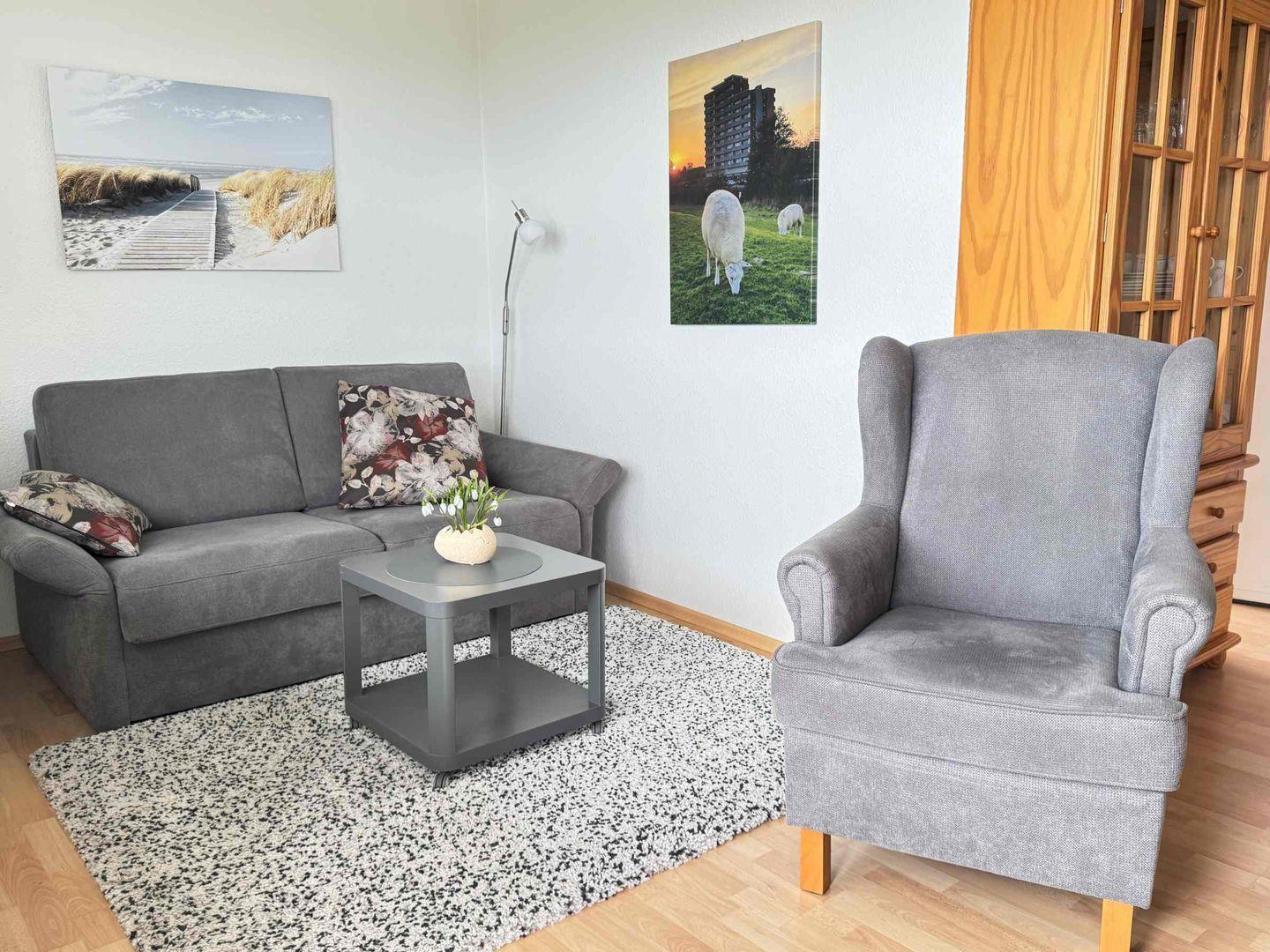 Im Wohnzimmer befindet sich eine neue Schlafcouch, 2 neue Sessel, Flachbild-TV, CD-Radio, viele Bücher und Gesellschaftsspiele.