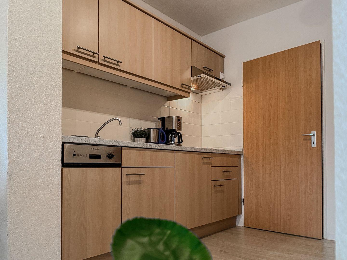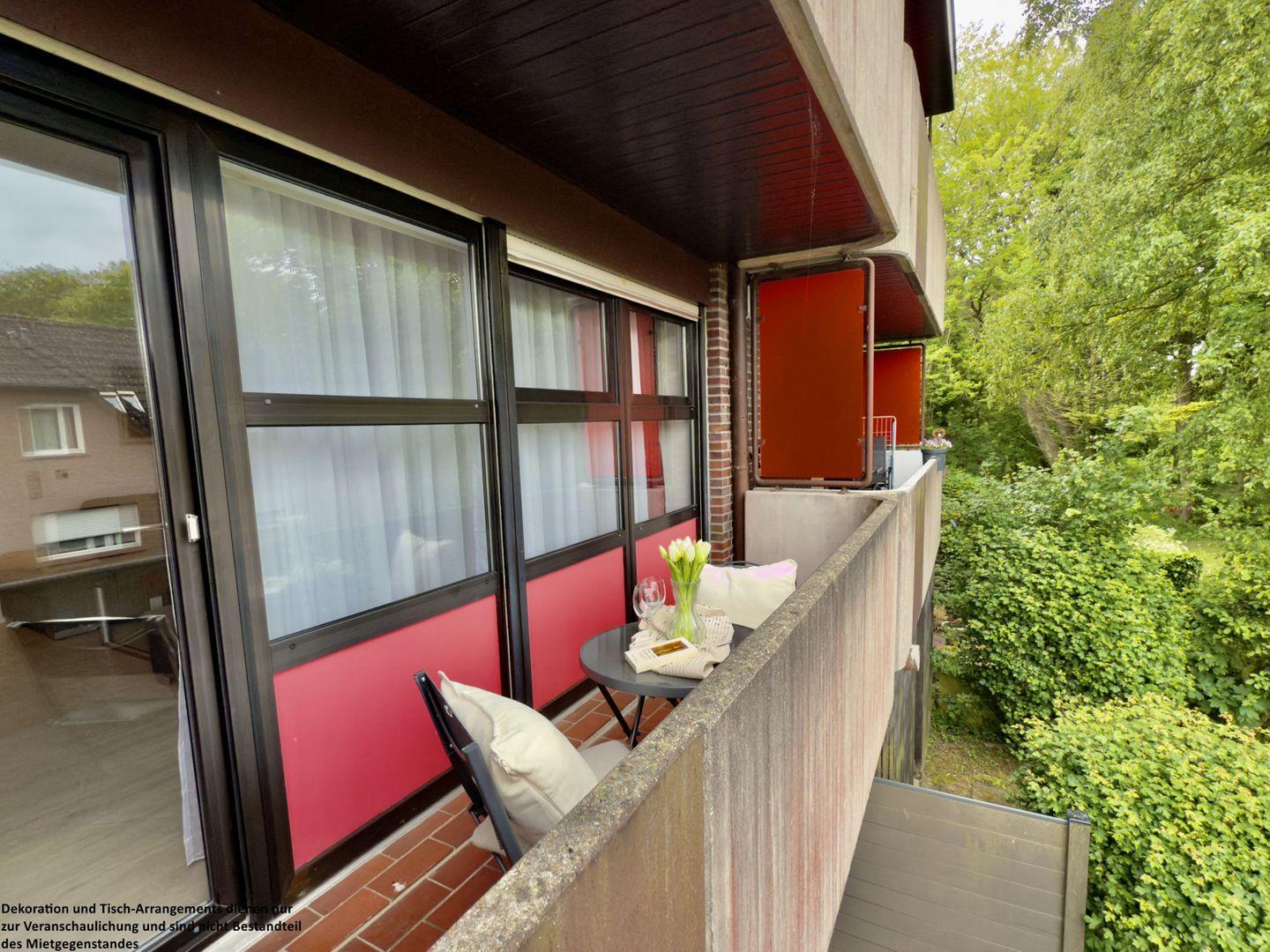 Mit einem Schlafzimmer für 2 Personen, einem Flur mit großem Kleiderschrank und einer offenen Küche zum Wohnzimmer mit großer Fensterfront bietet die Wohnung ausreichend Platz. Entspannen Sie auf dem Balkon mit Blick ins Grüne.