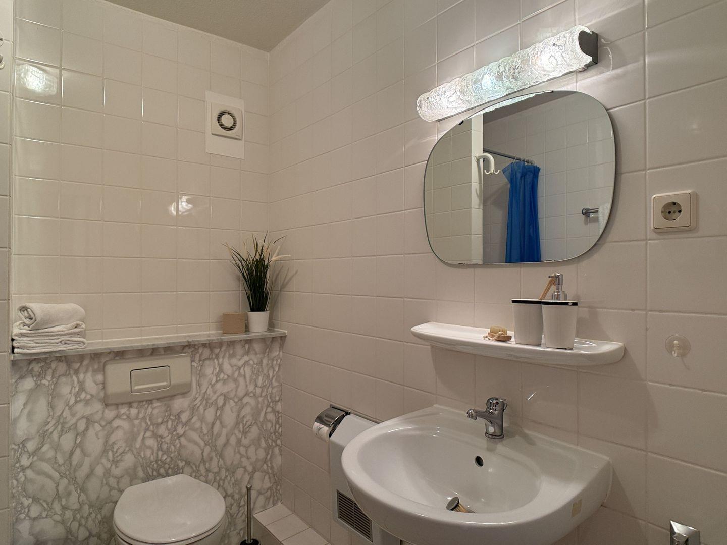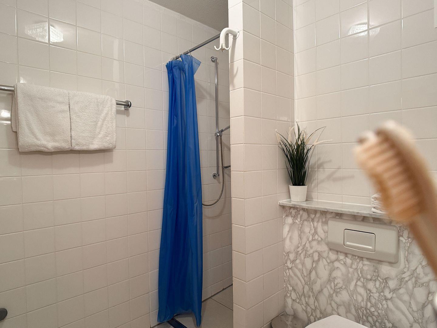 Das geräumige Badezimmer ist mit einer bodengleichen Dusche mit Duschvorhang ausgestattet, die für eine angenehme Erfrischung sorgt. Ein großer Spiegel runden das Badezimmer ab.