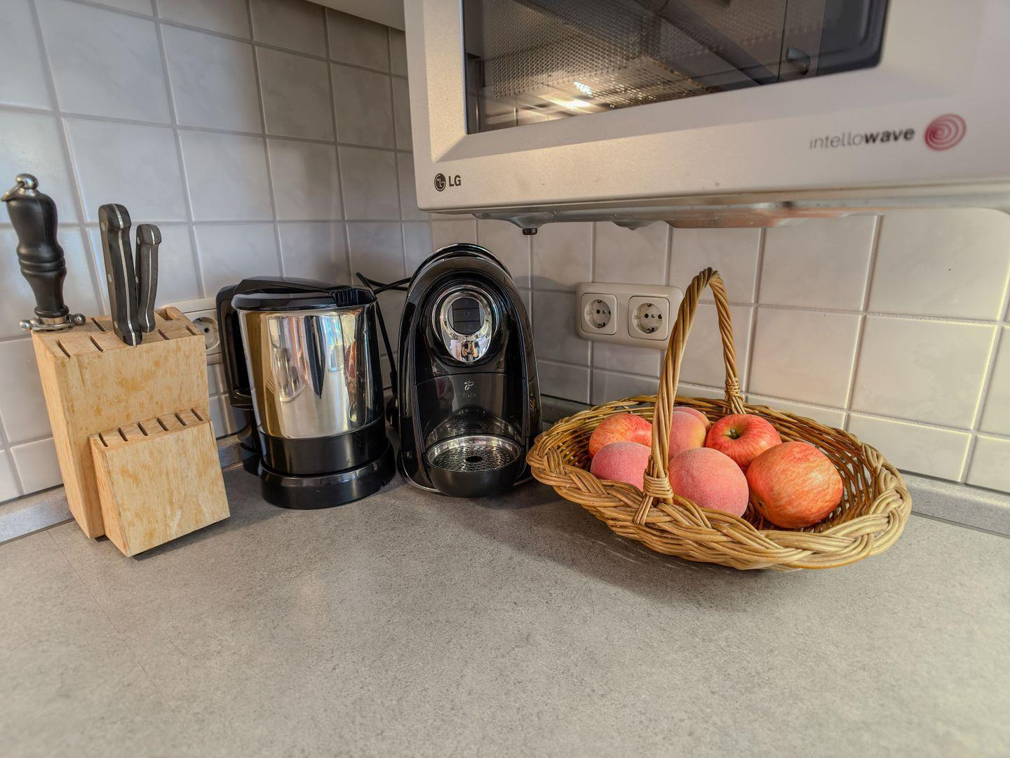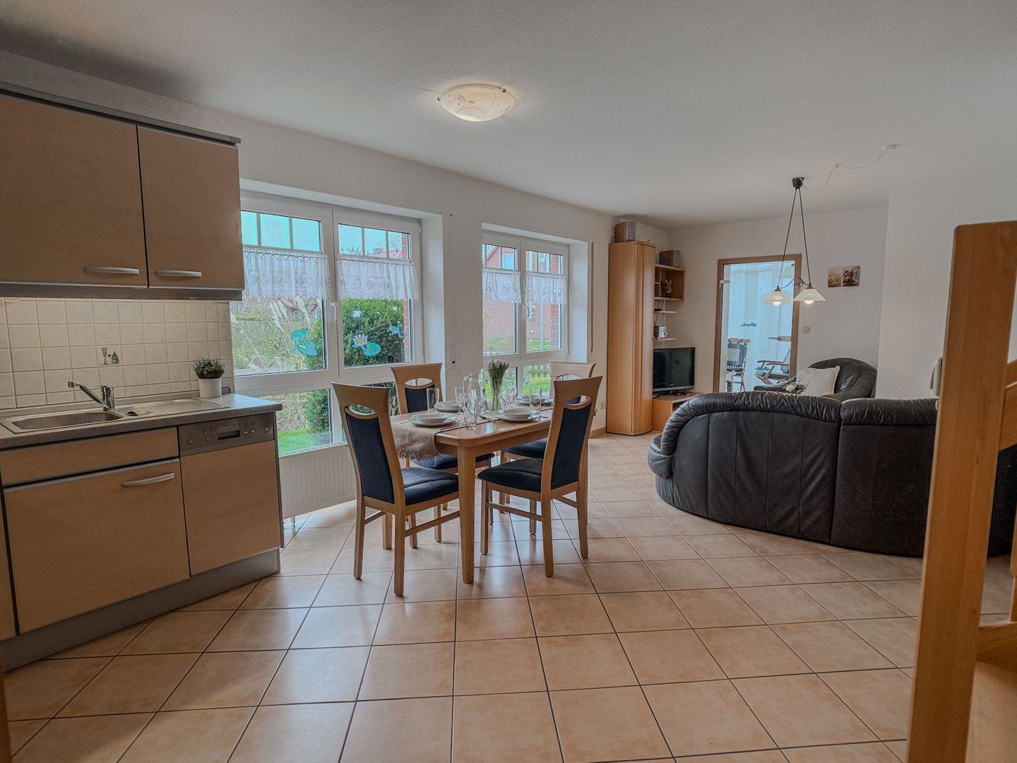 Die großzügige, offene Küche im Wohnzimmer bietet alle Annehmlichkeiten, die Sie für die Selbstversorgung benötigen. Die angrenzende Essecke ist der perfekte Ort, um Ihre Mahlzeiten gemeinsam zu genießen. Das bequeme Ecksofa und der Sessel laden zu entspannten Abenden vor dem Fernseher ein.