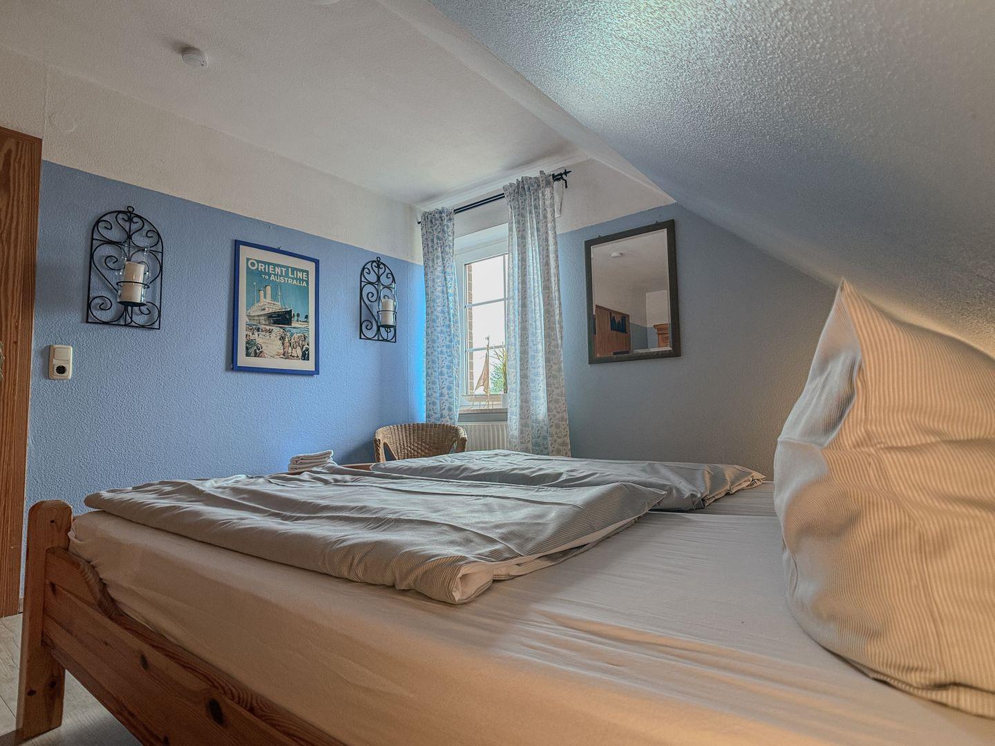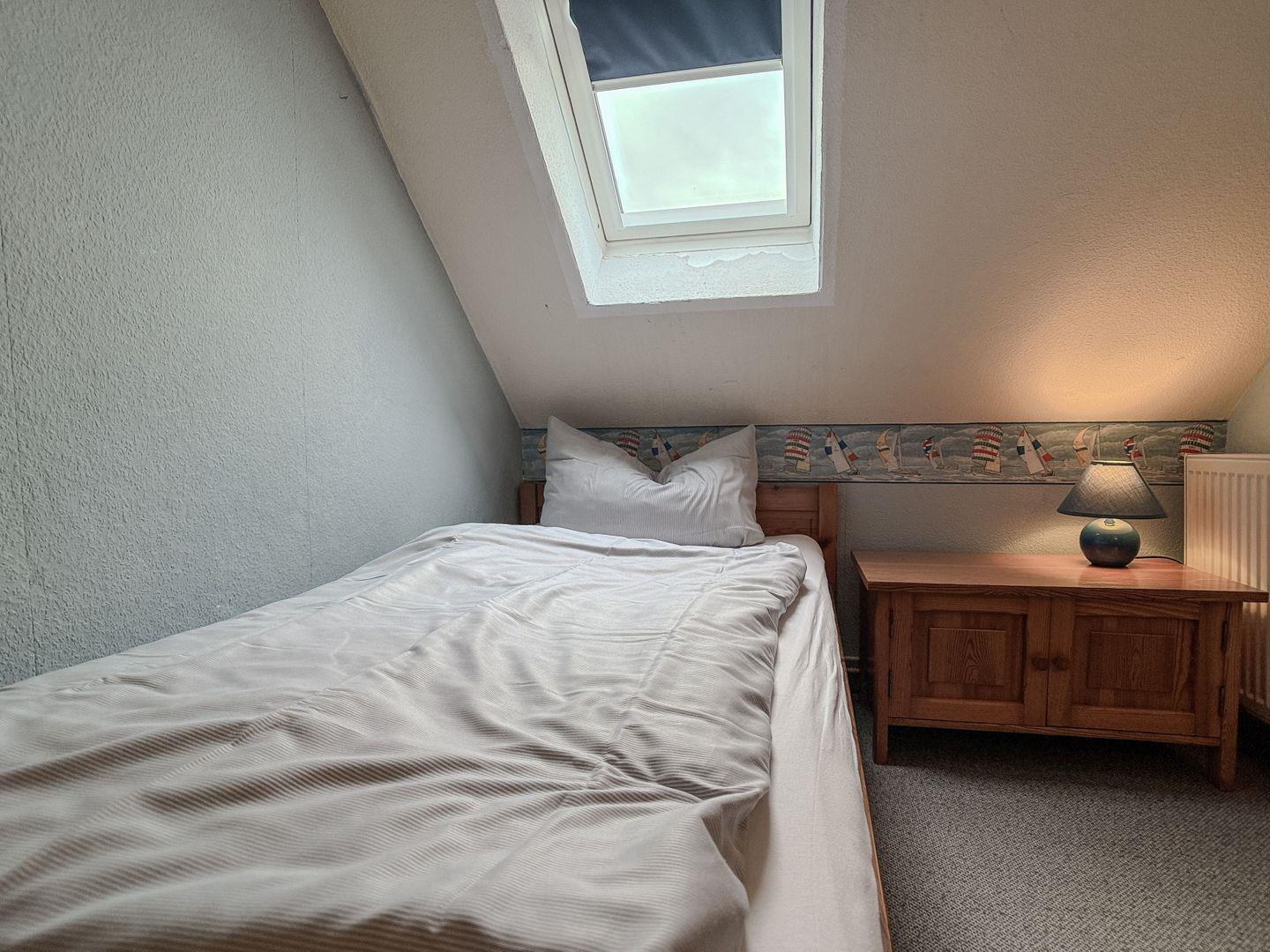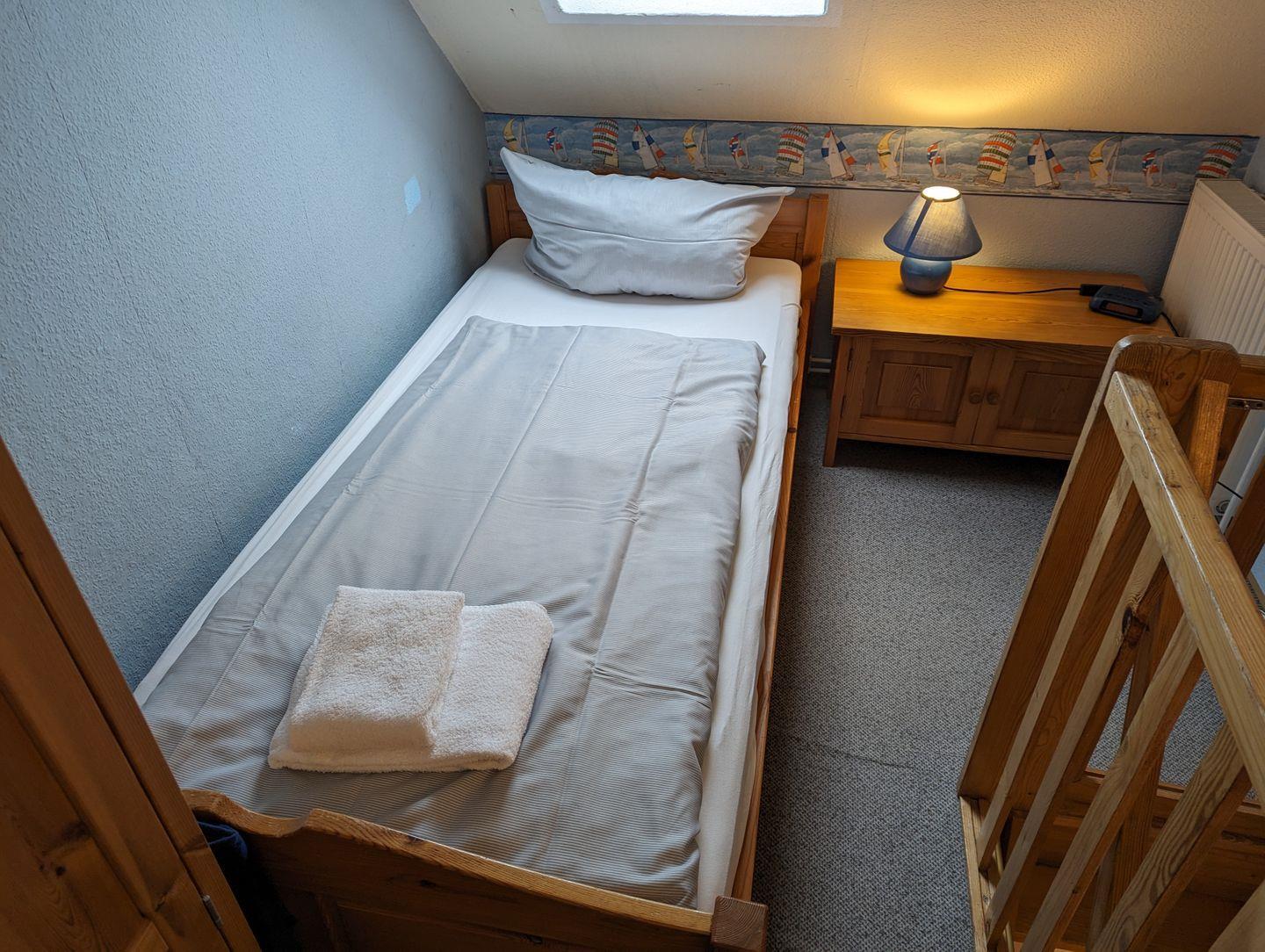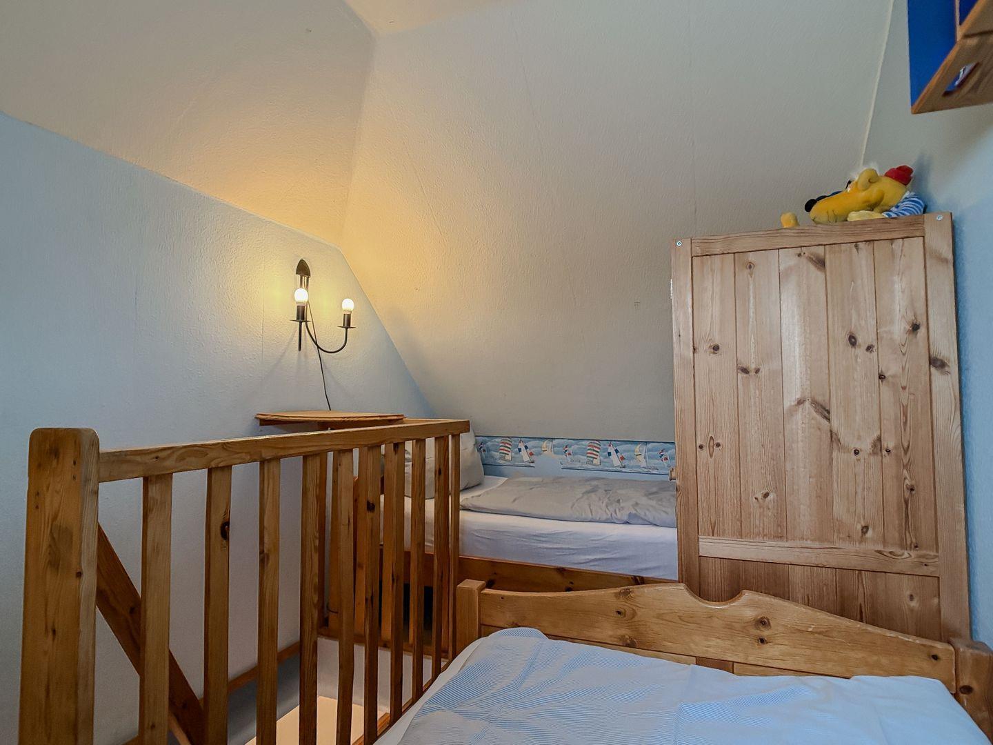 Eine steile Treppe führt zum zweiten Schlafzimmer, das mit einem stabilen Geländer gesichert ist. Ein Treppenschutz für Kinder befindet sich sowohl am oberen als auch am unteren Bereich der Treppe. Das obere Schlafzimmer verfügt über zwei Einzelbetten und zeichnet sich durch die schrägen Wände aus, die eine gemütliche Atmosphäre schaffen.