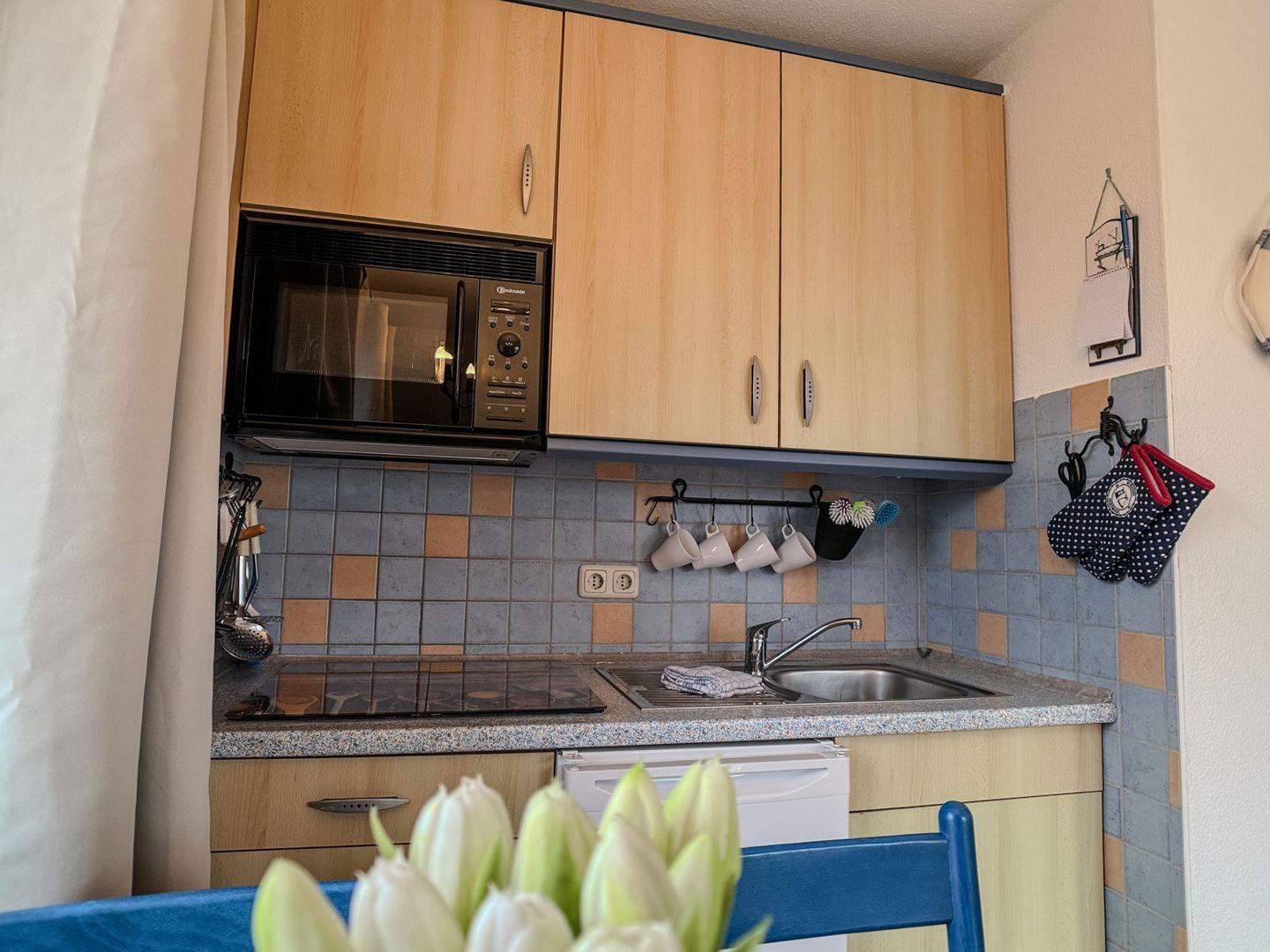 Das gemütliche Wohnzimmer ist mit einer Essecke ausgestattet, die Platz für bis zu 4 Personen bietet. Hier können Sie Ihre Mahlzeiten genießen und gemeinsame Zeit verbringen. Die integrierte Küchenzeile verfügt über alle notwendigen Annehmlichkeiten, um sich selbst zu versorgen, von Herd und Kühlschrank bis hin zu Kochutensilien.
