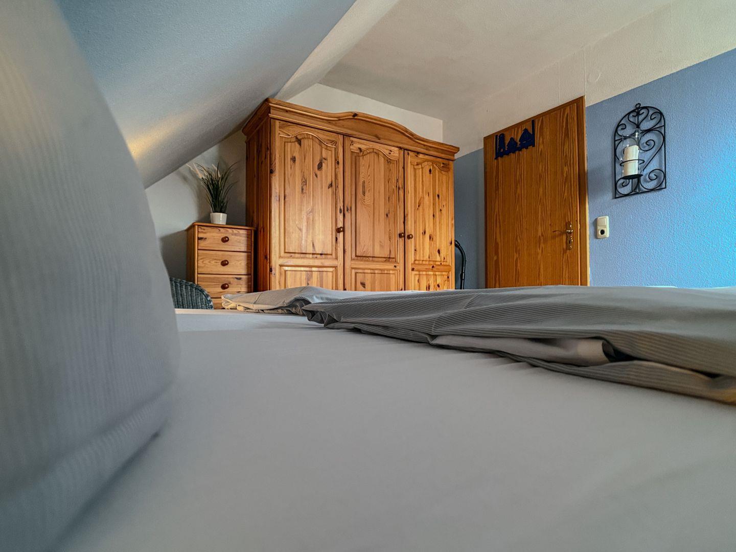 Das geräumige Schlafzimmer bietet einen großen Kleiderschrank, um Ihre Kleidung und persönlichen Gegenstände zu verstauen. Ein Kinderreisebett ist ebenfalls vorhanden, um den Aufenthalt für Familien mit Kleinkindern bequemer zu gestalten.