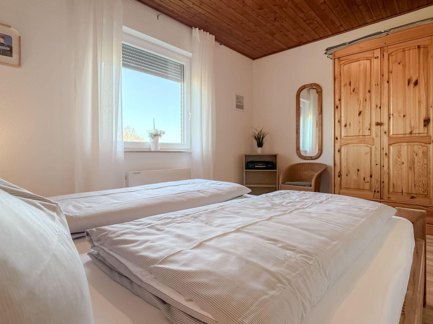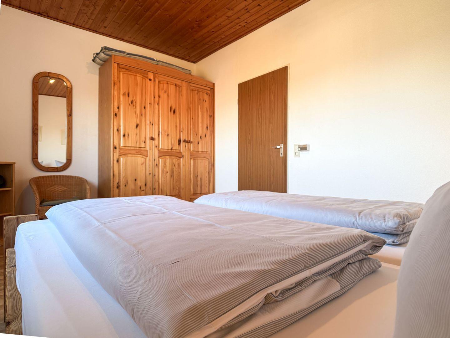 Das Schlafzimmer mit seinem Doppelbett und dem charmanten Holzkleiderschrank schafft eine warme, einladende Atmosphäre, in der Sie zur Ruhe kommen können.