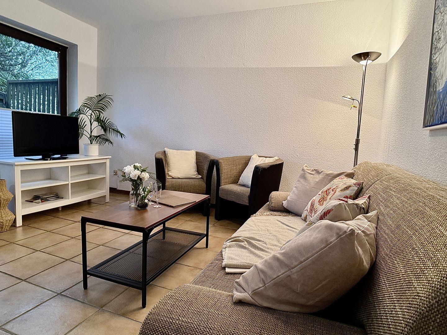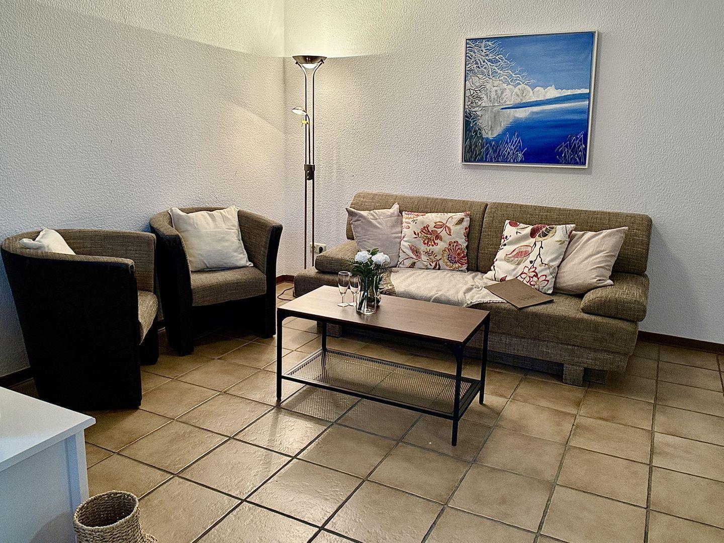 Im Wohnzimmer lädt ein gemütliches Schlafsofa zwei weitere Gäste zum Übernachten ein.
