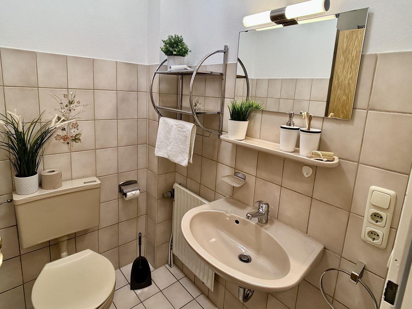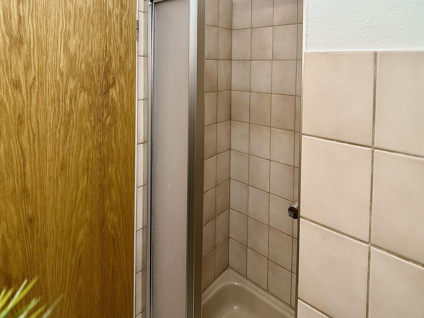 Über den angrenzenden Flur erreichen Sie das Badezimmer, das mit Dusche, Waschbecken und WC alles für Ihre tägliche Hygiene bietet.