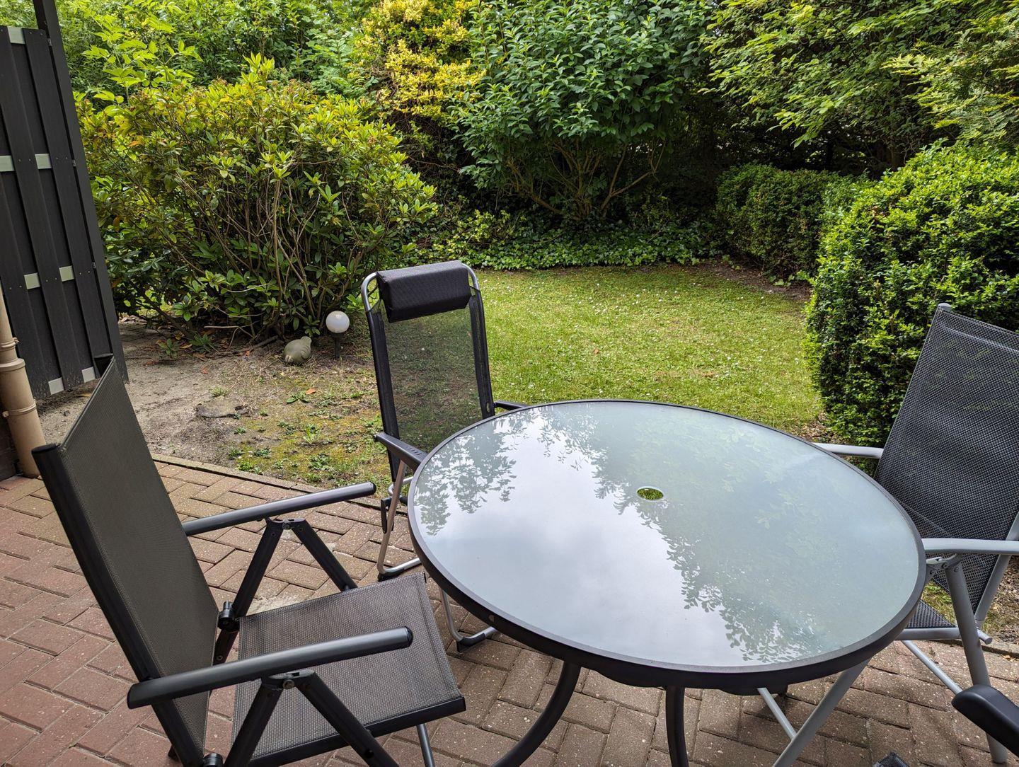 Die schöne, windgeschützte und überdachte Terrasse im Grünen lädt zu entspannten Stunden im Freien ein.