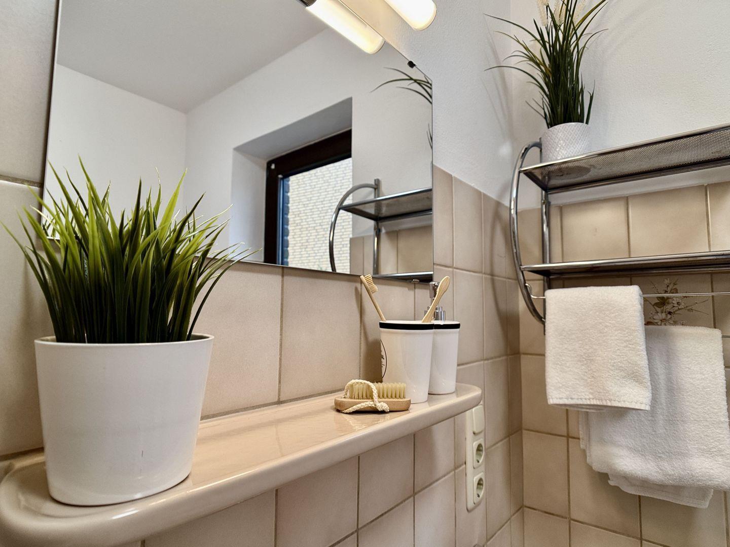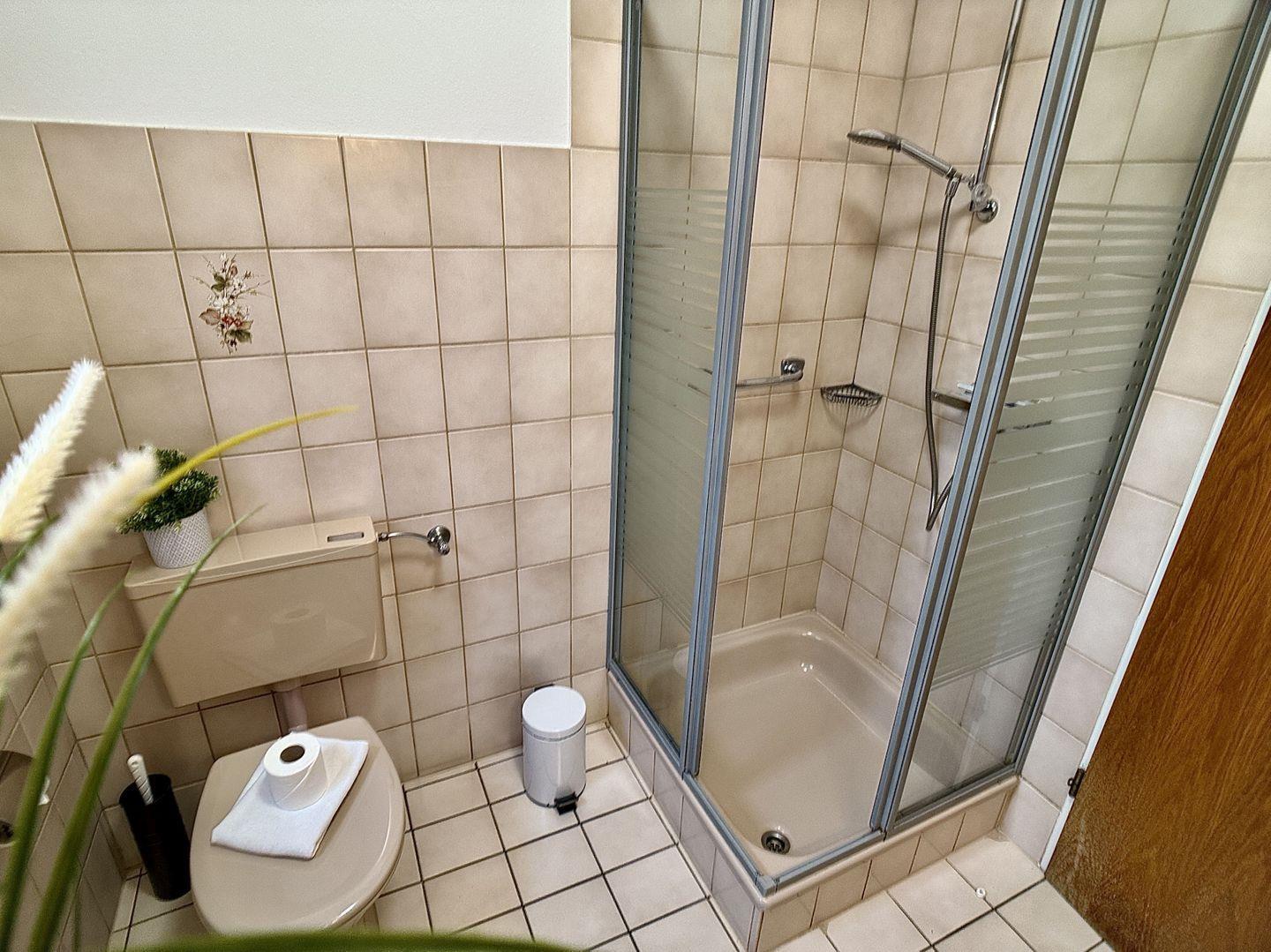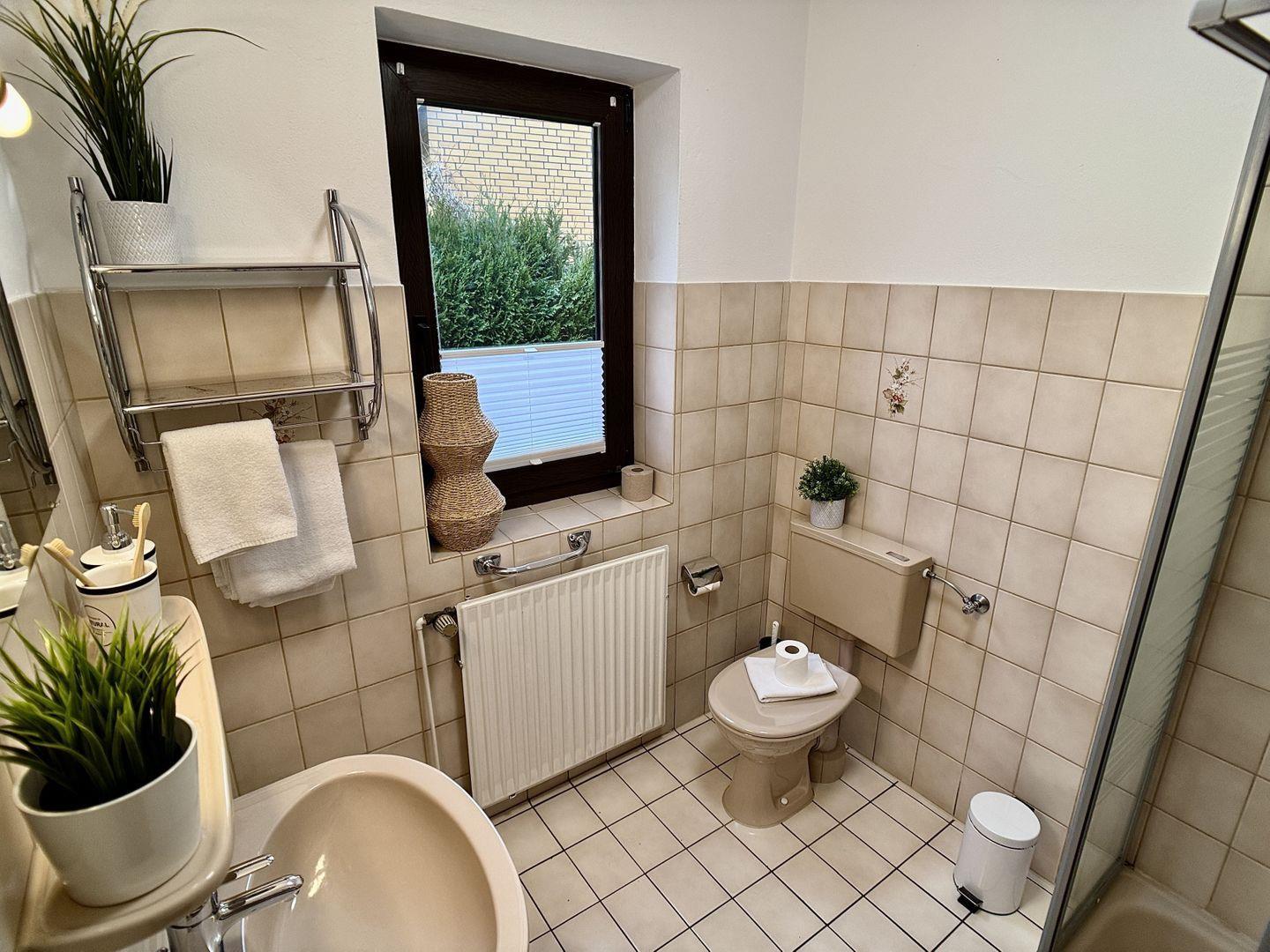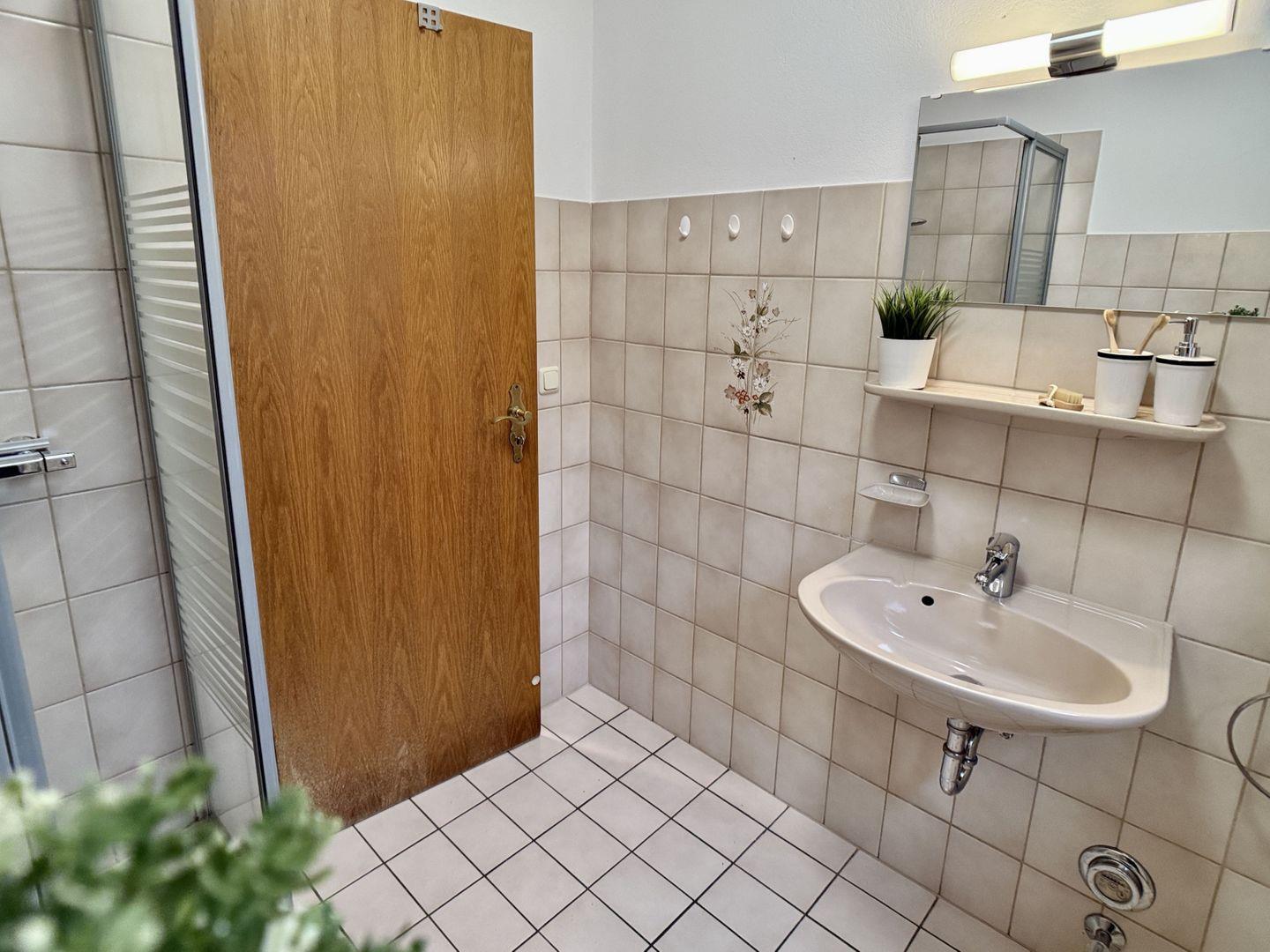 Über den angrenzenden Flur erreichen Sie das helle Tageslichtbad, das mit Dusche, Waschbecken und WC alles für Ihre tägliche Hygiene bietet.