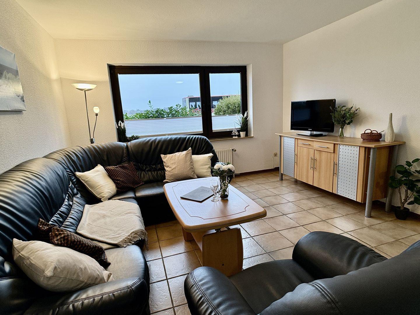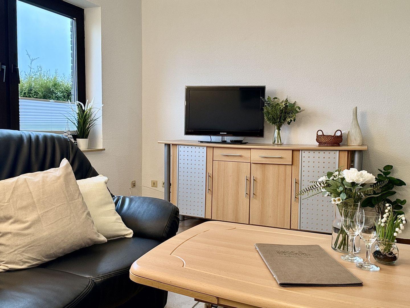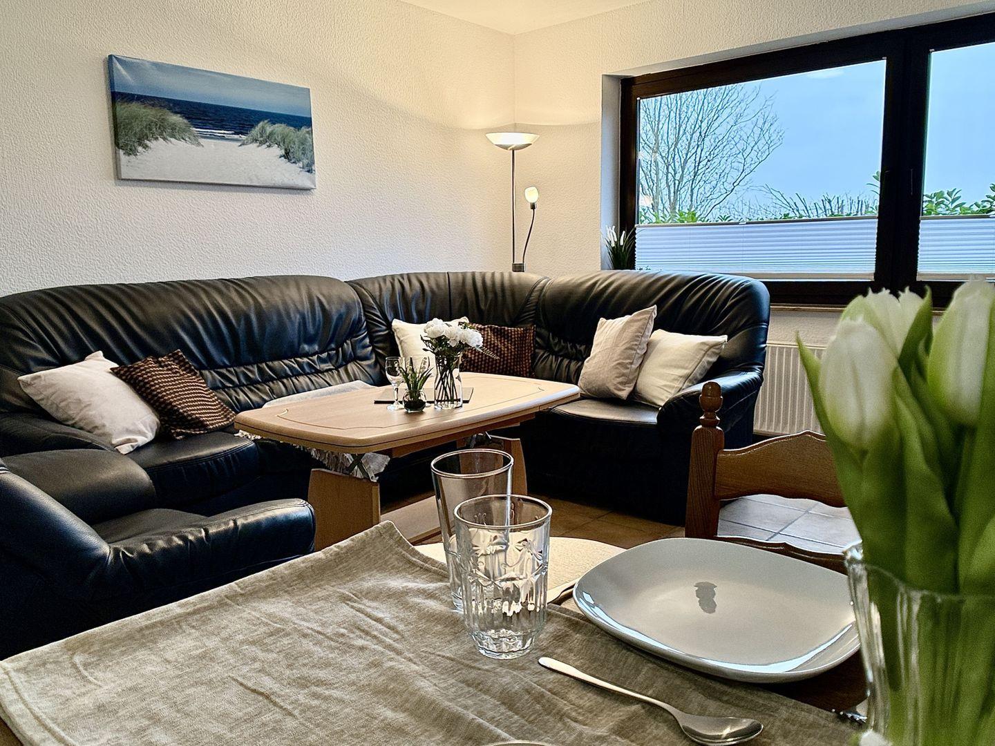 Im Wohnzimmer lädt ein gemütliches Schlafsofa zwei weitere Gäste zum Übernachten ein.