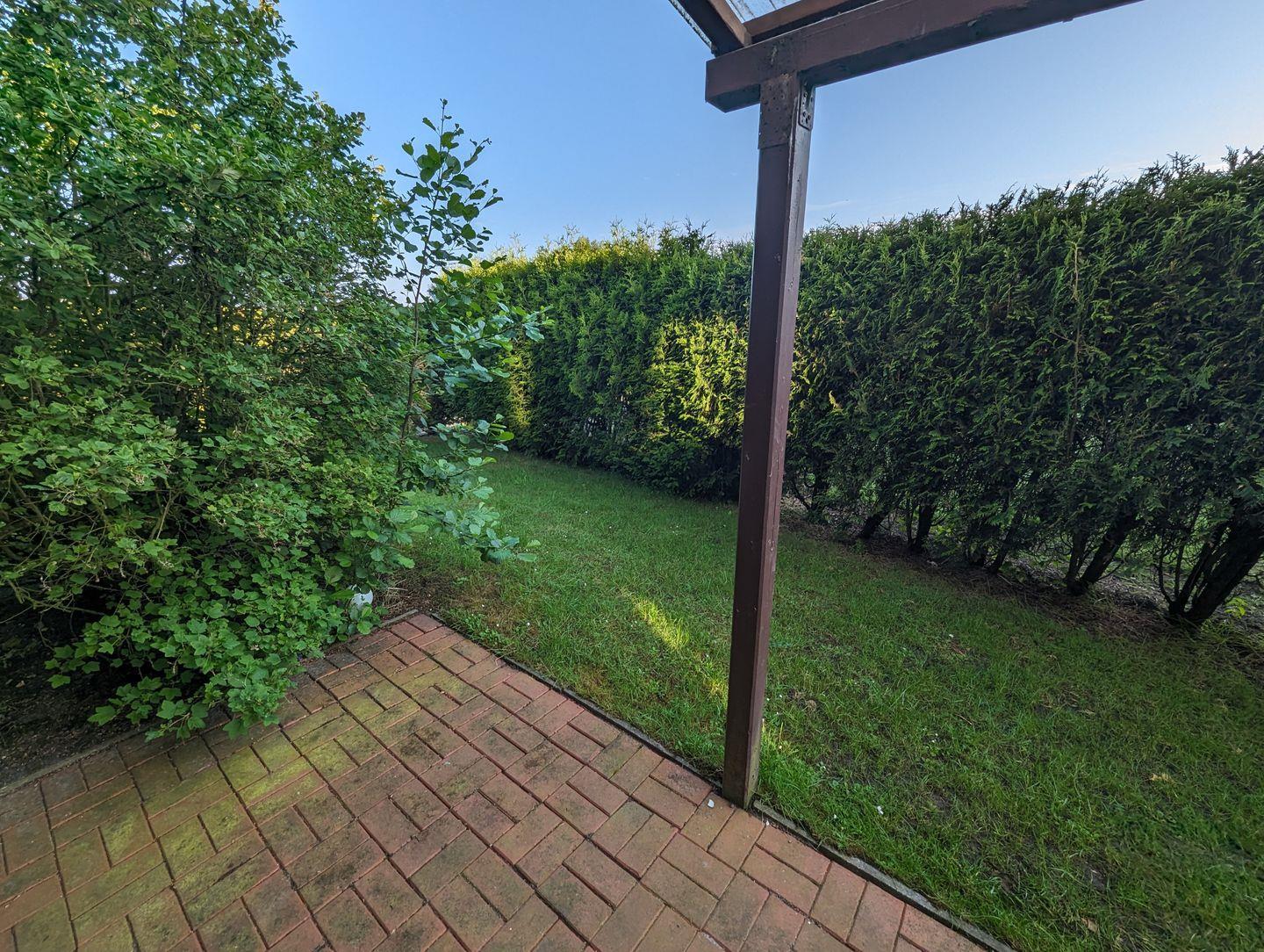 Die schöne, windgeschützte und überdachte Terrasse im Grünen lädt zu entspannten Stunden im Freien ein.