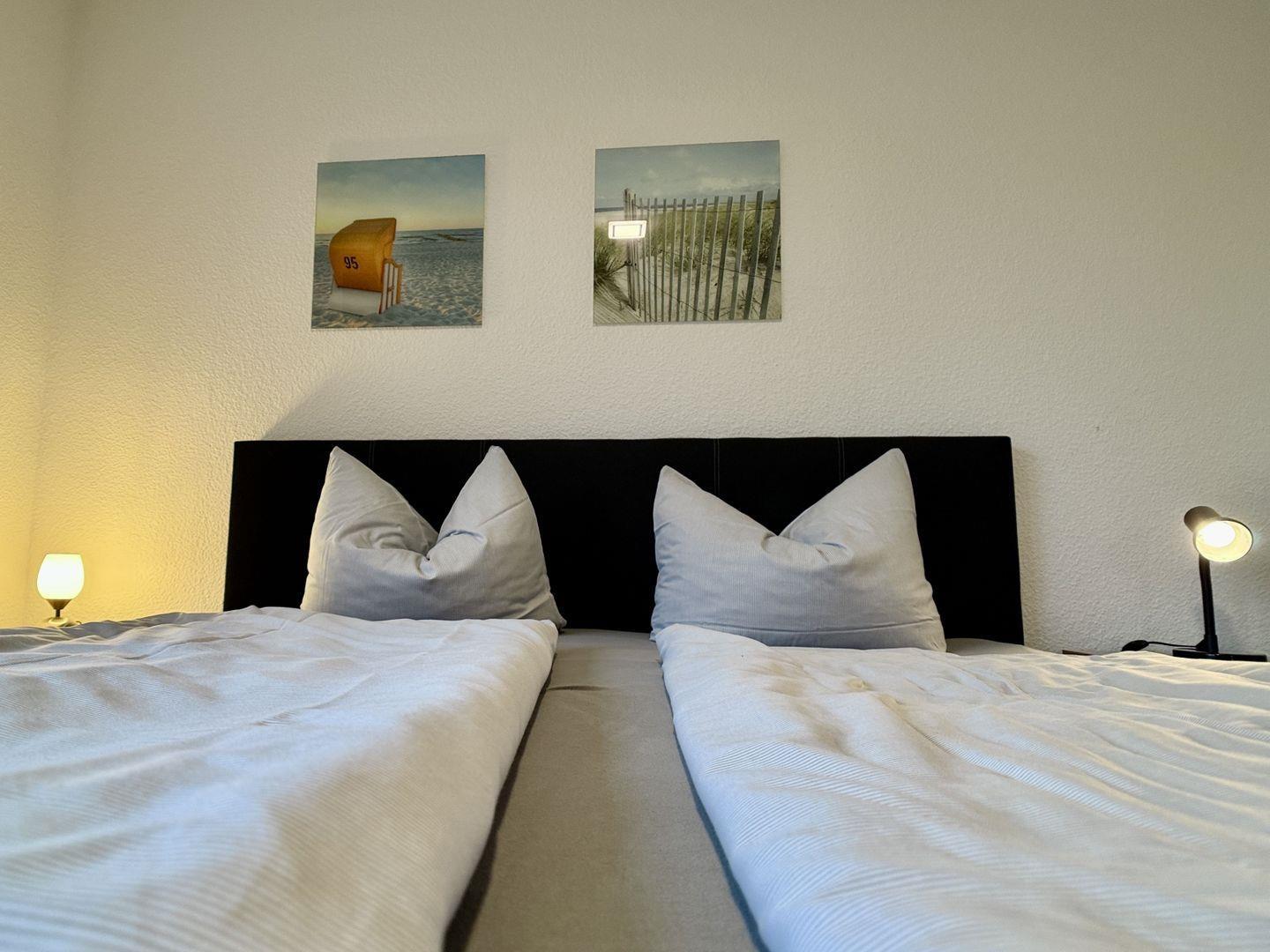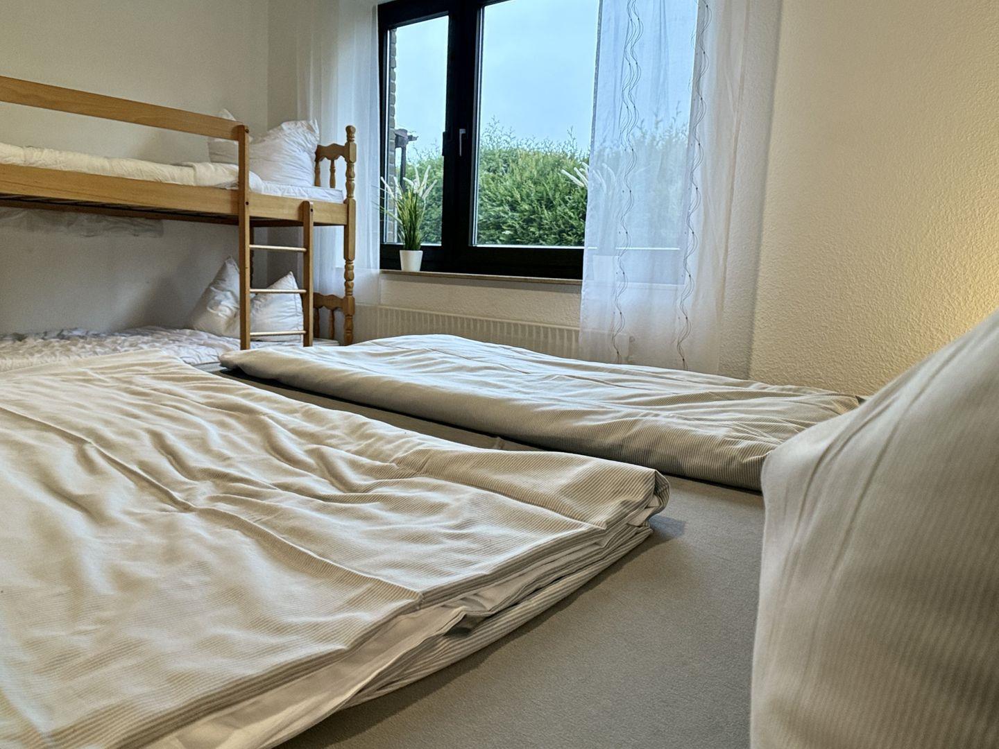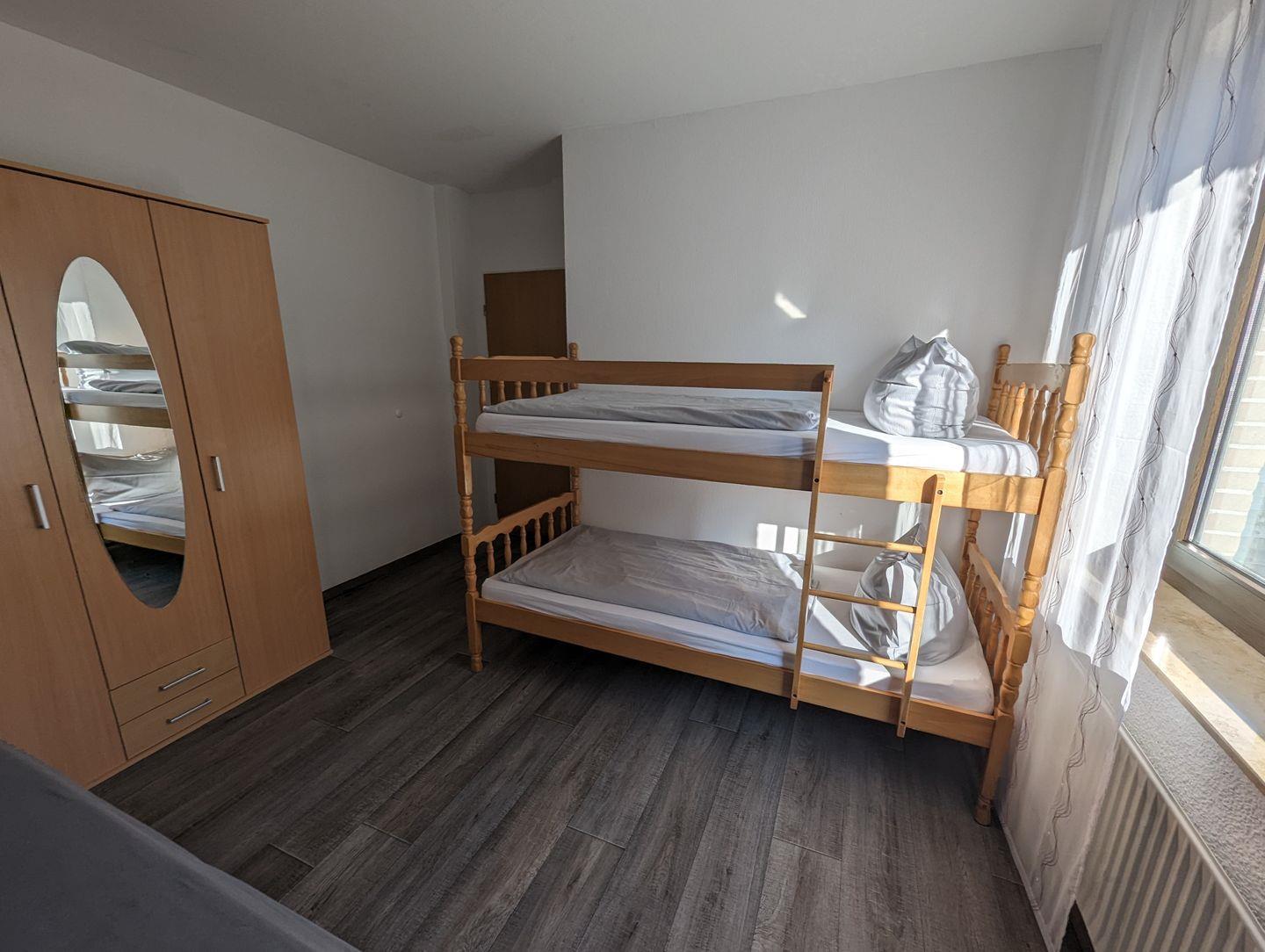 Die Ausstattung umfasst ein komfortables Boxspringbett, ein Etagenbett und ein Schlafsofa.