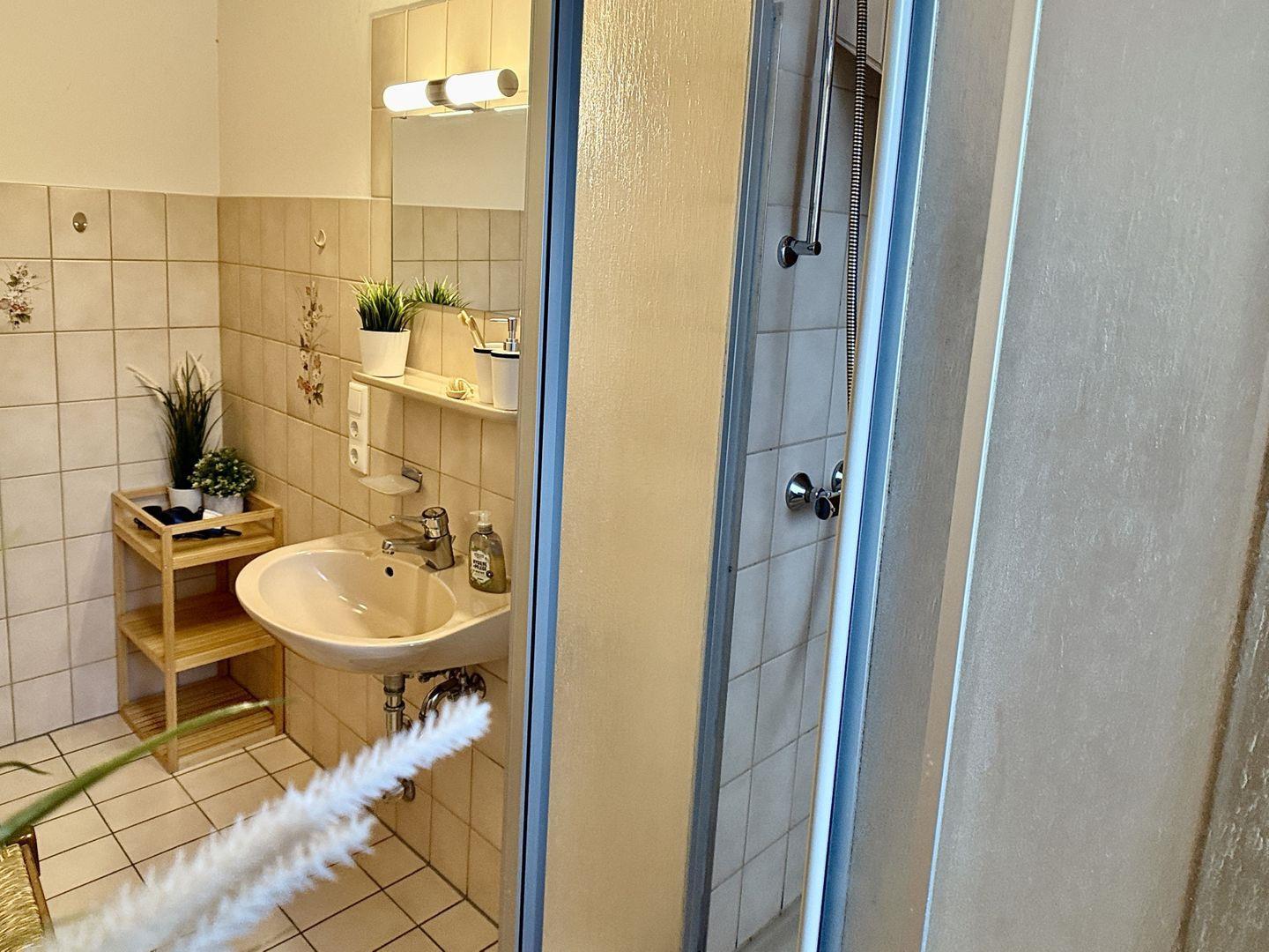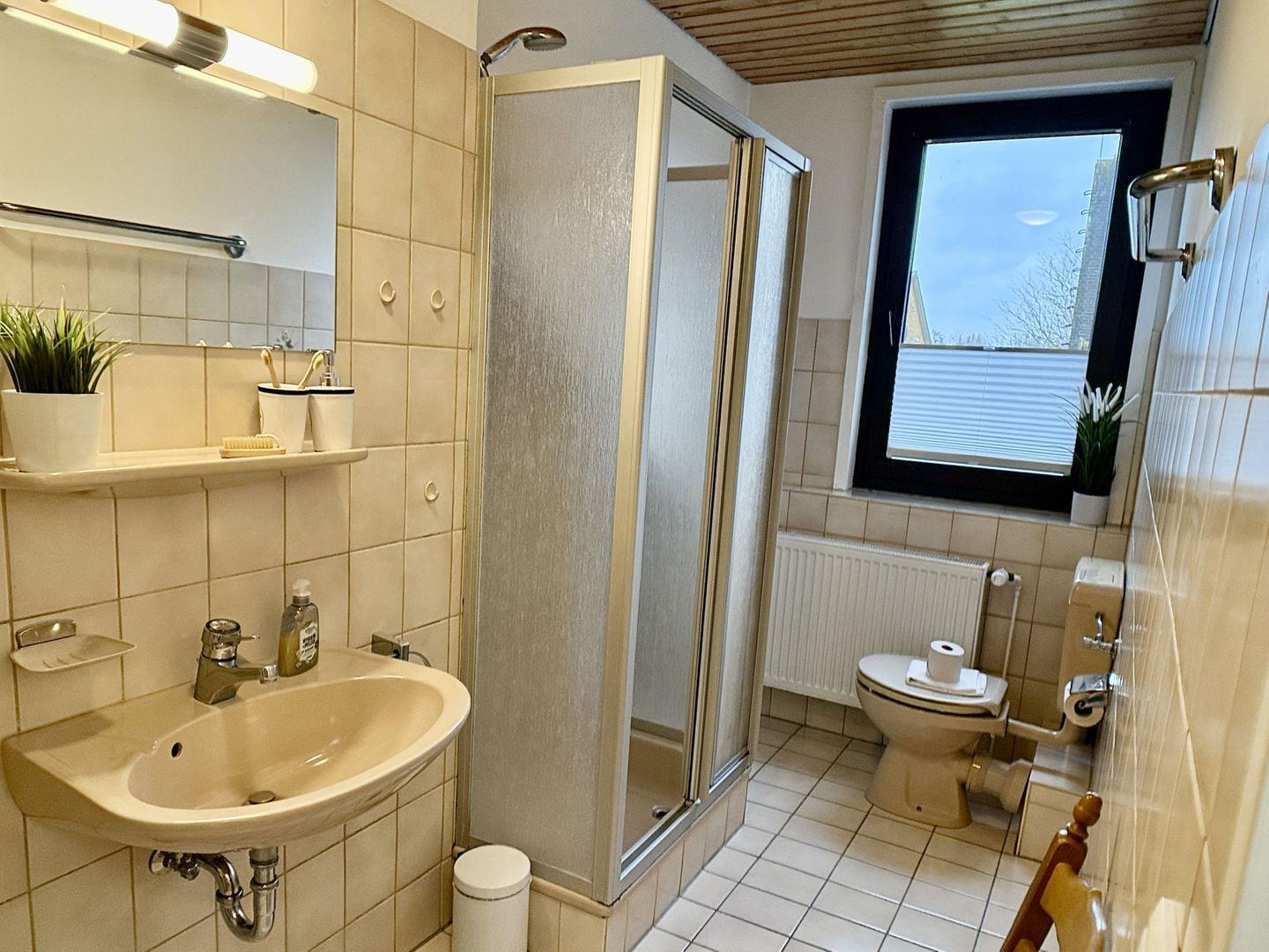 Das Tageslichtbad bietet alles, was Sie für einen erfrischenden Start in den Tag benötigen, mit einer belebenden Dusche, einem WC und einem Waschbecken.