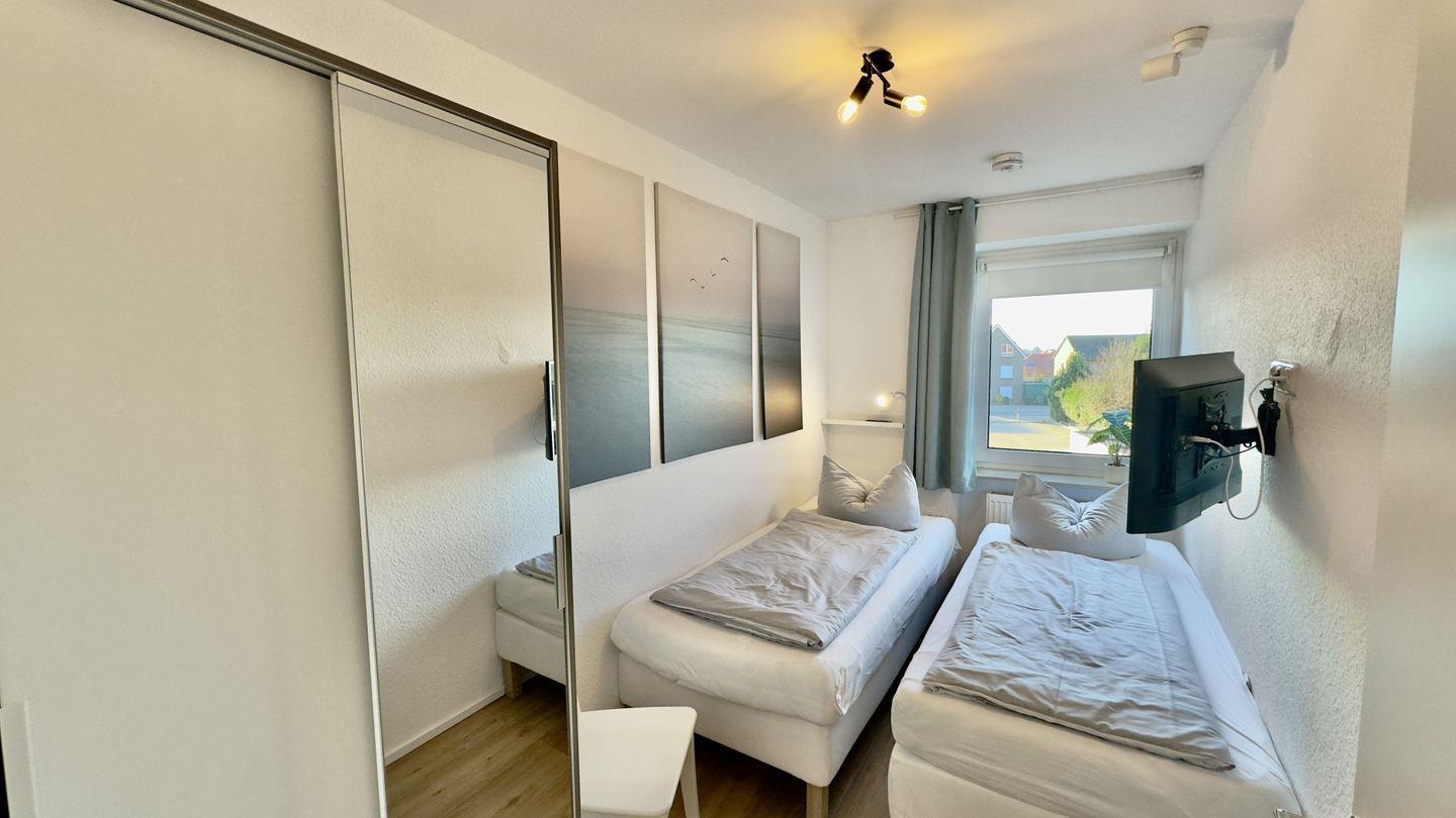 Die angrenzende Wohnküche ist perfekt für Selbstversorger ausgestattet, sodass Sie beim Kochen das Geschehen im Wohnbereich stets im Blick haben. Das separate Schlafzimmer mit zwei Einzelbetten und einem Fernseher bietet einen ruhigen Rückzugsort für erholsame Nächte. Ein Kleiderschrank mit großem Spiegel sorgt für zusätzlichen Stauraum.