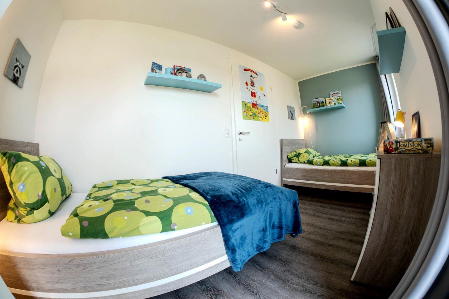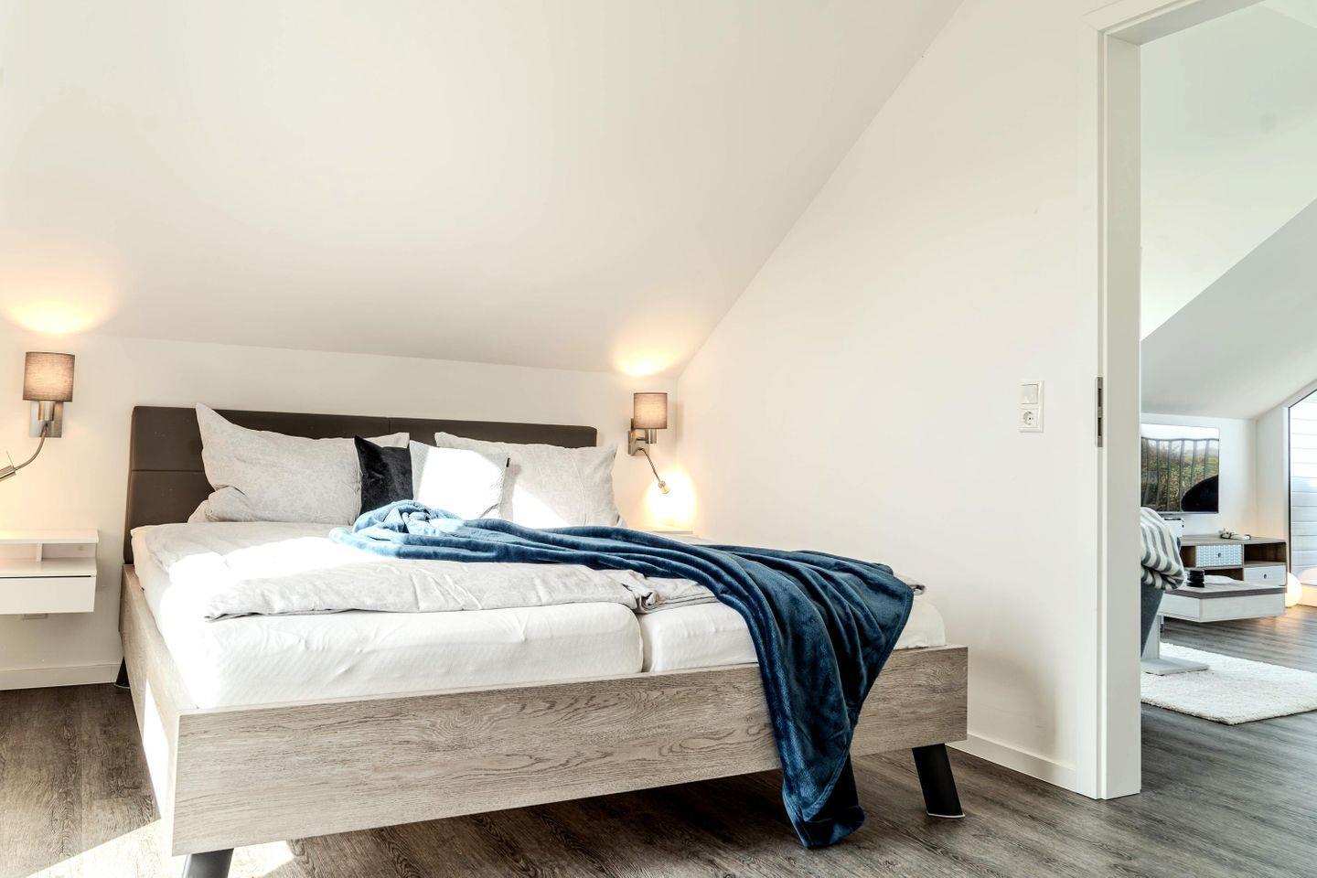 Im ersten Obergeschoss erwartet Sie ein großes, helles Schlafzimmer, in dem Sie den Tag entspannt ausklingen lassen können. Das Kinderzimmer nebenan ist ein behaglicher Rückzugsort für die Kleinen und verfügt über einen Balkon. Außerdem befindet sich auf diesem Stockwerk ein modernes Badezimmer mit Sauna, in dem Sie sich eine Auszeit gönnen und den Alltag hinter sich lassen können.