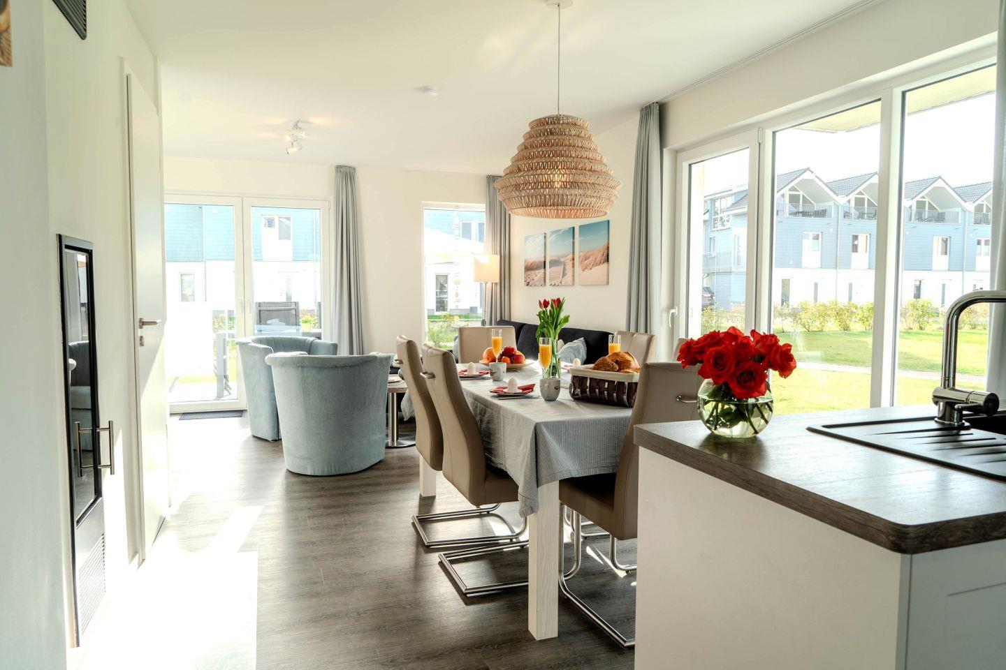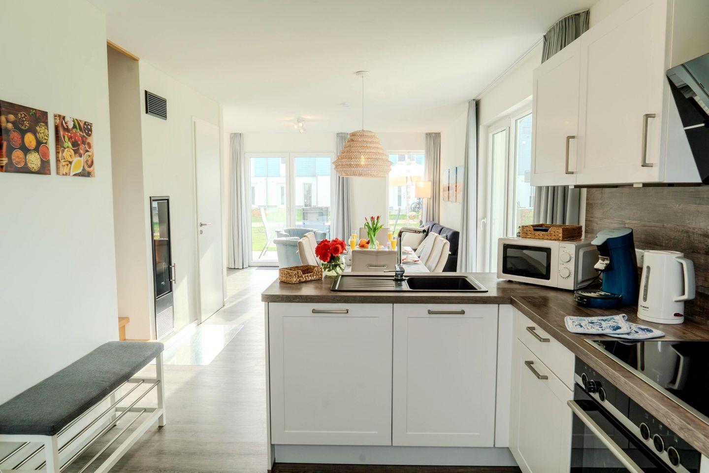 Treten Sie ein und fühlen Sie sich sofort wie zu Hause. Der einladende Eingangsbereich führt zu einer offenen, voll ausgestatteten Küche, die keine Wünsche offen lässt. Hier finden Sie eine Geschirrspülmaschine, einen Kühlschrank mit Gefrierfach, eine Mikrowelle und eine Senseo-Kaffeemaschine. Am großen Esstisch finden bis zu sechs Personen Platz für gemeinsame Mahlzeiten und gemütliches Beisammensein. Der angrenzende Wohnbereich mit Kaminofen, einer einladenden Sofa-Ecke und Sesseln bietet Raum für entspannte Stunden. Von hier aus gelangen Sie auf die großzügige Terrasse, die in sonniger Süd-West-Ausrichtung zum Verweilen einlädt.