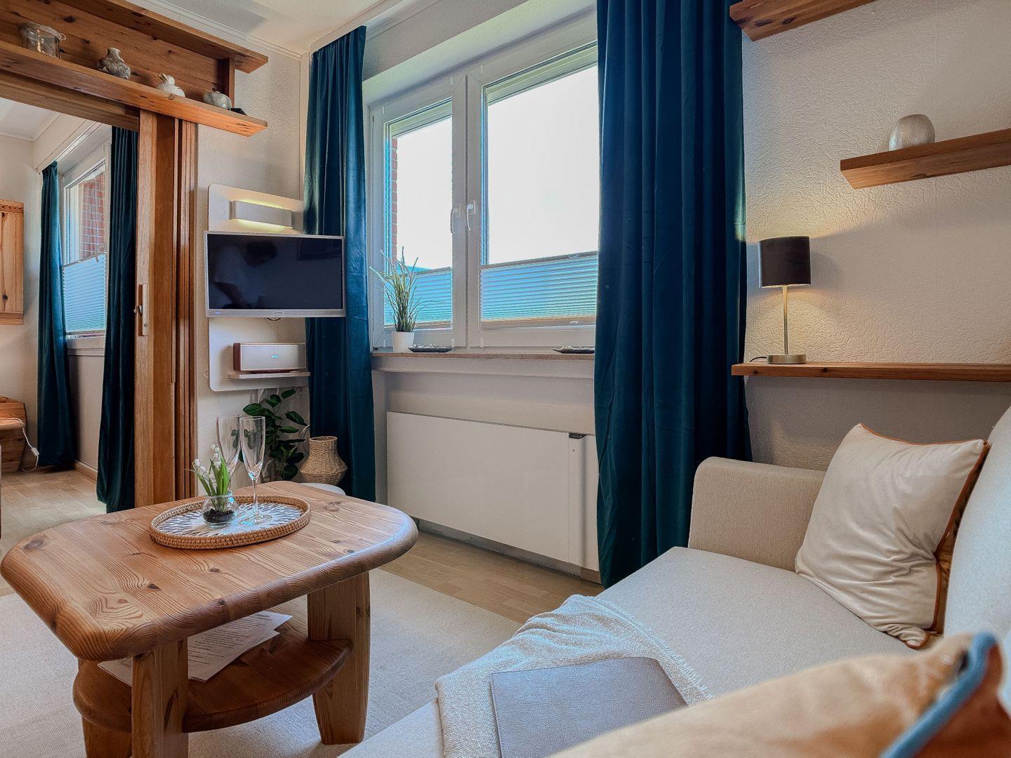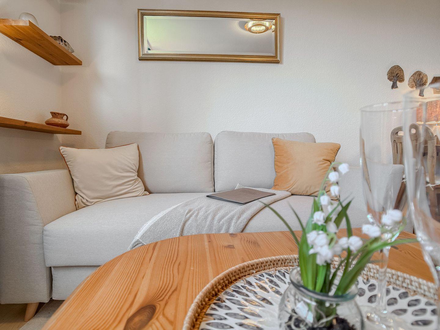 Schon beim Eintreten empfängt Sie das einladende Wohnzimmer, das mit warmen Holzmöbeln und liebevollen Details für eine behagliche Stimmung sorgt. Machen Sie es sich auf dem gemütlichen Schlafsofa bequem und genießen Sie entspannte TV-Abende.