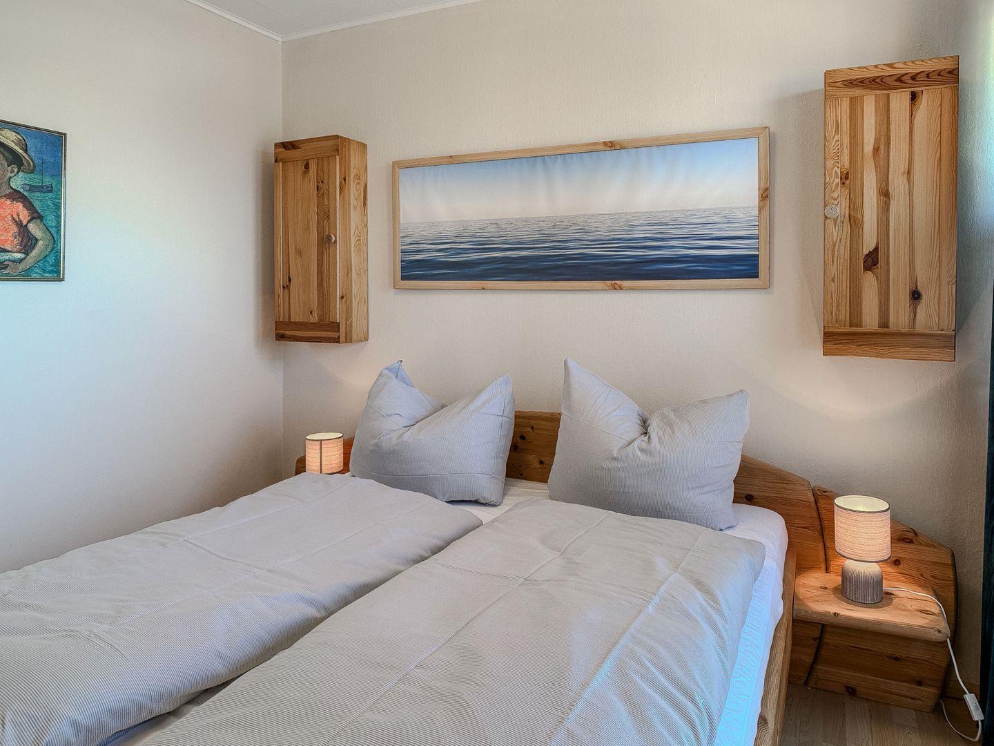 Diese charmante 30qm-Wohnung bietet ein behagliches Doppelbett, ein praktisches Schlafsofa und warme Holzmöbel, die für Wohlfühlatmosphäre sorgen.