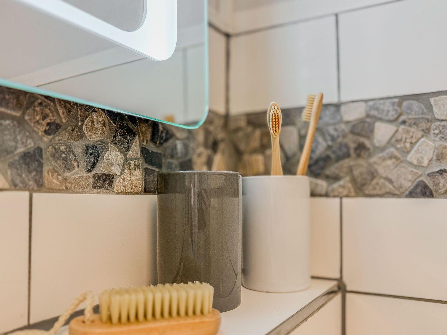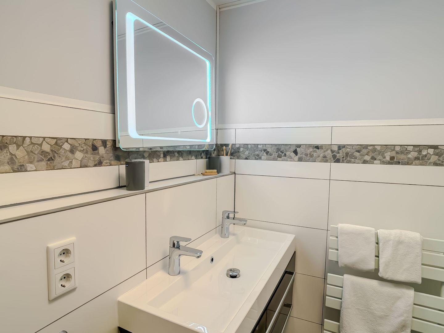 Das modern gestaltete Badezimmer ist hell gefliest und bietet ausreichend Platz für Ihre morgendliche Frische oder einen entspannten Start in den Abend.