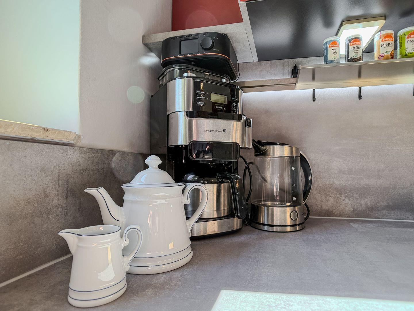 Schon beim Betreten empfängt Sie ein heller, freundlicher Flur, der Sie direkt in Ihre ganz persönliche Auszeit am Meer eintauchen lässt. Die moderne und hochwertig ausgestattete Küche lässt keine Wünsche offen – ob gemeinsames Frühstück, frisch gekochtes Abendessen oder ein schneller Snack zwischendurch: Hier wird Kochen zum Vergnügen. Eine Heißluftfriteuse steht Ihnen ebenfalls zur Verfügung.