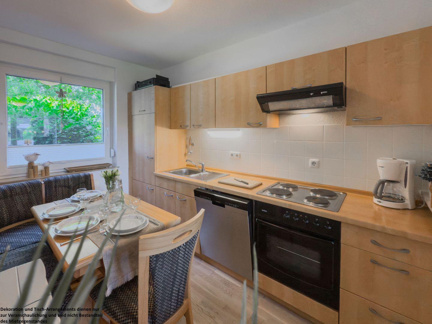 Die Küche grenzt direkt ans Wohnzimmer und ist nicht nur praktisch, sondern auch gemütlich gestaltet. Eine helle Essgruppe bietet Platz für gemeinsame Mahlzeiten, während die gut ausgestattete Küchenzeile alles bereithält, was Sie für Ihre Selbstversorgung benötigen – vom schnellen Frühstück bis zum liebevoll zubereiteten Abendessen.