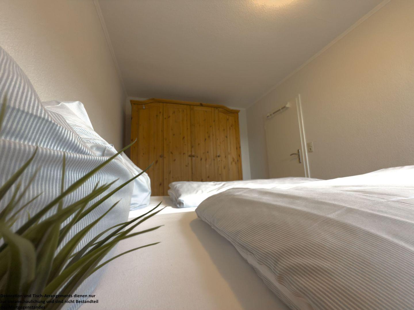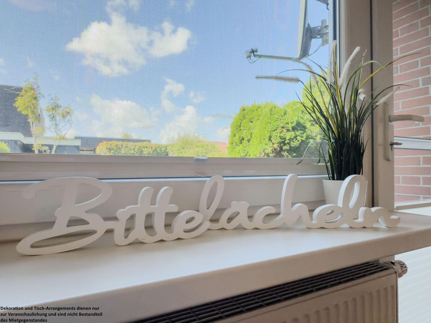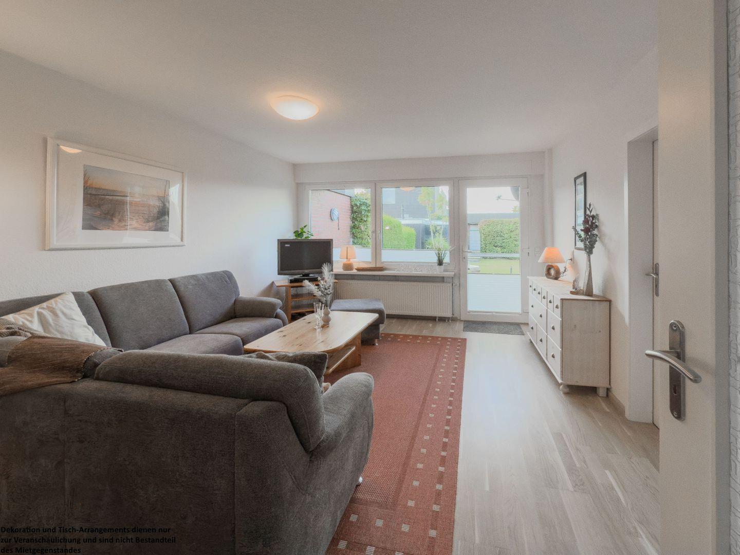 Das Wohnzimmer ist das Herzstück der Wohnung. Eine große, bequeme Couch lädt zu entspannten Abenden ein – ob beim Lesen, beim gemeinsamen Spielen oder einfach beim Ausruhen nach einem Tag am Strand. Durch die breite Terrassentür fällt viel Tageslicht in den Raum und eröffnet den Blick in den kleinen, liebevoll angelegten Garten, der von einer grünen Hecke geschützt ist. Hier finden Sie Ruhe und Geborgenheit. Gartenmöbel und ein Elektrogrill stehen im Gartenhaus bereit, sodass laue Sommerabende bei einem Glas Wein oder einem gemeinsamen Grillabend zum besonderen Urlaubsmoment werden.