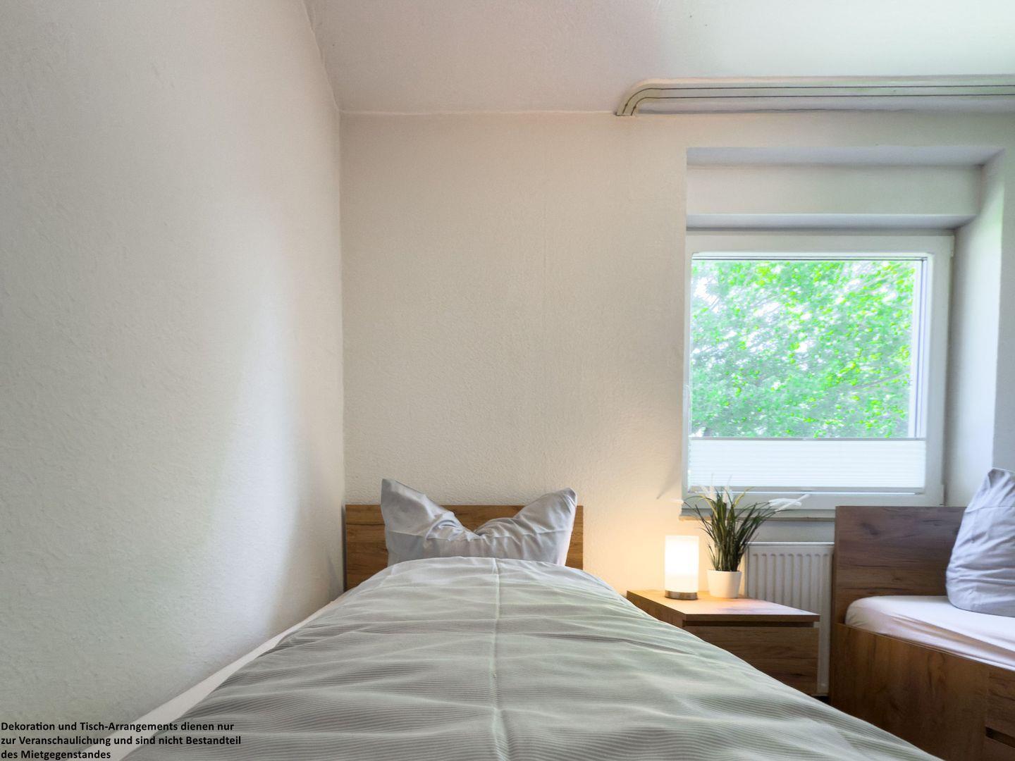 Das zweite Schlafzimmer verfügt über zwei komfortable Einzelbetten und greift ebenfalls die warmen Töne auf – ein idealer Rückzugsort für Kinder, Freunde oder weitere Familienmitglieder.