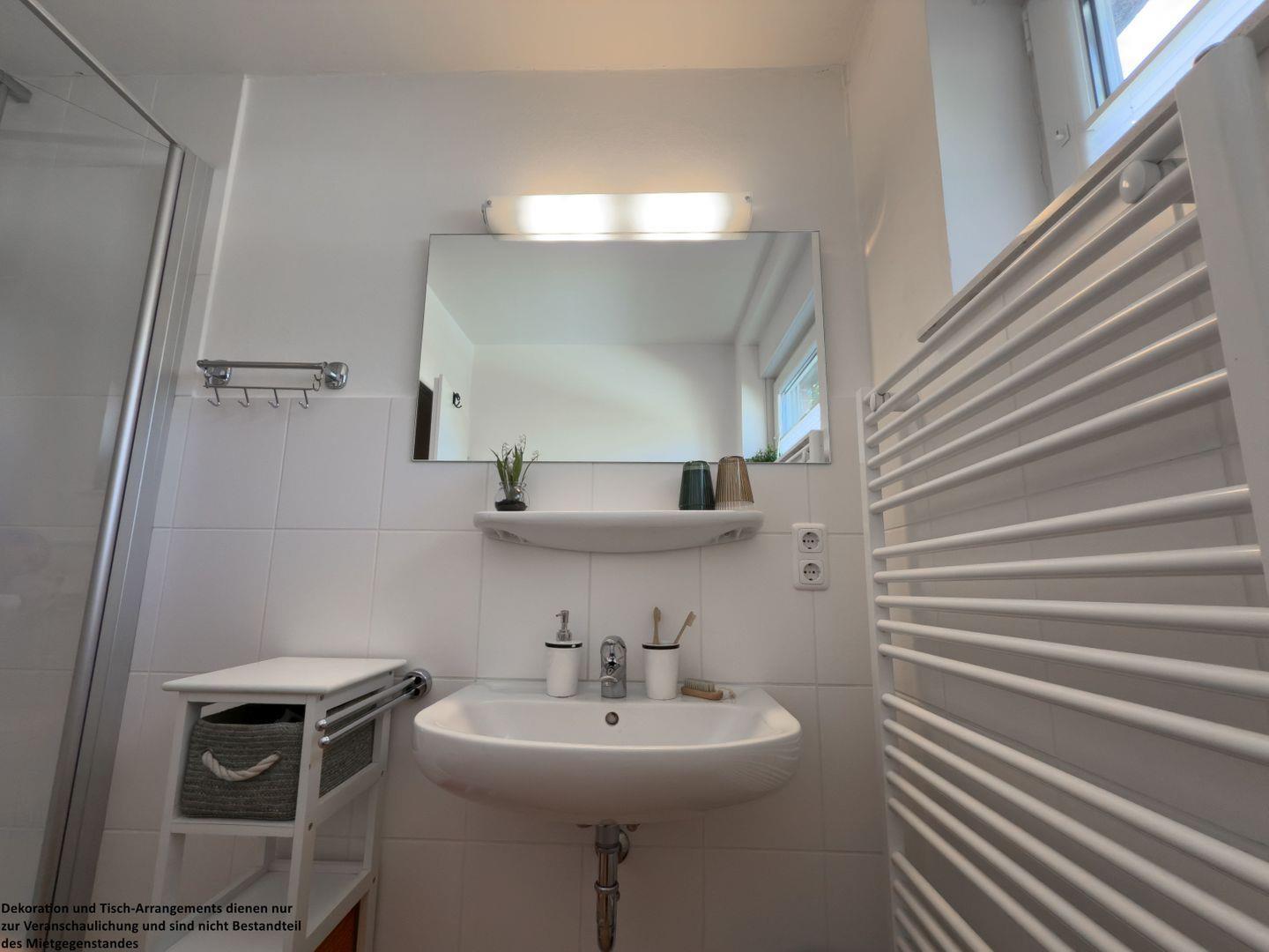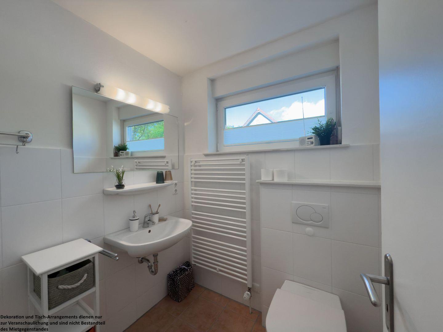 Das Tageslichtbad ist hell, freundlich gefliest und bietet ausreichend Platz für Ihre Morgen- und Abendroutine.