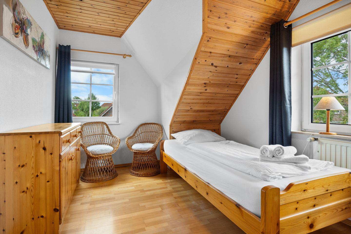 3-Zimmer-Haus 80 m2 auf 2 Stockwerken. Gemütlich und mit viel Holz eingerichtet: Wohn-/Esszimmer mit Schwedenofen, Sat-TV, Stereoanlage und DVD. Ausgang zur Terrasse. Offene Küche (Backofen, Geschirrspüler, 4 Glaskeramikplatten, Toaster, Wasserkocher, Mikrowelle, Tiefkühler, elektrische Kaffeemaschine). Dusche/WC, Sauna (kostenpflichtig). Obergeschoss: 1 abgeschrägtes Zimmer mit 1 Doppelbett und Sat-TV (Flachbildschirm), DVD. 1 abgeschrägtes Zimmer mit 2 Betten und Sat-TV (Flachbildschirm). Sep. WC. Terrassenmöbel, Gartengrill (2). Zur Verfügung: Waschmaschine, Safe, Kinderhochstuhl, Babybett. WLAN. Bitte beachten: Nichtraucher-Unterkunft. Maximal 2 Haustiere/Hunde erlaubt. Rauchmelder, Feuerlöscher.