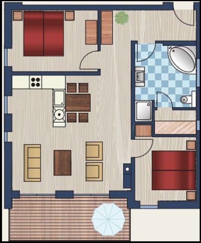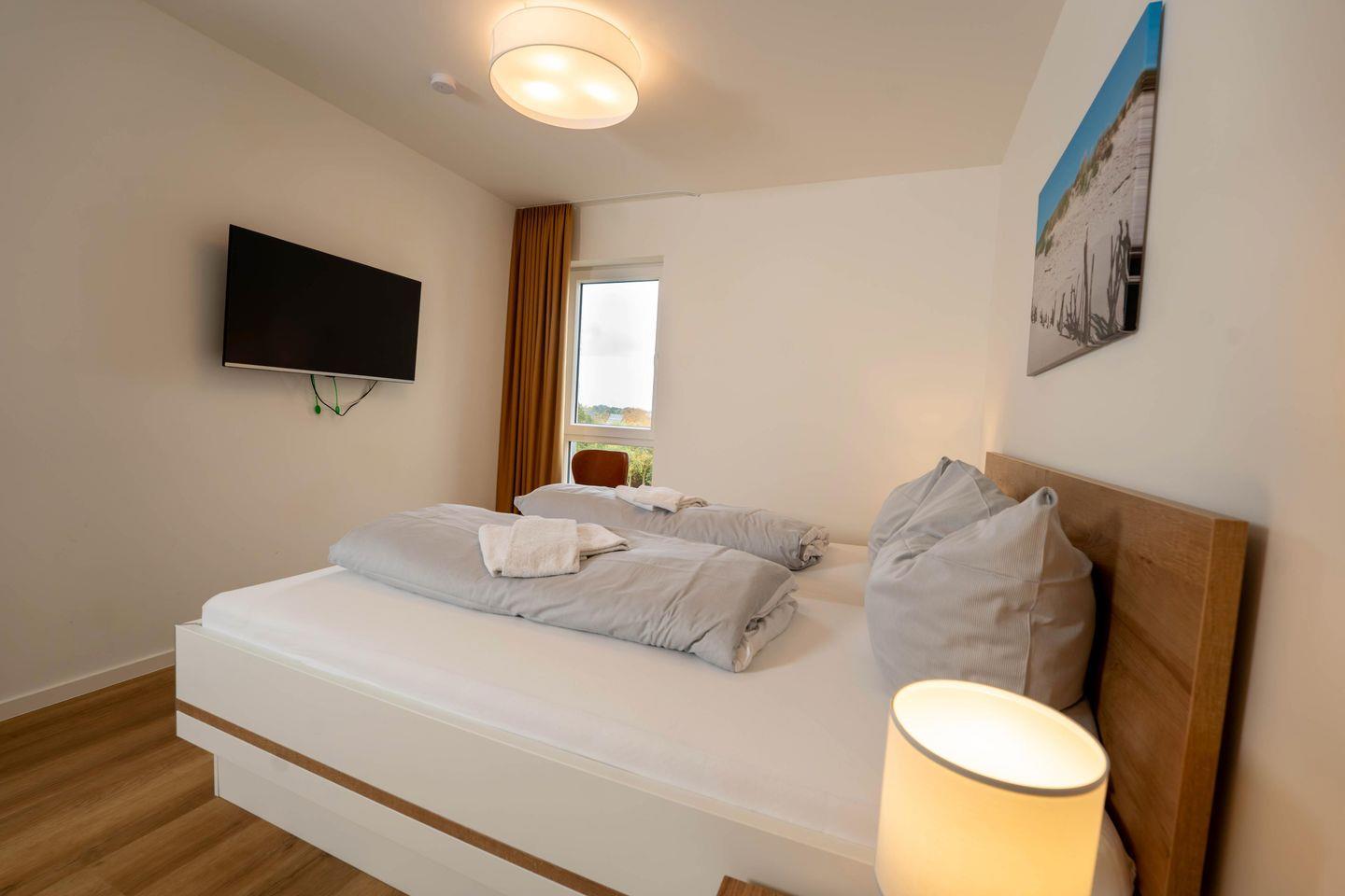 Zwei geschmackvoll eingerichtete Schlafzimmer mit komfortablen Doppelbetten und großzügigem Stauraum schenken Euch erholsame Nächte. Jedes Zimmer verfügt über ein eigenes TV-Gerät – perfekt, wenn jeder einmal Zeit für sich möchte.