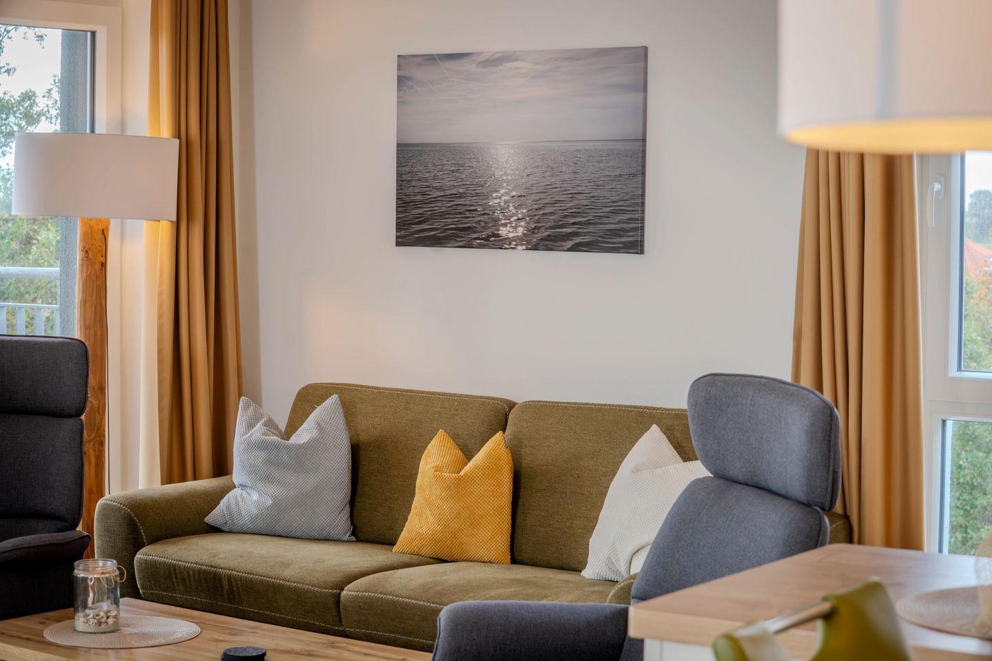 Im großzügigen Wohnbereich mit bequemer Sofaecke könnt Ihr die Seele baumeln lassen. Ob Filmabend, Lesestunde oder geselliges Beisammensein – hier ist der richtige Platz. Der direkte Zugang zum überdachten Balkon eröffnet Euch dabei den schönsten Blick ins Grüne und lässt viel Tageslicht herein.