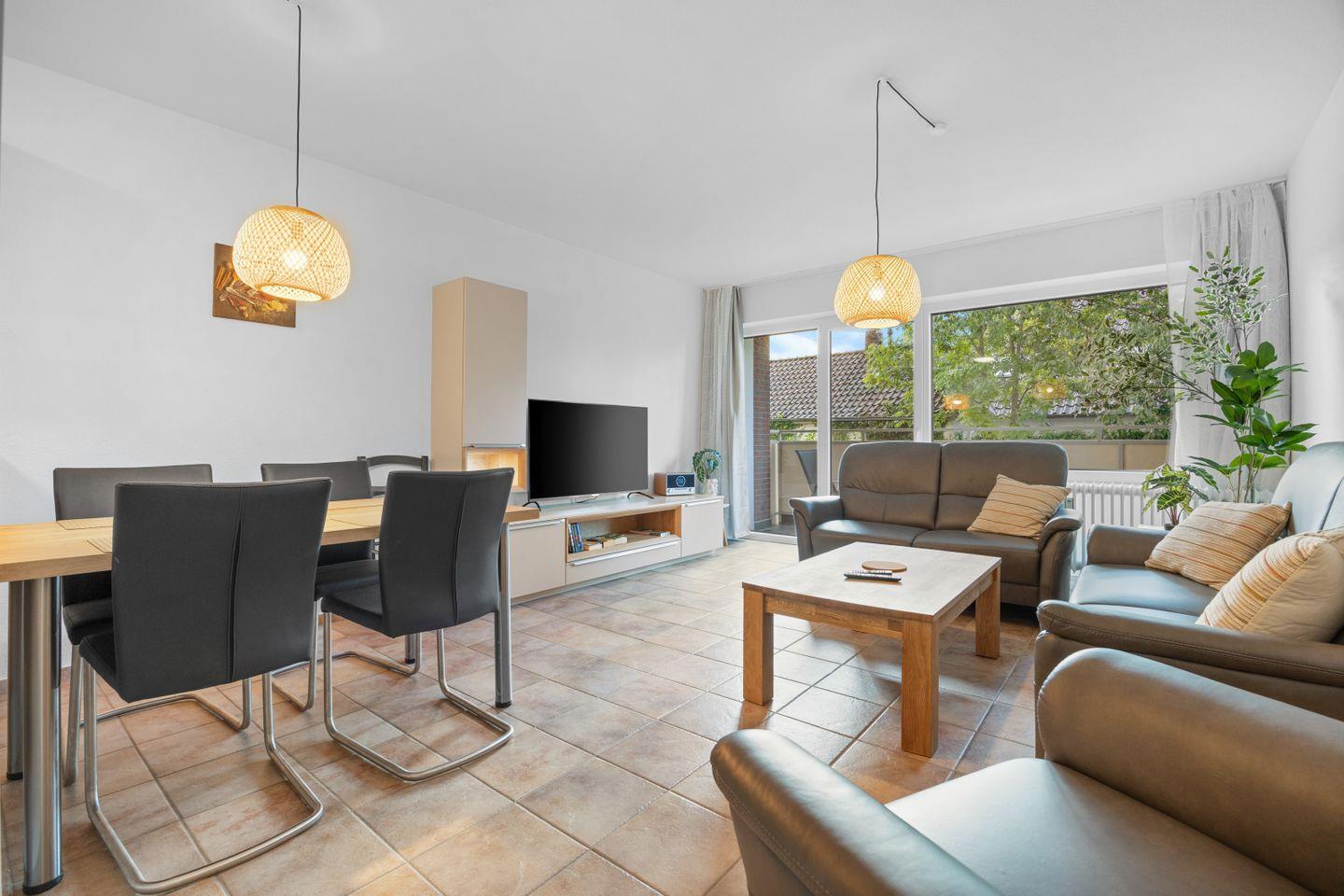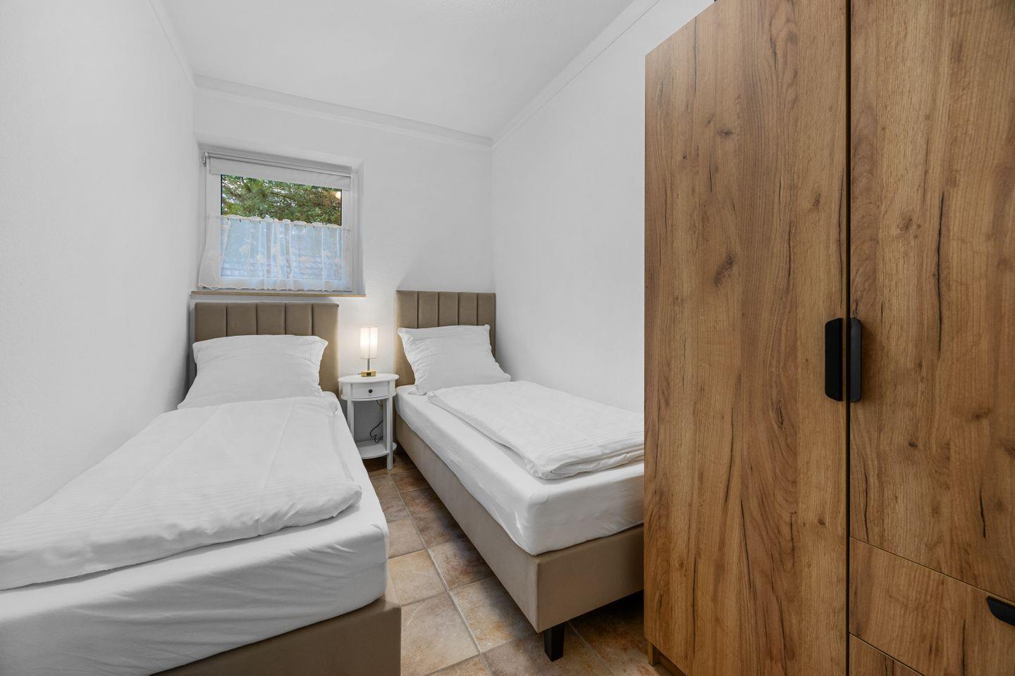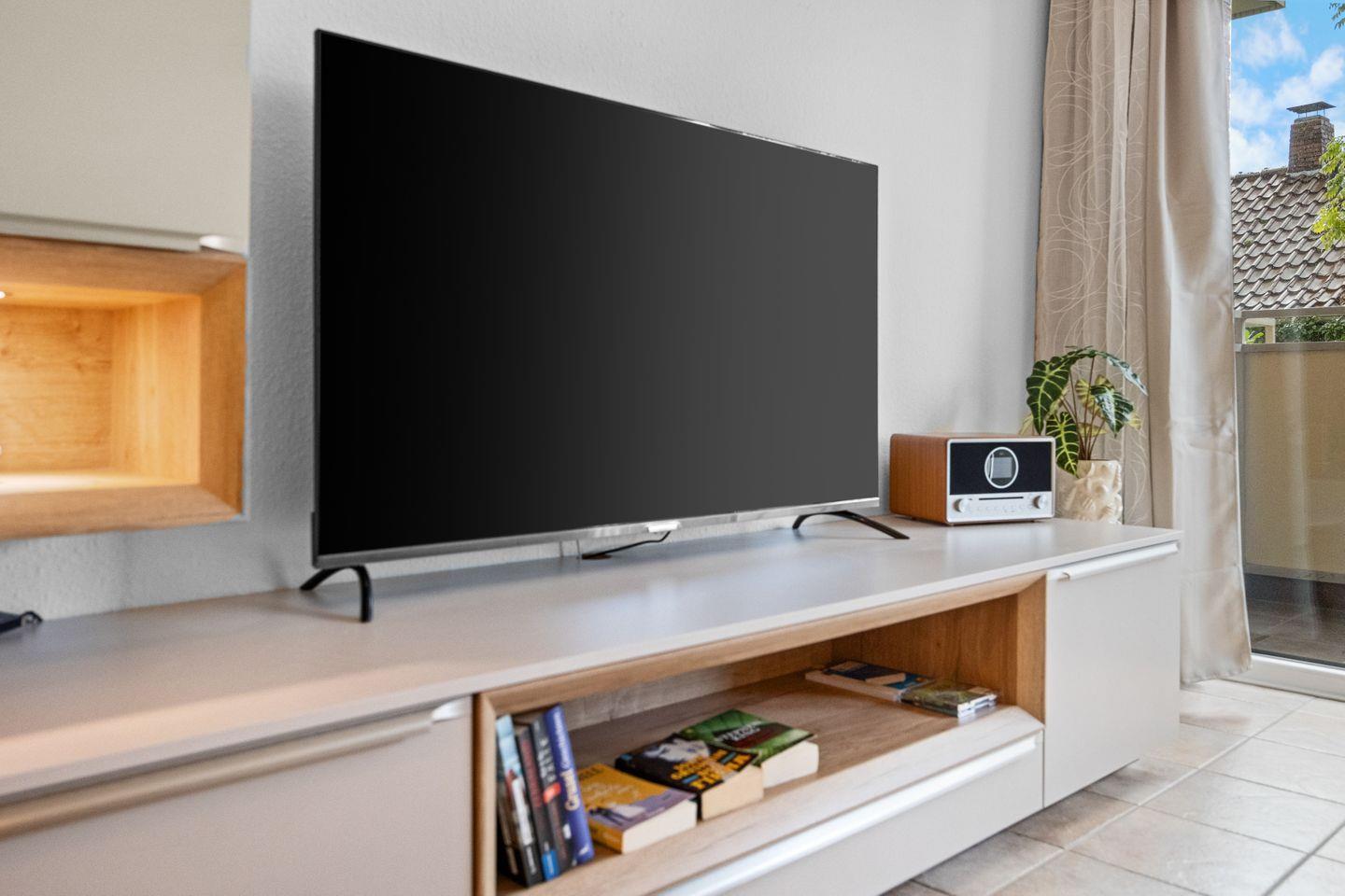 Im gemütlichen Wohnzimmer erwarten Sie ein Sofa, Sessel und viel Licht durch die großen Fenster (mit Sichtschutz und Fliegengittern). Zur Unterhaltung gibt es einen Fernseher, HiFi-Anlage, CD-Player, Bücher und Radio – perfekt für entspannte Abende nach einem Tag am Meer.