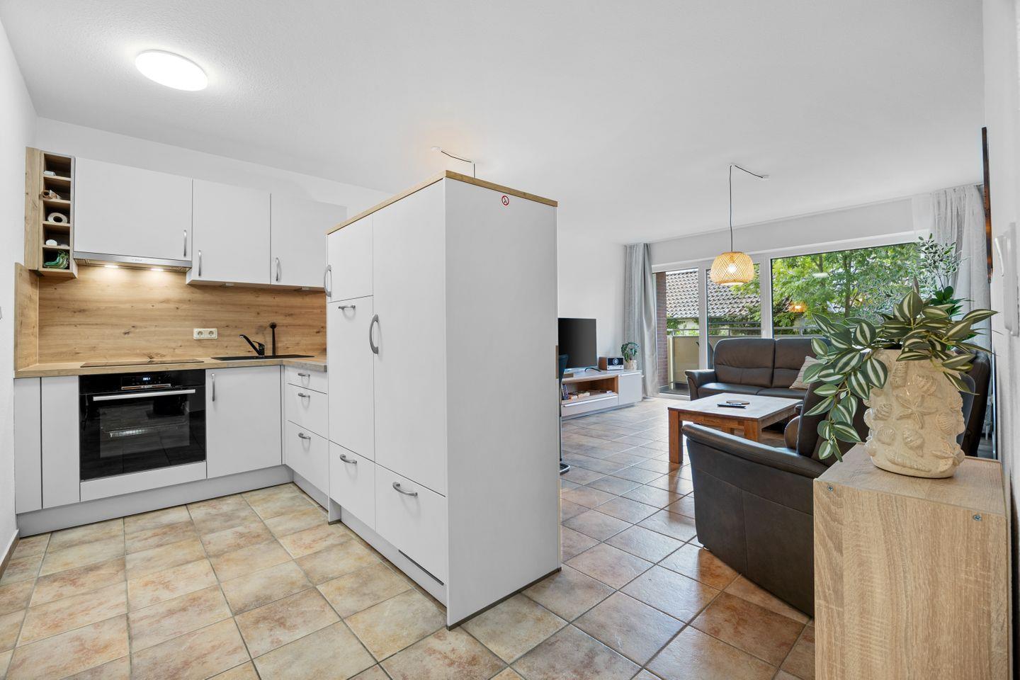 Die offene Küche ist bestens ausgestattet: Induktionsherd, Backofen, Geschirrspüler, Kühlschrank mit Gefrierfach, Kaffeemaschine, Wasserkocher, Toaster, Eierkocher sowie umfangreiches Kochgeschirr lassen keine Wünsche offen. Der angrenzende Essbereich lädt zum gemeinsamen Kochen und Genießen ein.