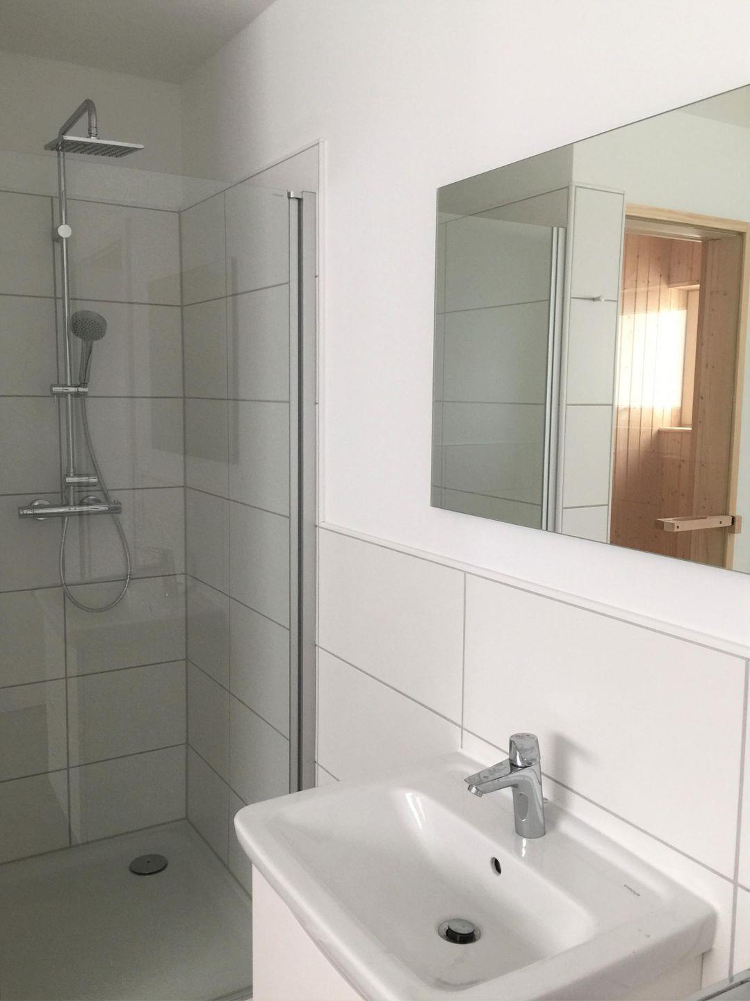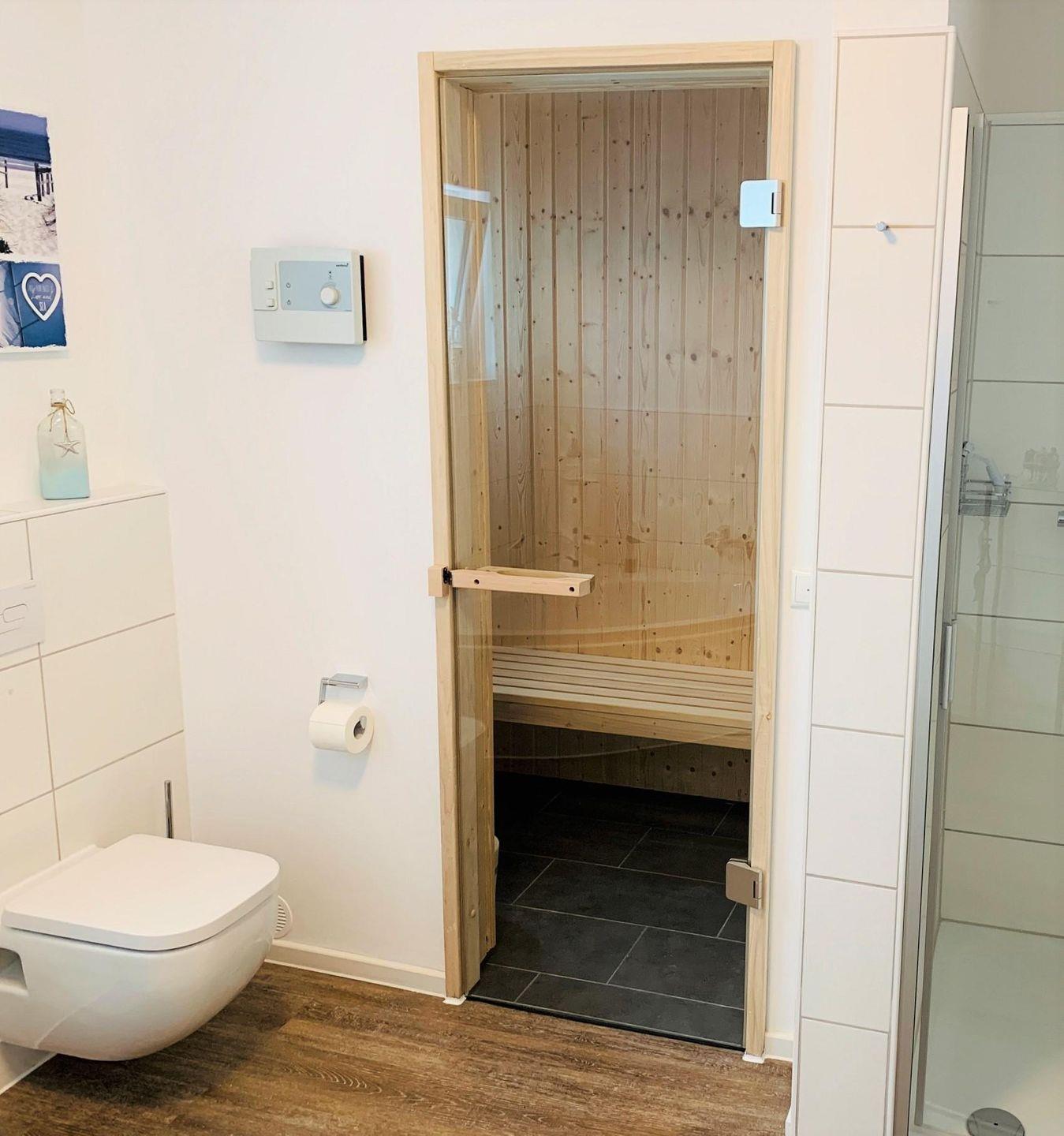 Eine Sauna mit Fenster, eine Regendusche und eine Badewanne bieten den nötigen Komfort zur Erholung.