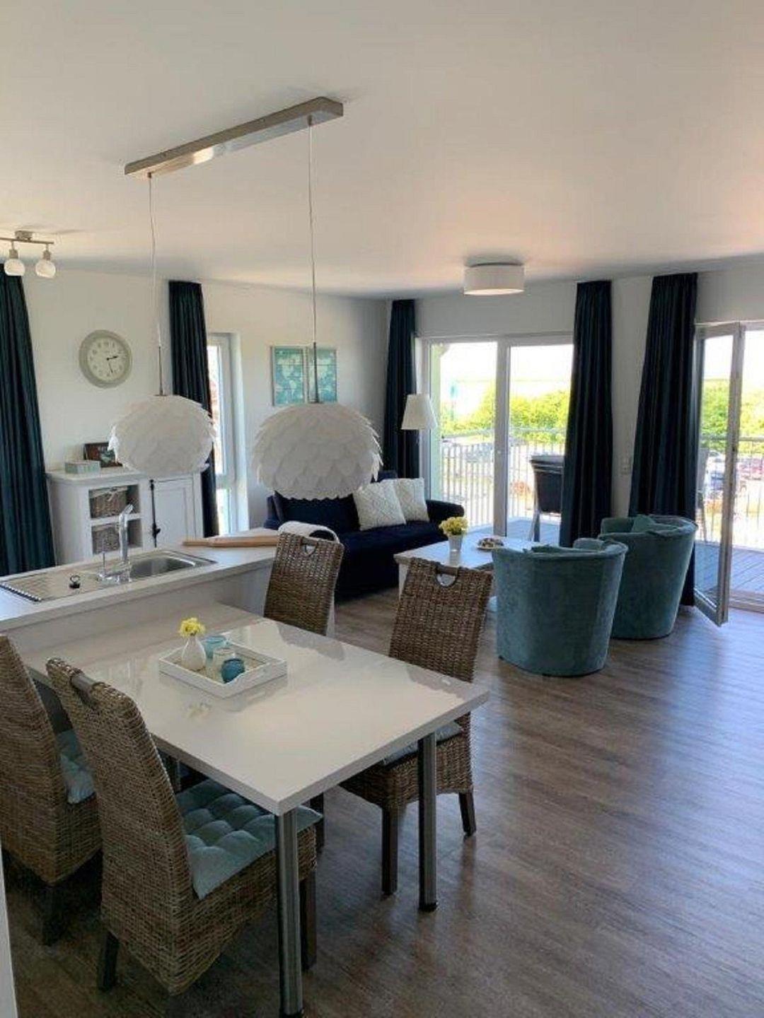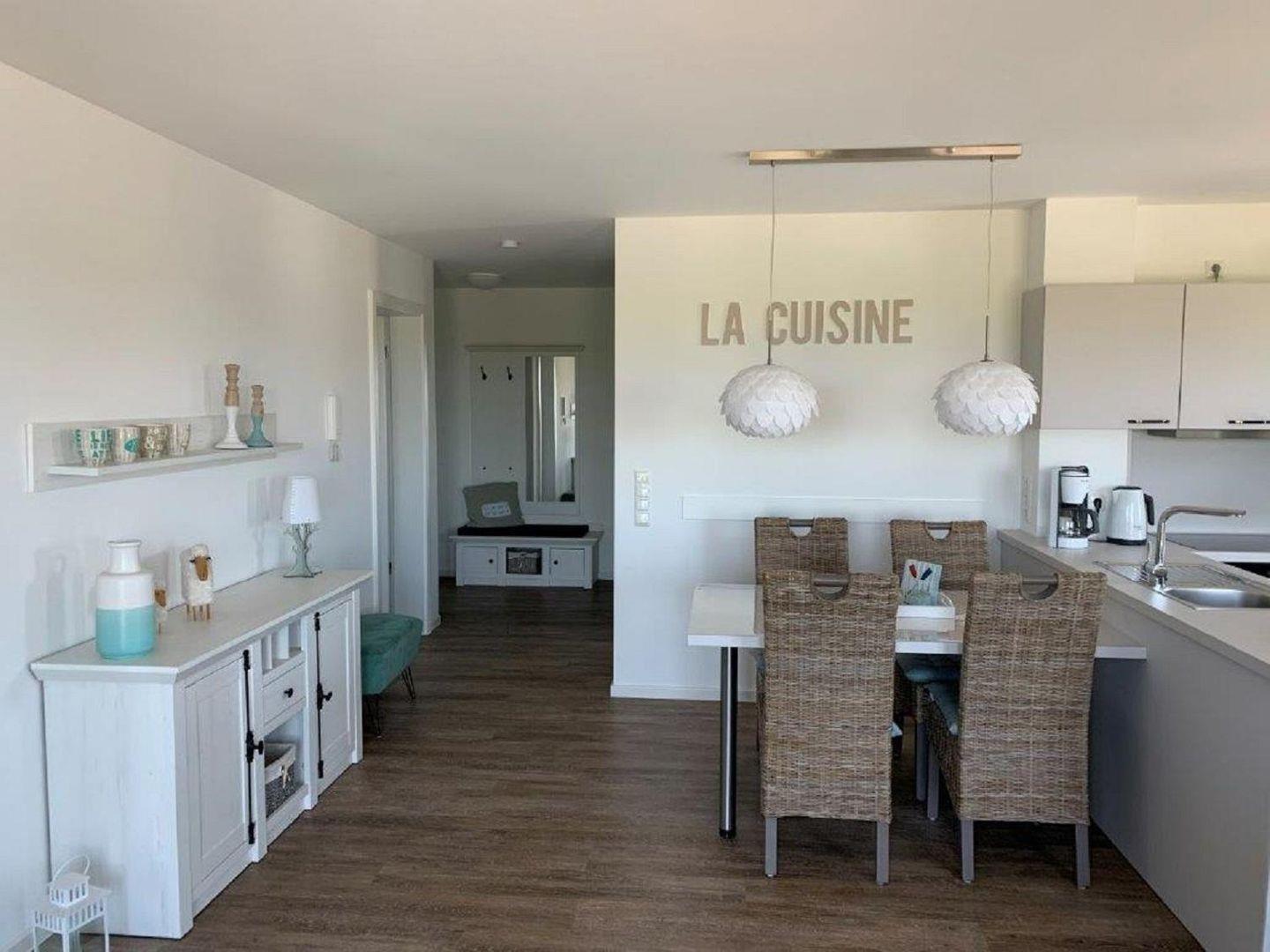 Ausgestattet mit einem Sofa, Couchtisch und zwei Sessel, besticht der Wohnbereich durch seine integrierte Küchenzeile und seinem großzügigen Esstisch mit vier Stühlen.