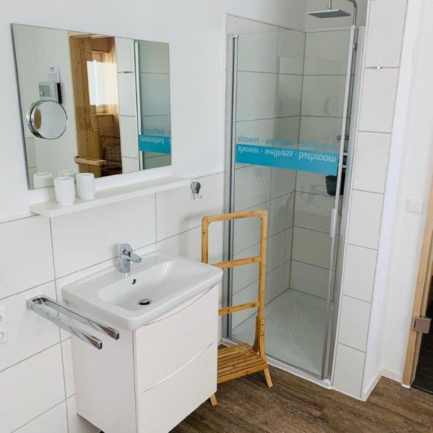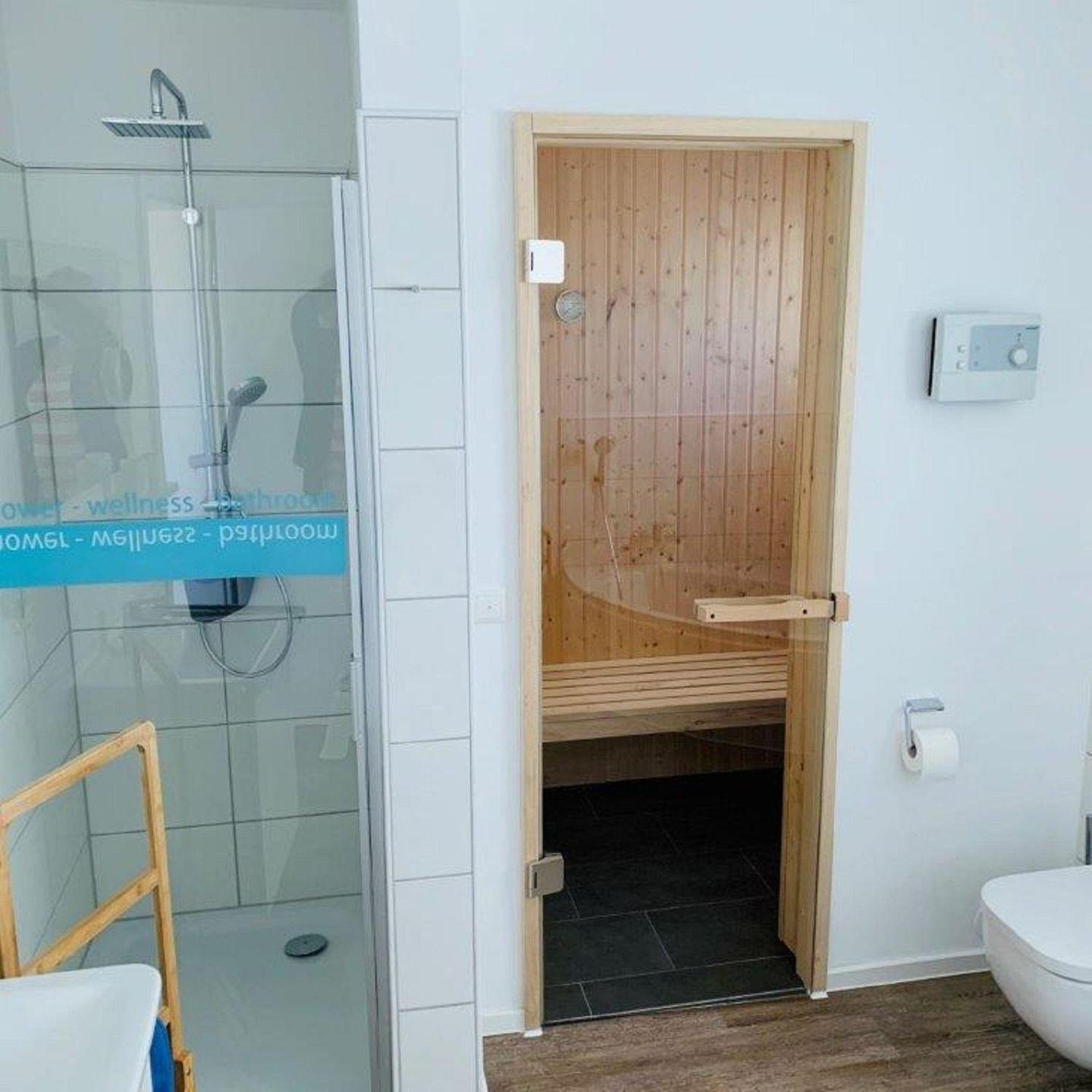 Eine Sauna, eine ebenerdige Dusche und eine Badewanne bieten den nötigen Komfort zur Erholung.