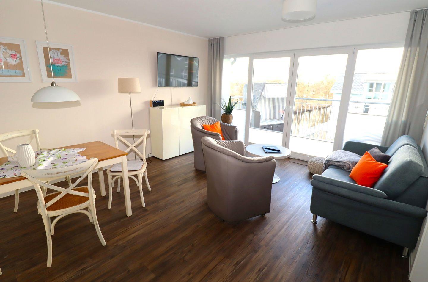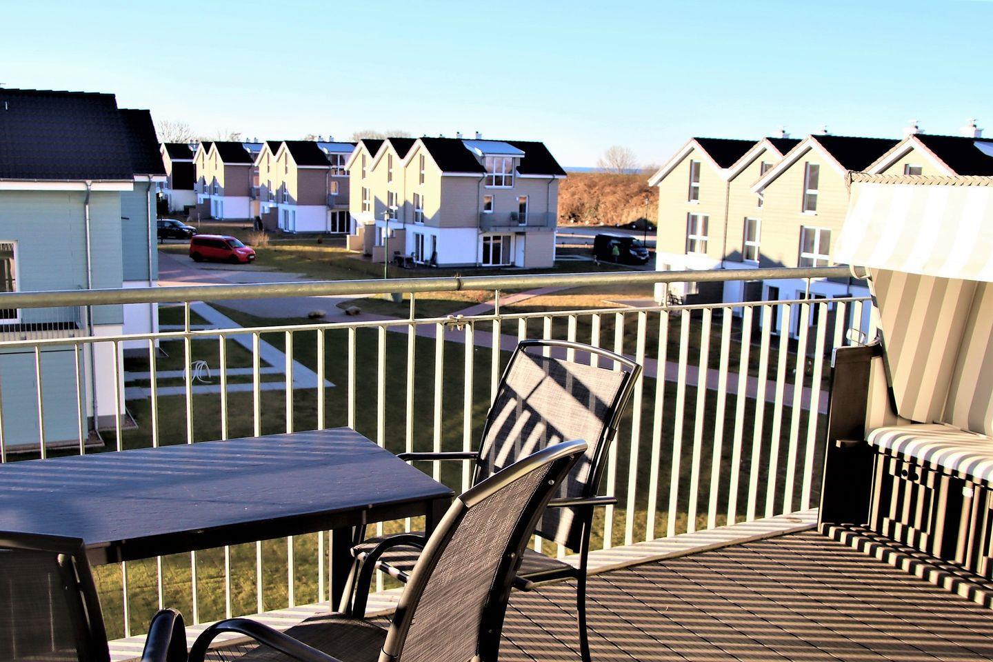 Eine großzügiger, möblierter und überdachter Balkon lädt zum Verweilen ein. Neben der Außenbestuhlung steht Ihnen hier auch ein Strandkorb zur Verfügung.