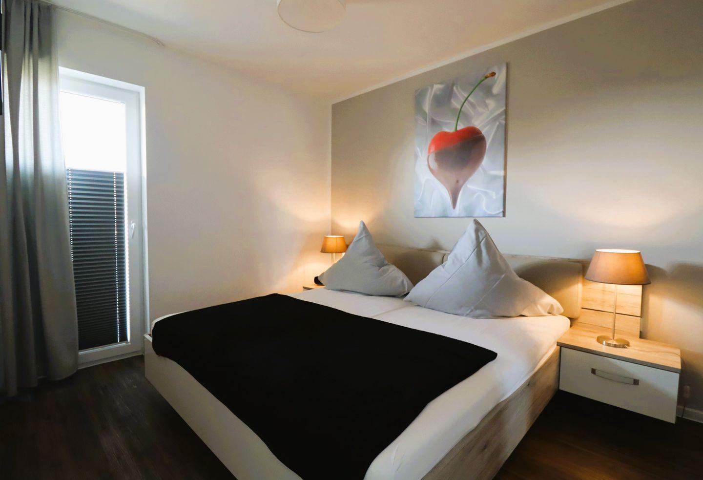Im Schlafzimmer steht Ihnen ein modernes Doppelbett mit Nachtkonsolen und ein Kleiderschrank zur Verfügung.
