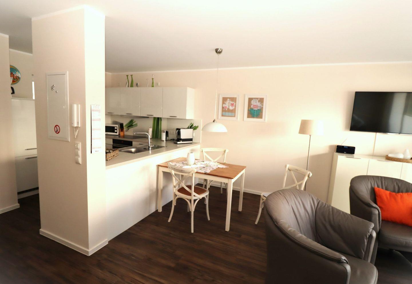 Der Küchenbereich ist modern offen zum Wohn-Essbereich gehalten und mit einer hochwertigen Einbauküche ausgestattet. Hierzu gehören Geschirr, Besteck, Gläser, Töpfe, Pfannen, Auflaufform, Stabmixer und ein Kaffeevollautomat (ganze Bohnen).