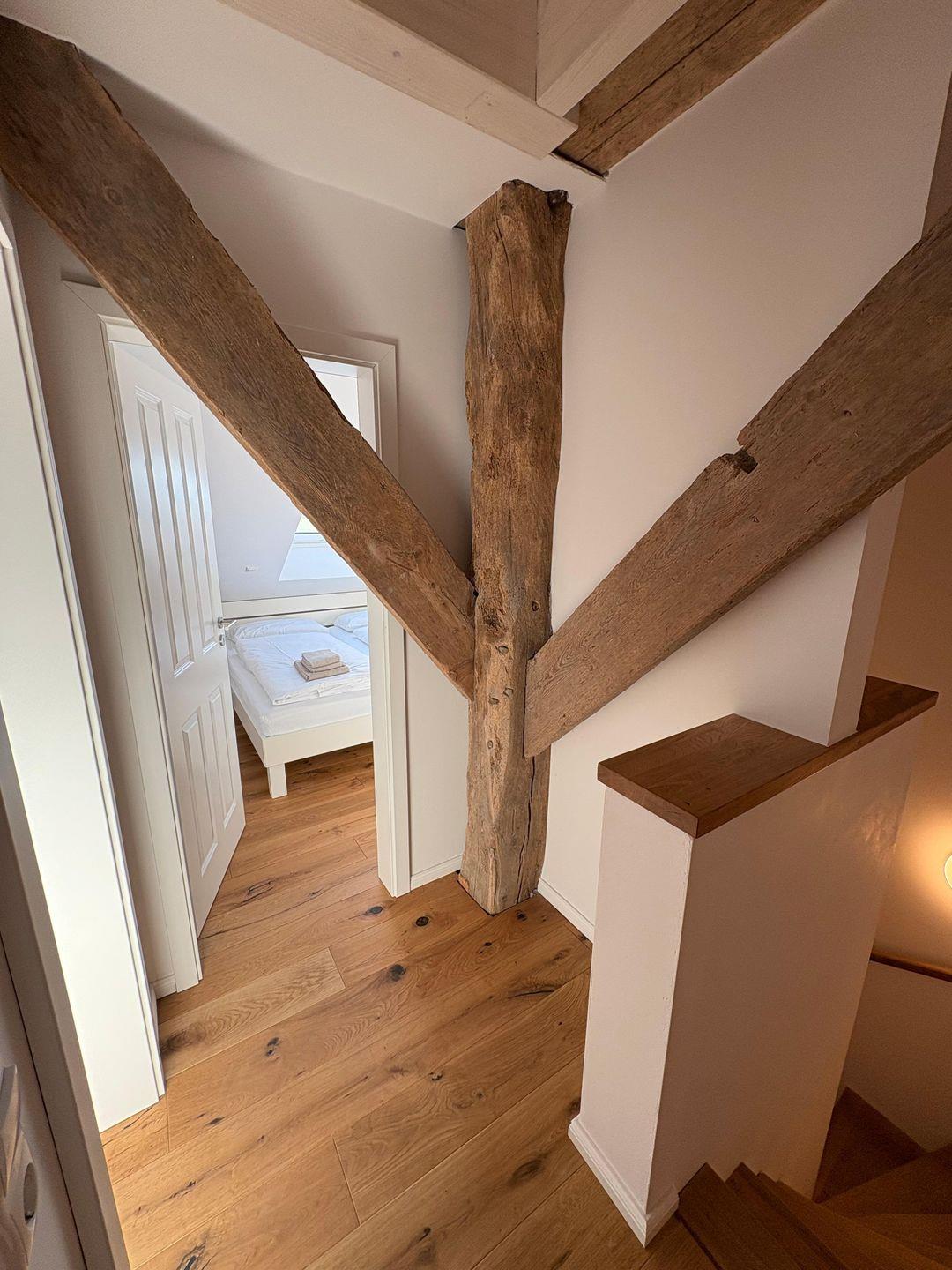 Die Unterkunft verfügt über insgesamt vier Zimmer, davon drei separate Schlafzimmer – ideal für Familien oder kleine Gruppen, die Wert auf Rückzugsmöglichkeiten legen. Für einen erholsamen Aufenthalt sorgt neben der modernen Zentralheizung eine angenehme Fußbodenheizung, und Parkettboden in Wohn- und Schlafzimmern schafft ein behagliches Wohnklima. Darüber hinaus steht ein Gäste-WC zusätzlich zum modernen Badezimmer mit bodengleicher Dusche zur Verfügung.