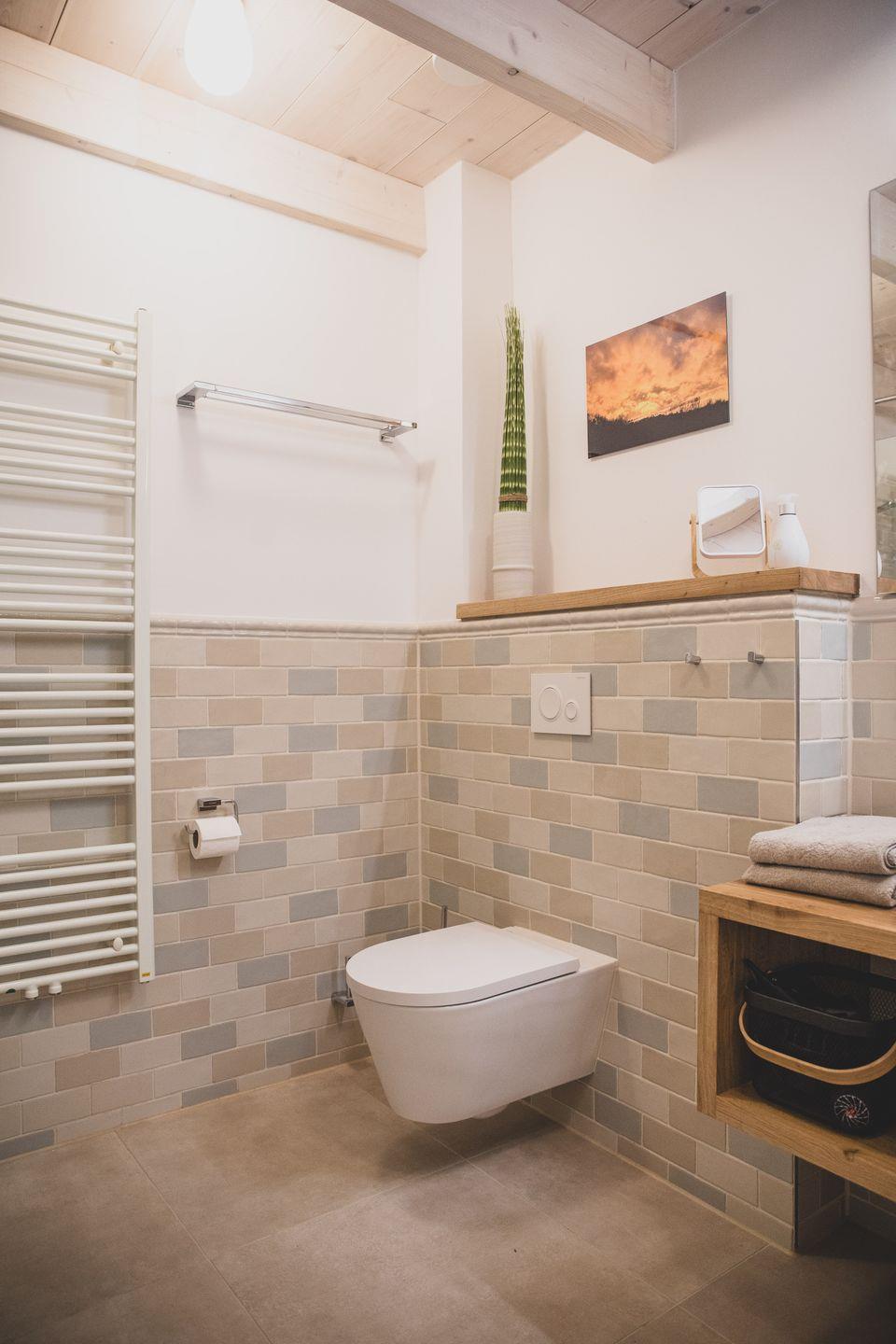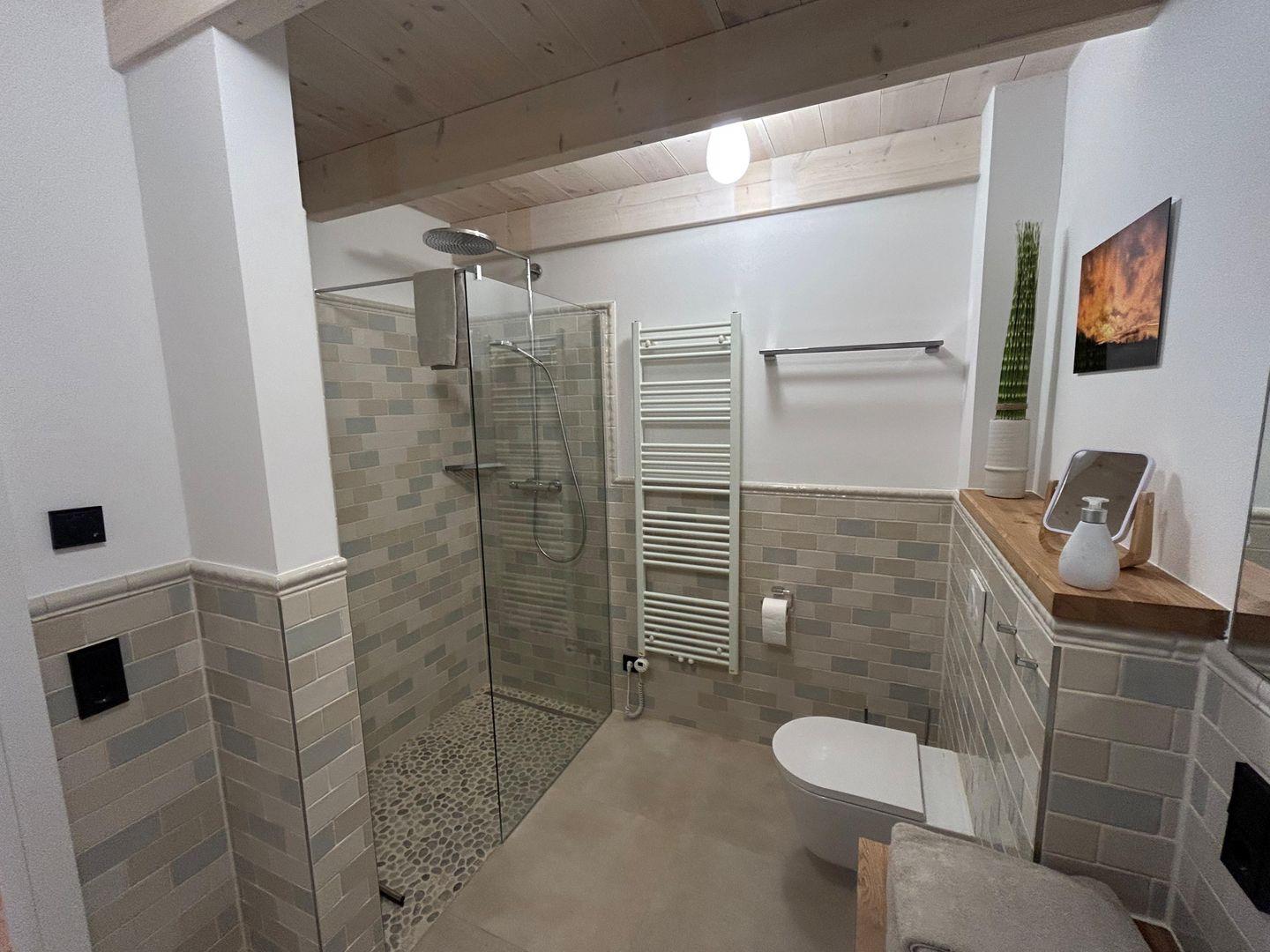 Sowohl im Erdgeschoss als auch im 1. Obergeschoss stehen geräumige Badezimmer mit Rain- Forest Dusche , WC und zusätzlicher Badewanne ím 1. OG zur Verfügung.