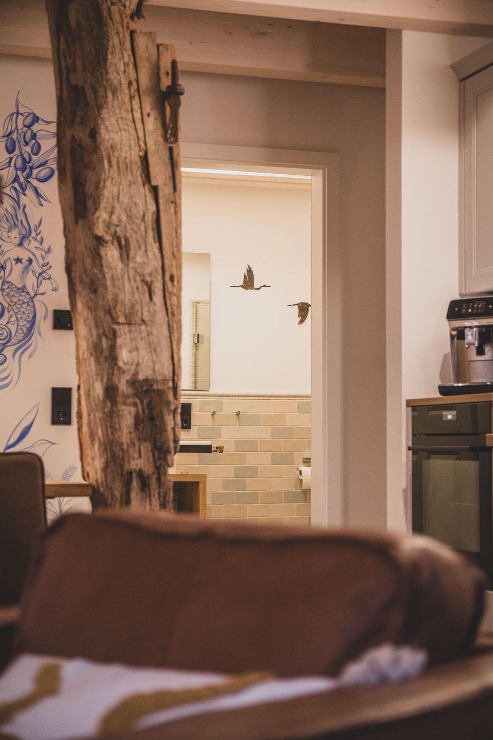 Außerdem befindet sich im Erdgeschoss noch ein kleines Zimmer welches sowohl als Arbeitsbereich aber auch als zusätzliches Schlafzimmer (Schlafsofa mit vollwertiger Matratze 200 x 140 cm) genutzt werden kann. Der Erdgeschossbereich sowie dieses Schlafzimmer und das Bad im Erdgeschoss sind barrierefrei gestaltet. Zum Eingang der Wohnung führt nur eine Stufe. Eine mobile, klappbare Rollstuhlrampe gehört zur Ausstattung der Ferienwohnung.