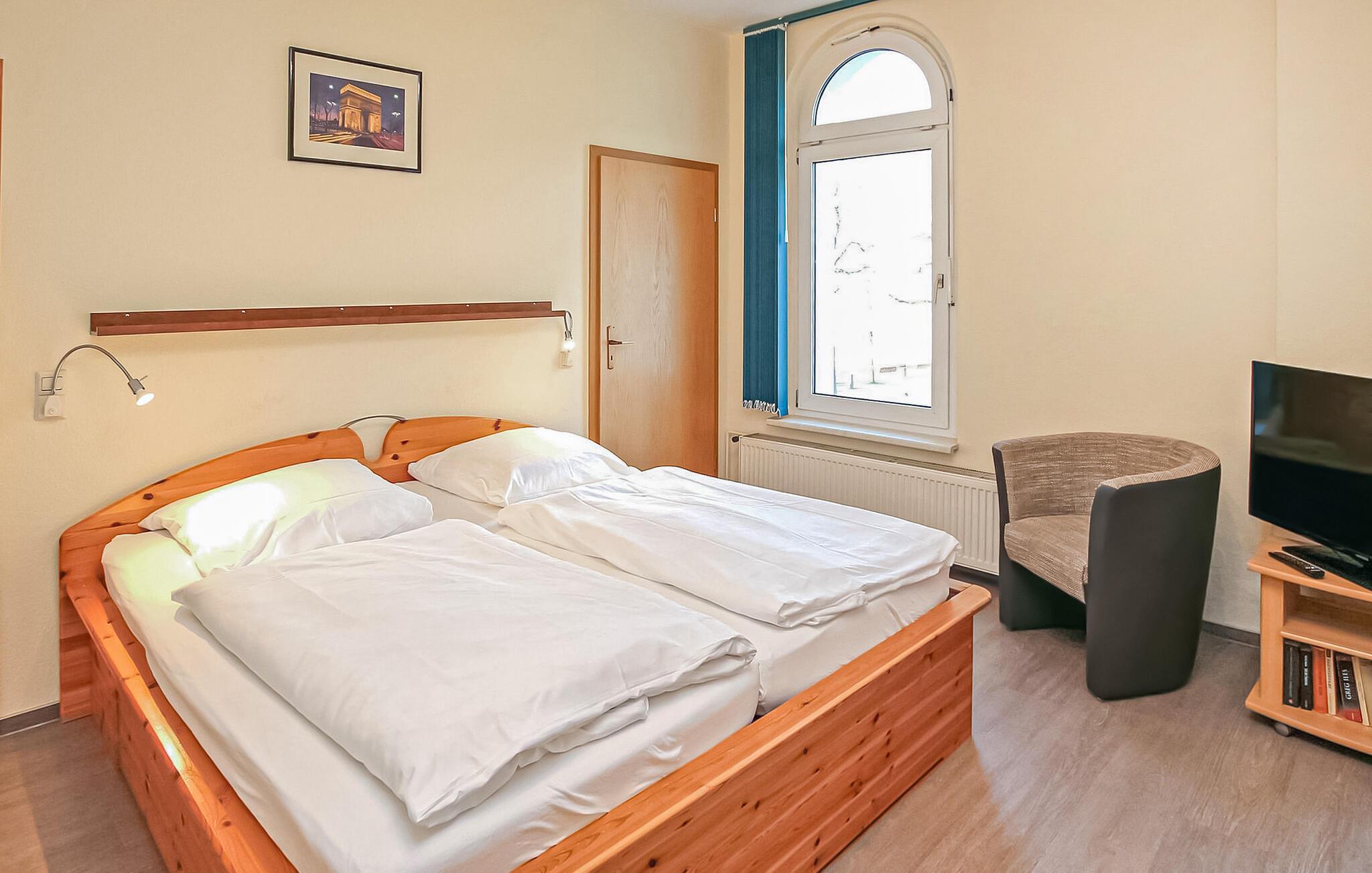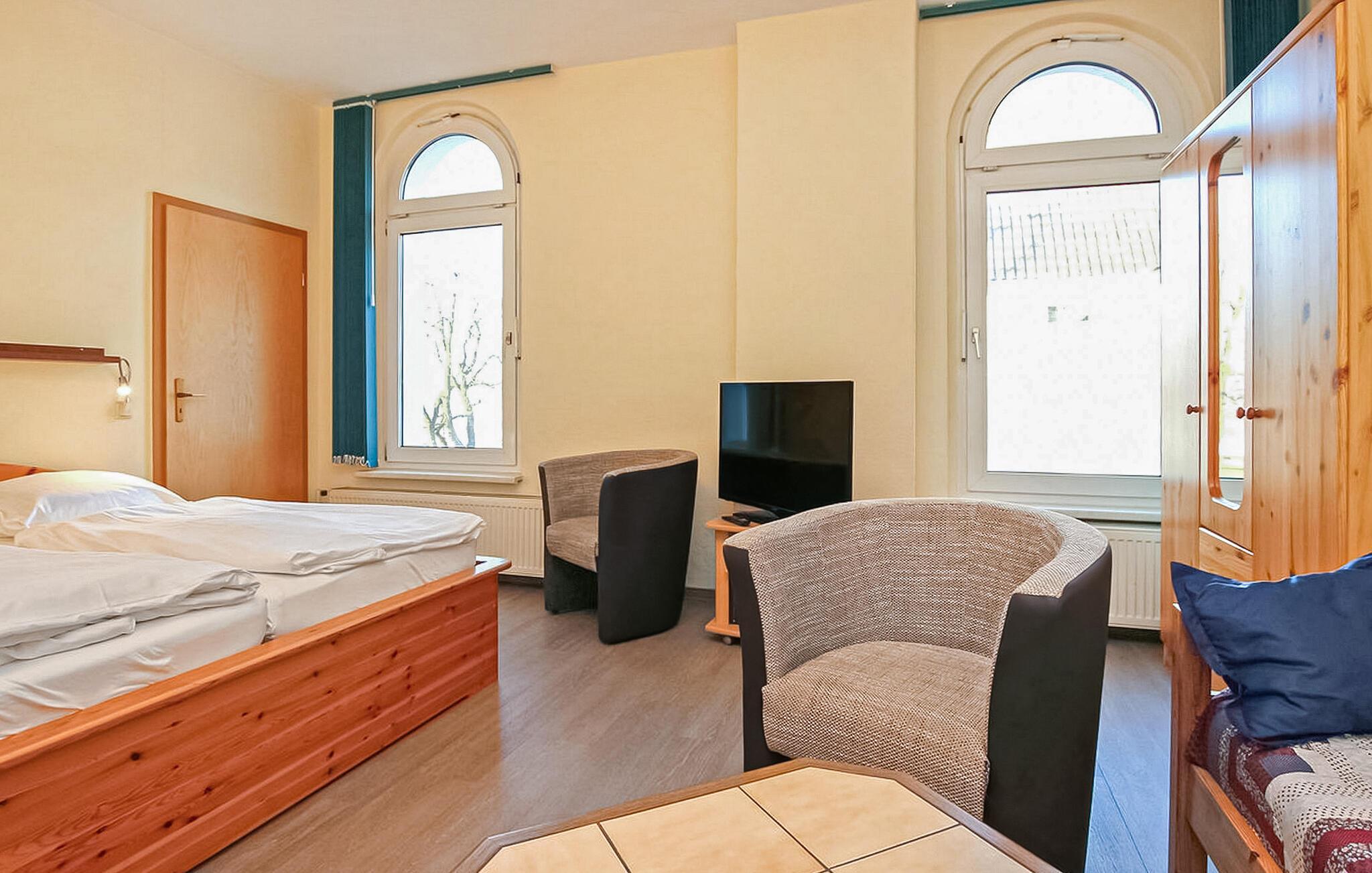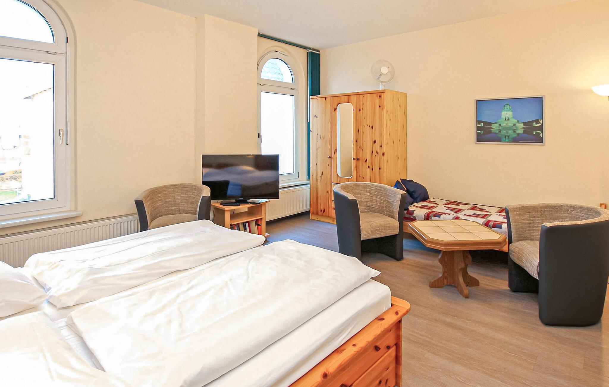 I utkanten av den gamla staden Waren (Müritz), centralt men ändå lugnt beläget, bara några steg från Müritz inland, finns det totalt tre semesterlägenheter för upp till tre eller fem personer i en kärleksfullt renoverad stadsvilla. Hamnen med båt- och fartygsförtöjningar, badstrand, restauranger, shoppingmöjligheter och naturupplevelsecentret Müritzeum ligger alla inom gångavstånd. Den ca 35 kvm stora uppvärmda lägenheten är utrustad för upp till 2 vuxna och 1 barn (max 17 år) med ett kombinerat vardagsrum/sovrum (sittgrupp med fåtöljer, platt-TV, 1 dubbelsäng, 1 enkelsäng), ett minikök (elspis, miniugn, kylskåp med frysfack, matplats, diverse köksutrustning) och ett badrum (dusch, WC, hårtork). Härifrån har man utsikt över Müritz från sidan. Trädgårdsmöbler, en gräsmatta för solbad med solstolar och en grillplats är tillgängliga för alla gäster på fastigheten. Rökfri spis, cykelförråd (låsbar, på fastigheten), en parkeringsplats per lägenhet (extra mot en avgift) och gratis WLAN finns tillgängliga. I det totala priset ingår slutstädning, sänglinne, handdukar, vatten- och energiförbrukning. (Ta med eget sänglinne för spädbarn.) Betalas på plats: Besöksskatt, parkeringsplats 5 EUR/dag i förekommande fall.